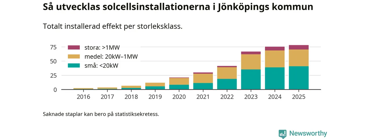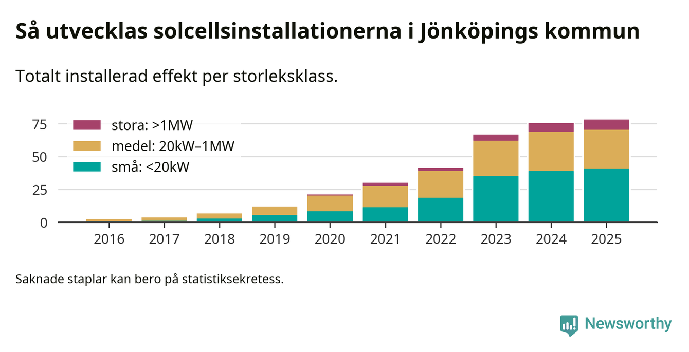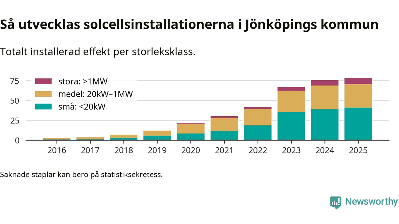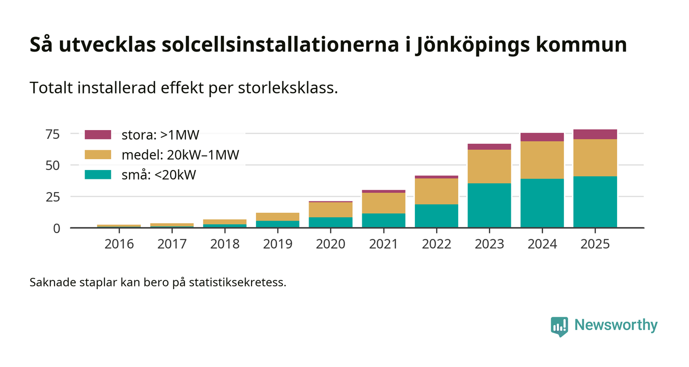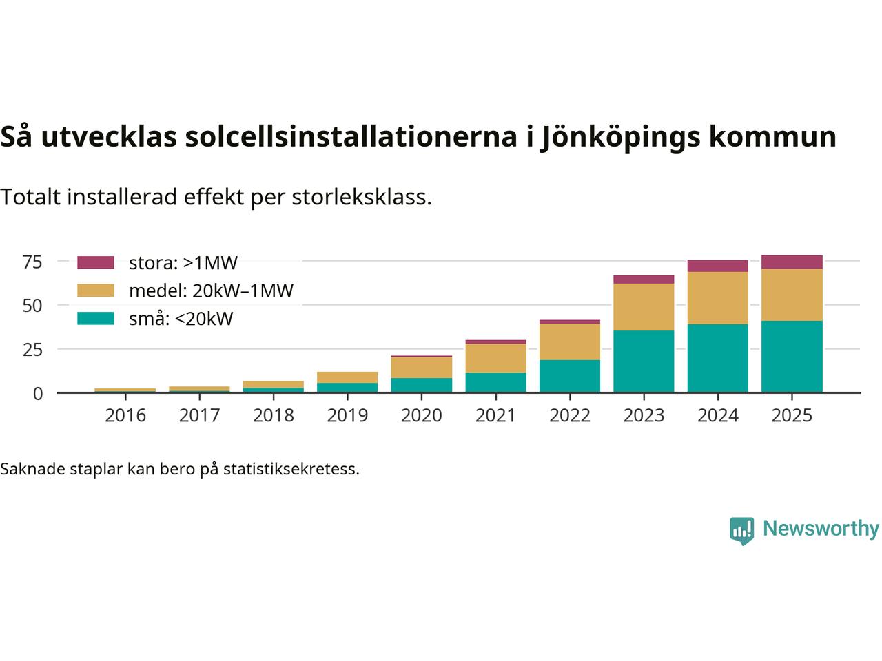 Den största delen av solelen i Jönköping, 52 procent, kommer från småskaliga anläggningar, totalt 3 726 stycken. Det påminner om hur det ser ut i riket som helhet. I hela Sverige står anläggningar under 20 kilowatt för mer än hälften av den installerade effekten. Generellt är deras andel störst i kommuner med många villahushåll, medan större anläggningar dominerar i tätbefolkade kommuner med fler flerfamiljsbostäder – och förstås i de småkommuner som har någon av landets stora markanläggningar för solel.