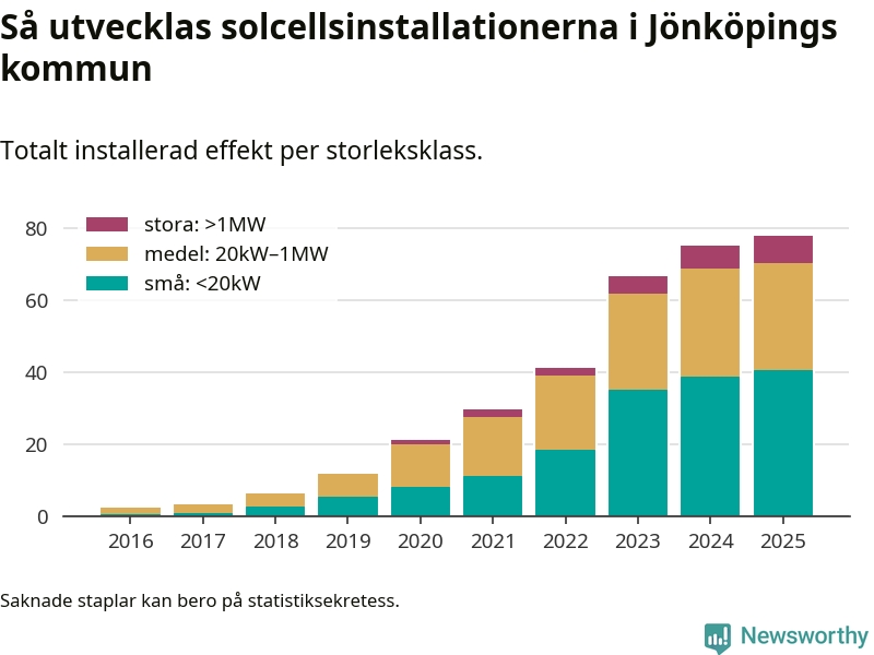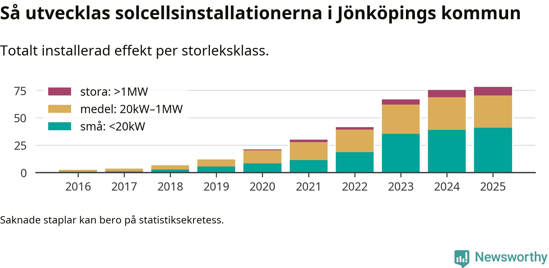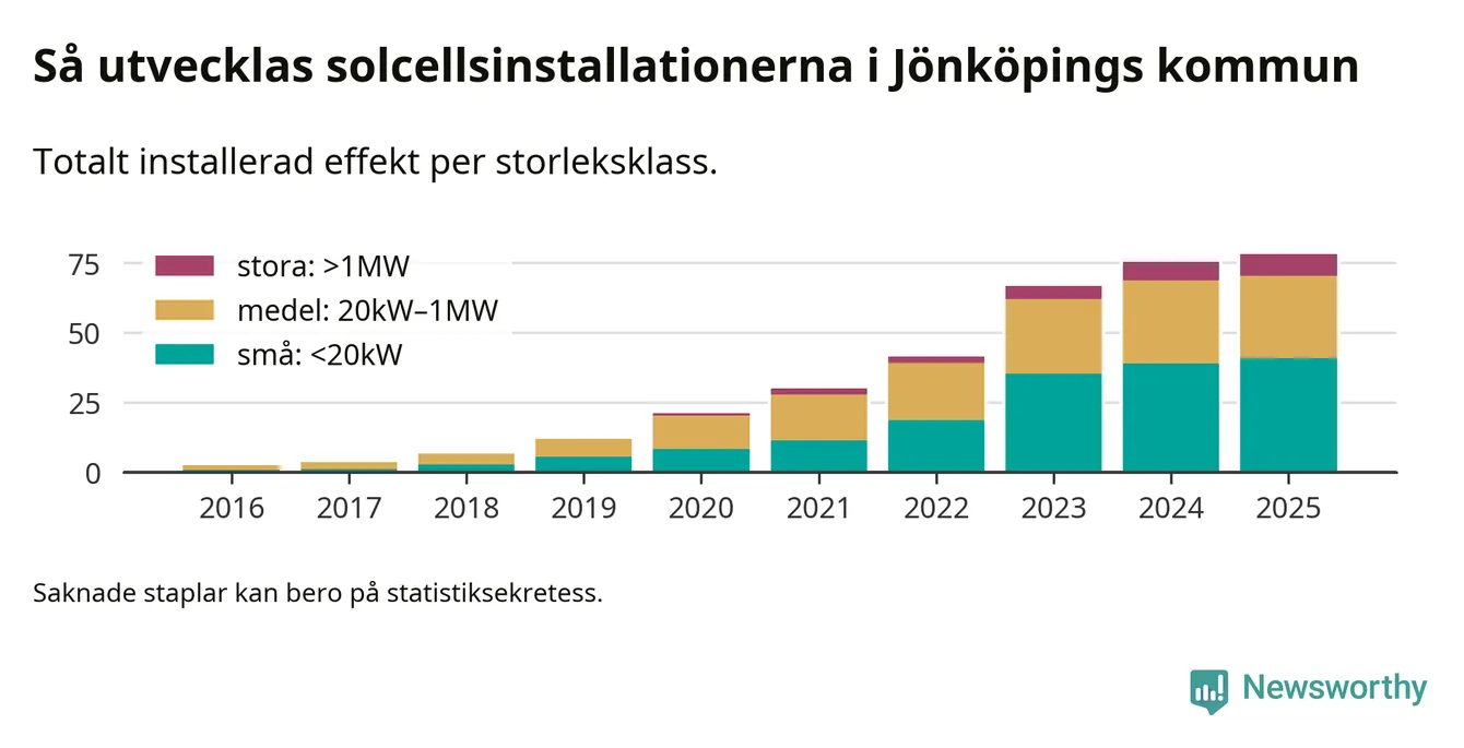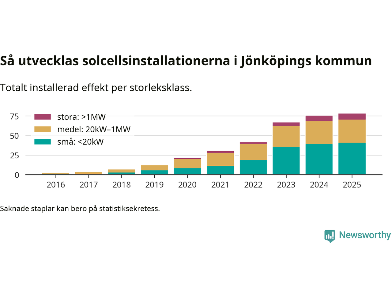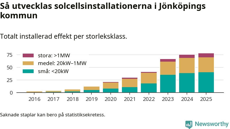 Den största delen av solelen i Jönköping, 52 procent, kommer från småskaliga anläggningar, totalt 3 726 stycken. Det påminner om hur det ser ut i riket som helhet. I hela Sverige står anläggningar under 20 kilowatt för mer än hälften av den installerade effekten. Generellt är deras andel störst i kommuner med många villahushåll, medan större anläggningar dominerar i tätbefolkade kommuner med fler flerfamiljsbostäder – och förstås i de småkommuner som har någon av landets stora markanläggningar för solel.