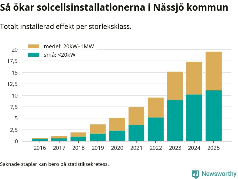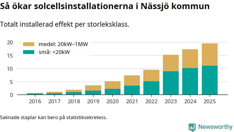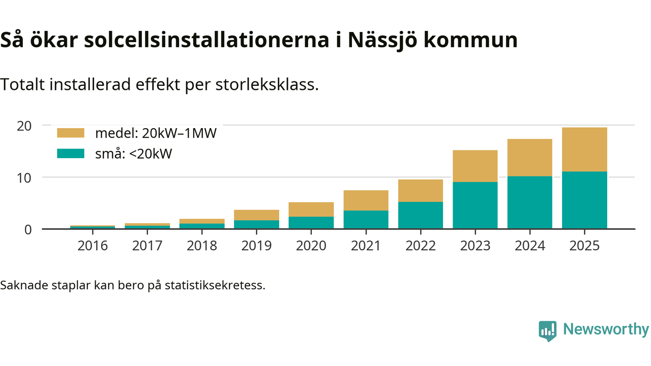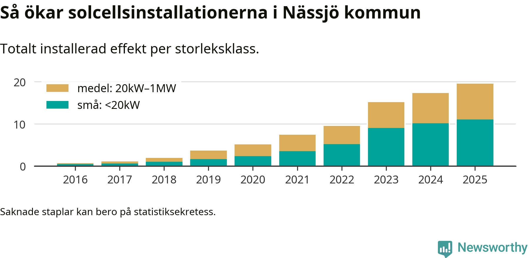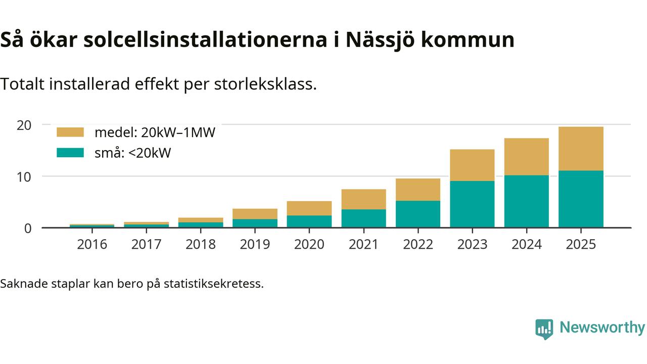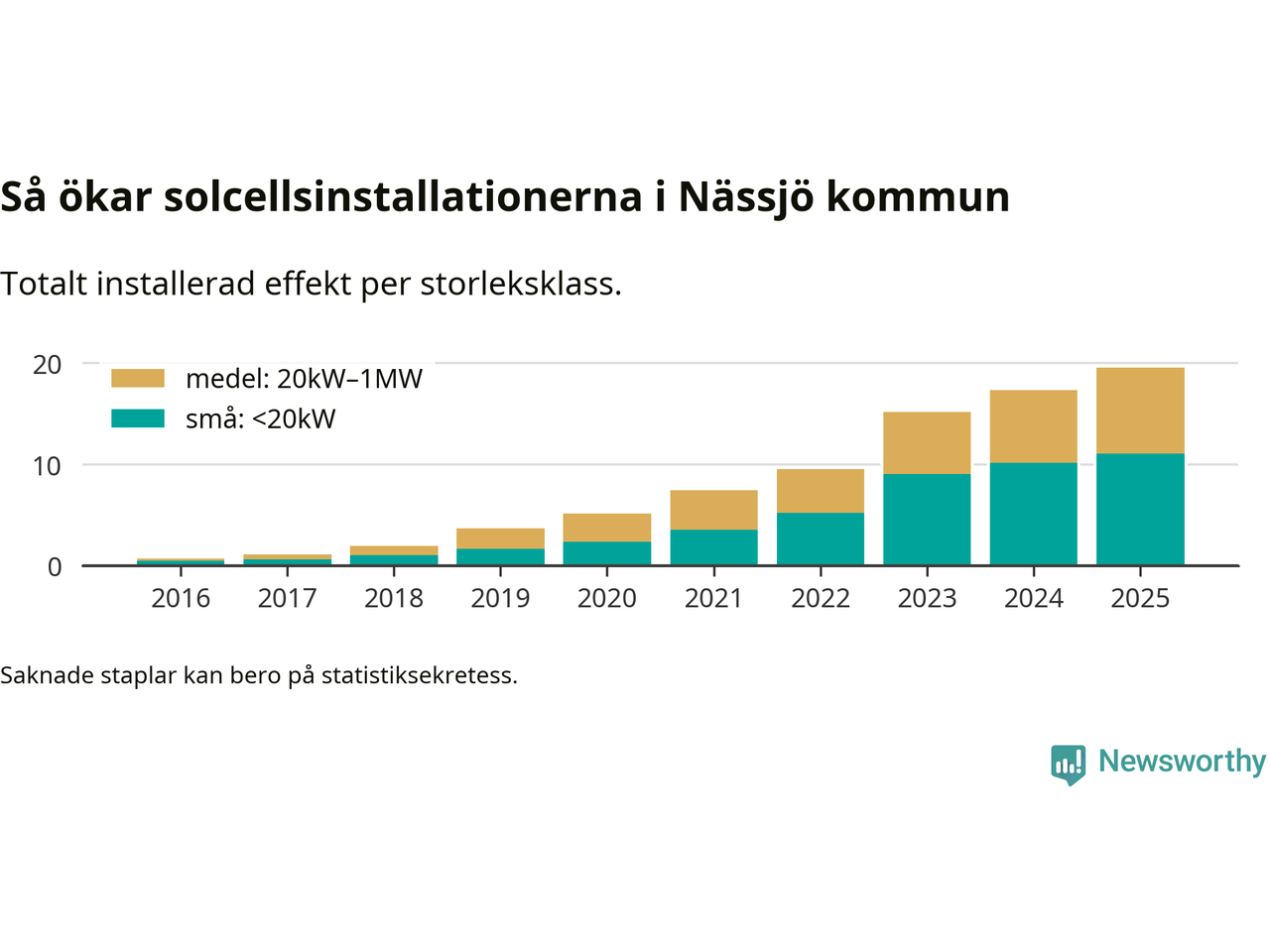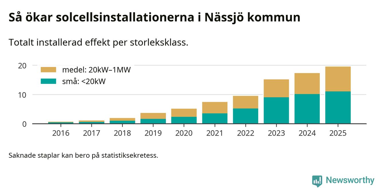 Den största delen av solelen i Nässjö, 57 procent, kommer från småskaliga anläggningar, totalt 1 025 stycken. Det påminner om hur det ser ut i riket som helhet. I hela Sverige står anläggningar under 20 kilowatt för mer än hälften av den installerade effekten. Generellt är deras andel störst i kommuner med många villahushåll, medan större anläggningar dominerar i tätbefolkade kommuner med fler flerfamiljsbostäder – och förstås i de småkommuner som har någon av landets stora markanläggningar för solel.