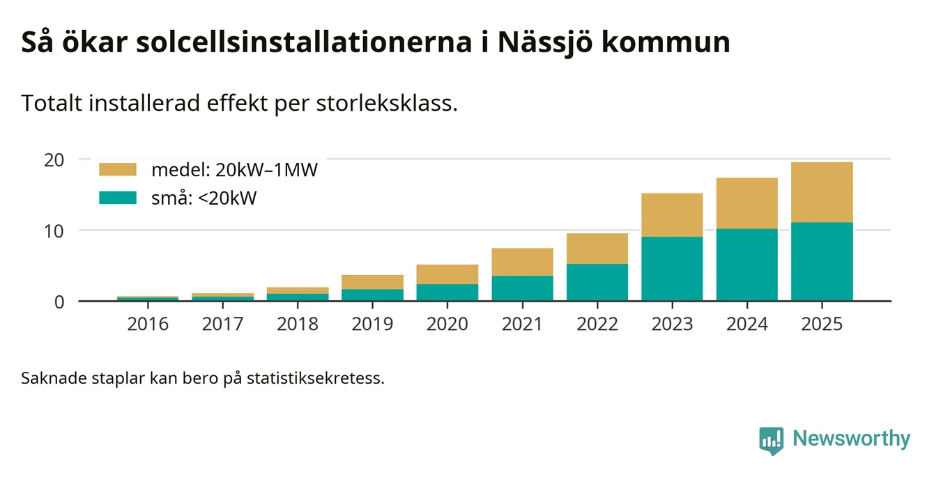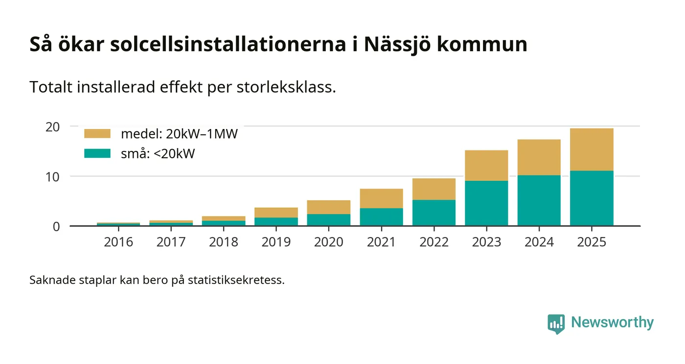 Under 2025 anslöts 2,2 megawatt ny solel till elnätet i Nässjö kommun, en ökning med 13 procent jämfört med året innan.
