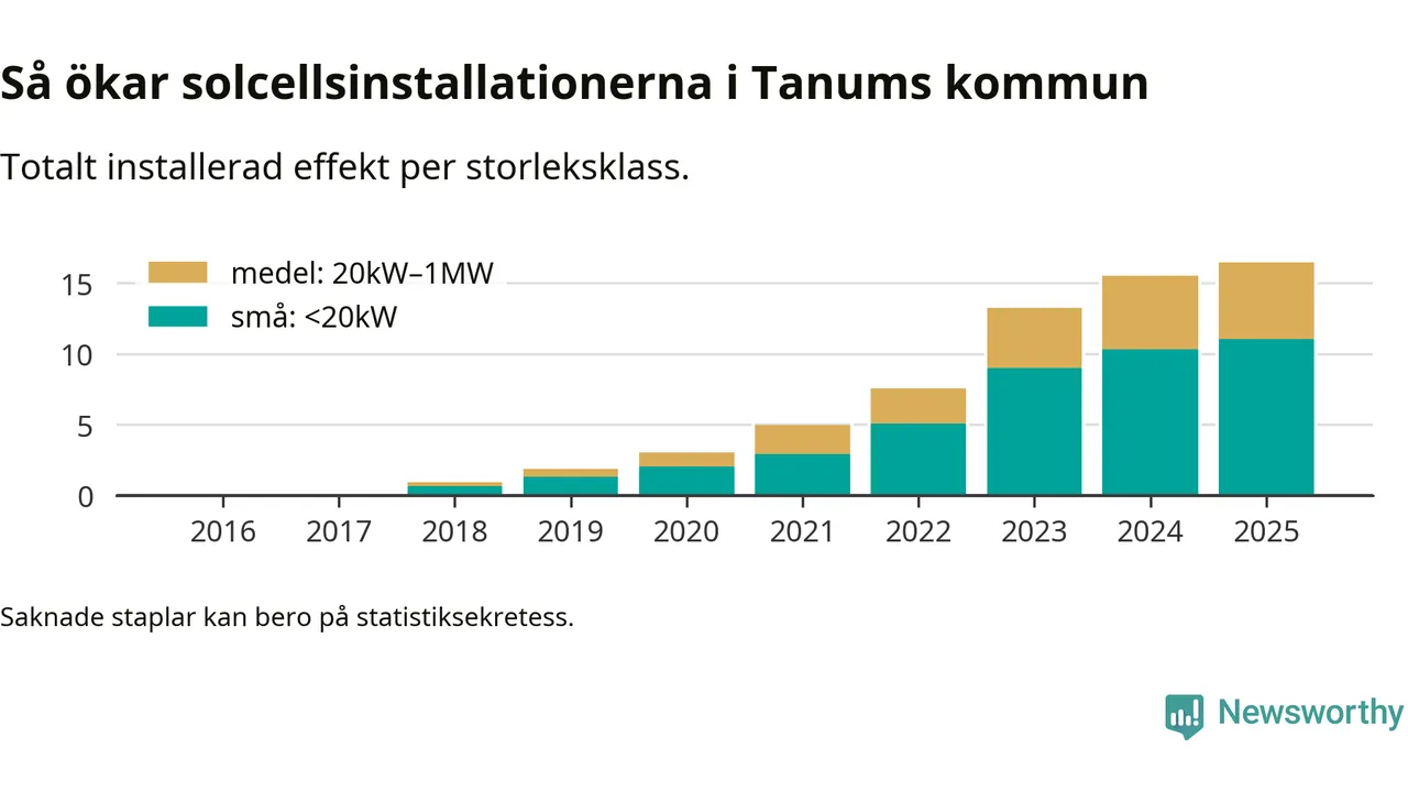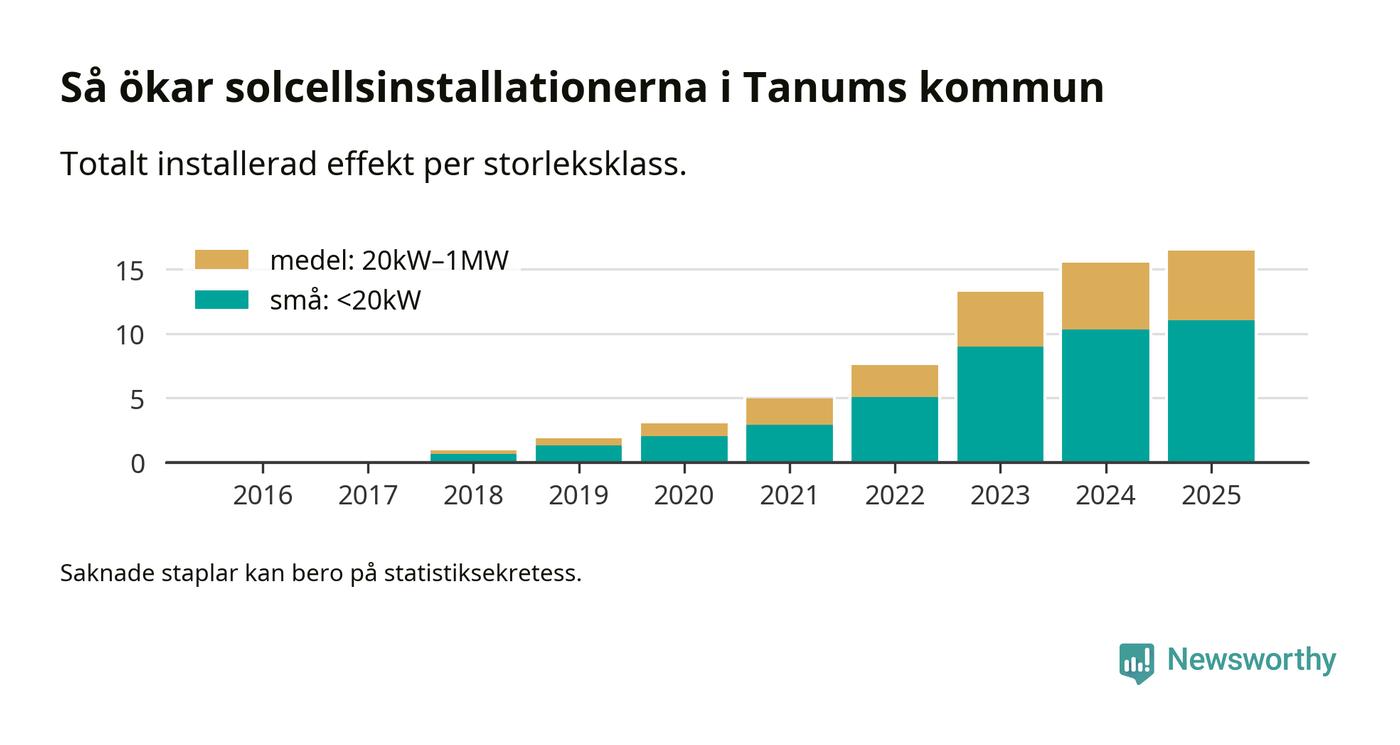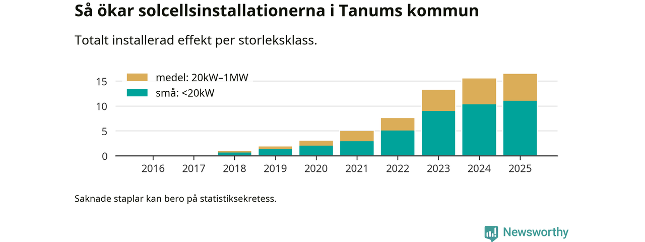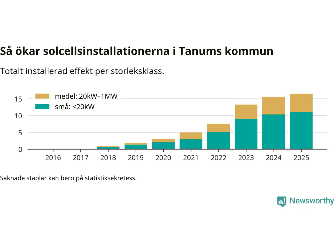 Under 2025 anslöts 0,9 megawatt ny solel till elnätet i Tanums kommun, en ökning med 6 procent jämfört med året innan.