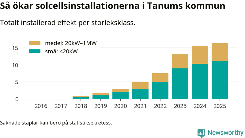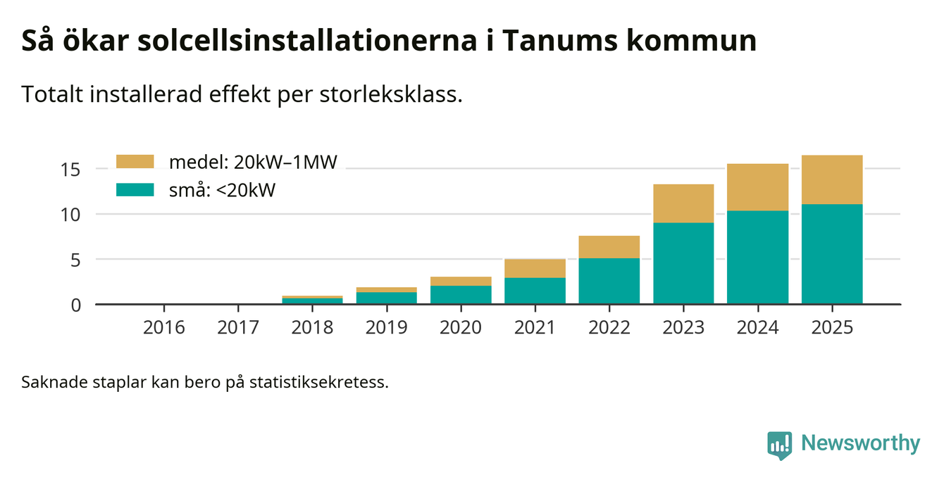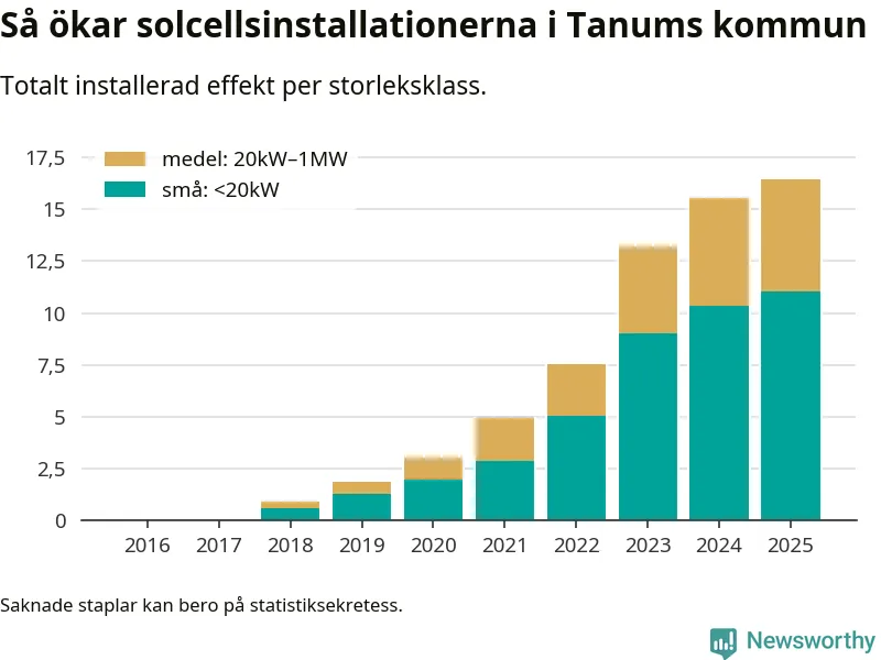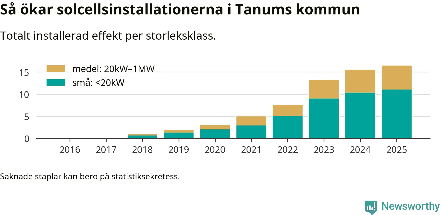 Under 2025 anslöts 0,9 megawatt ny solel till elnätet i Tanums kommun, en ökning med 6 procent jämfört med året innan.