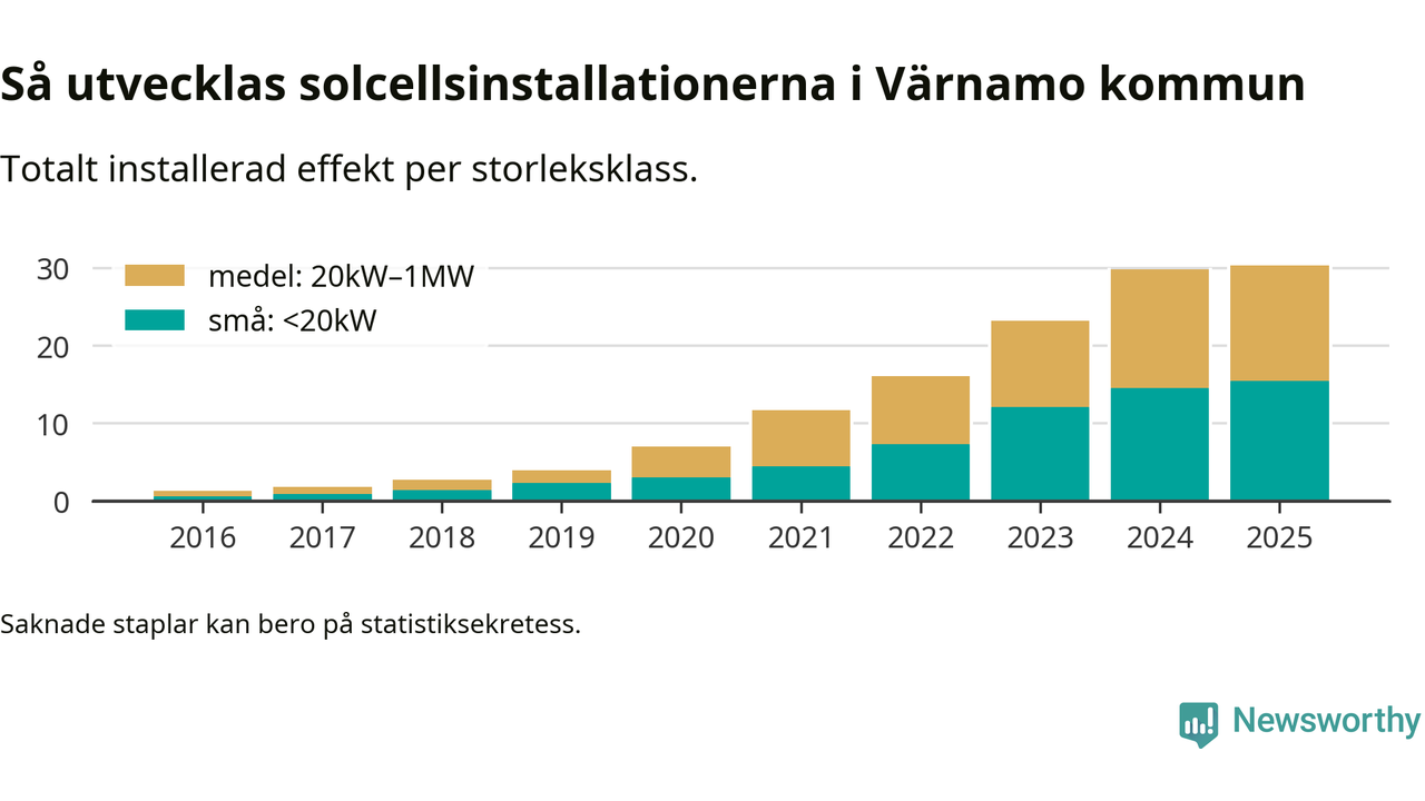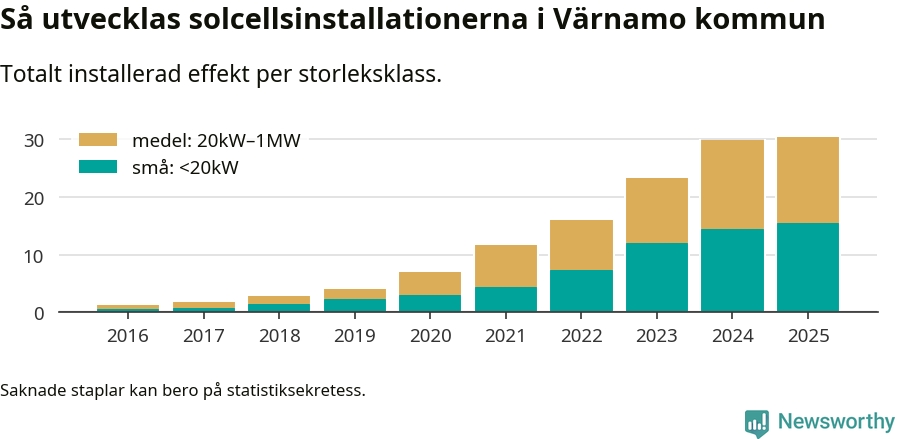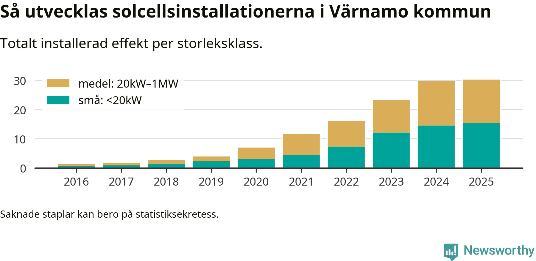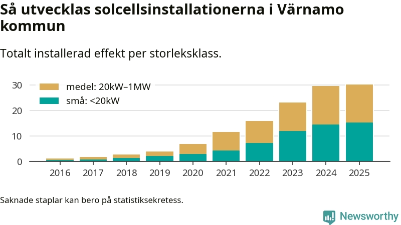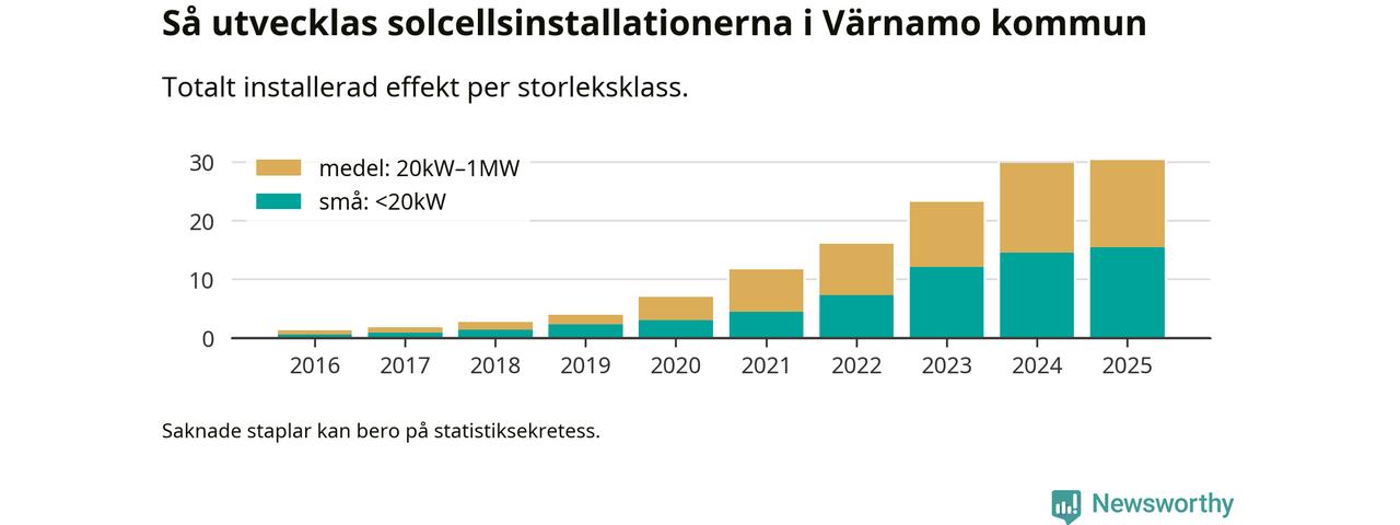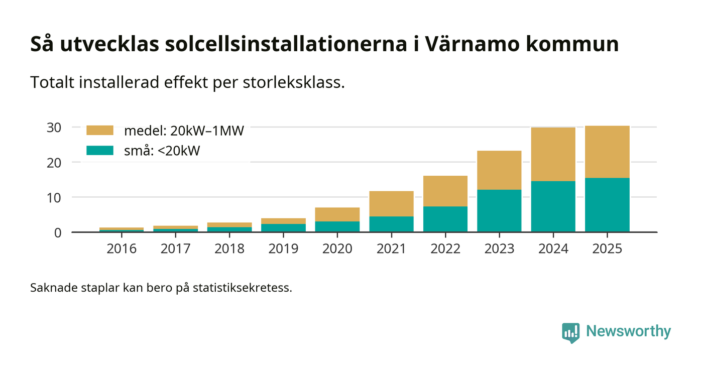 Den största delen av solelen i Värnamo, 51 procent, kommer från småskaliga anläggningar, totalt 1 378 stycken. Det påminner om hur det ser ut i riket som helhet. I hela Sverige står anläggningar under 20 kilowatt för mer än hälften av den installerade effekten. Generellt är deras andel störst i kommuner med många villahushåll, medan större anläggningar dominerar i tätbefolkade kommuner med fler flerfamiljsbostäder – och förstås i de småkommuner som har någon av landets stora markanläggningar för solel.