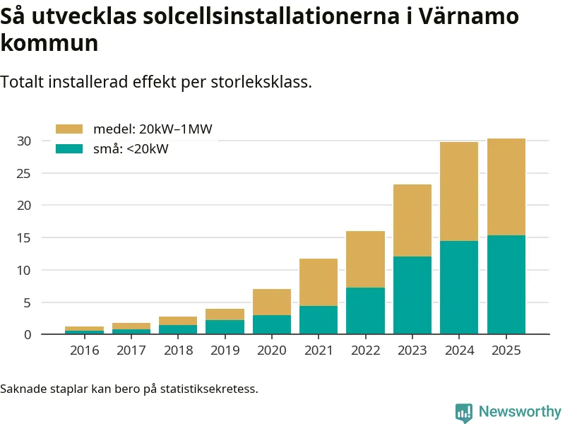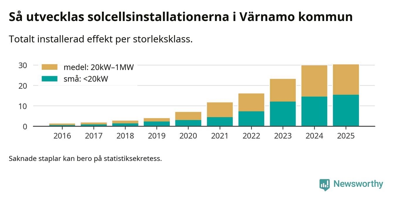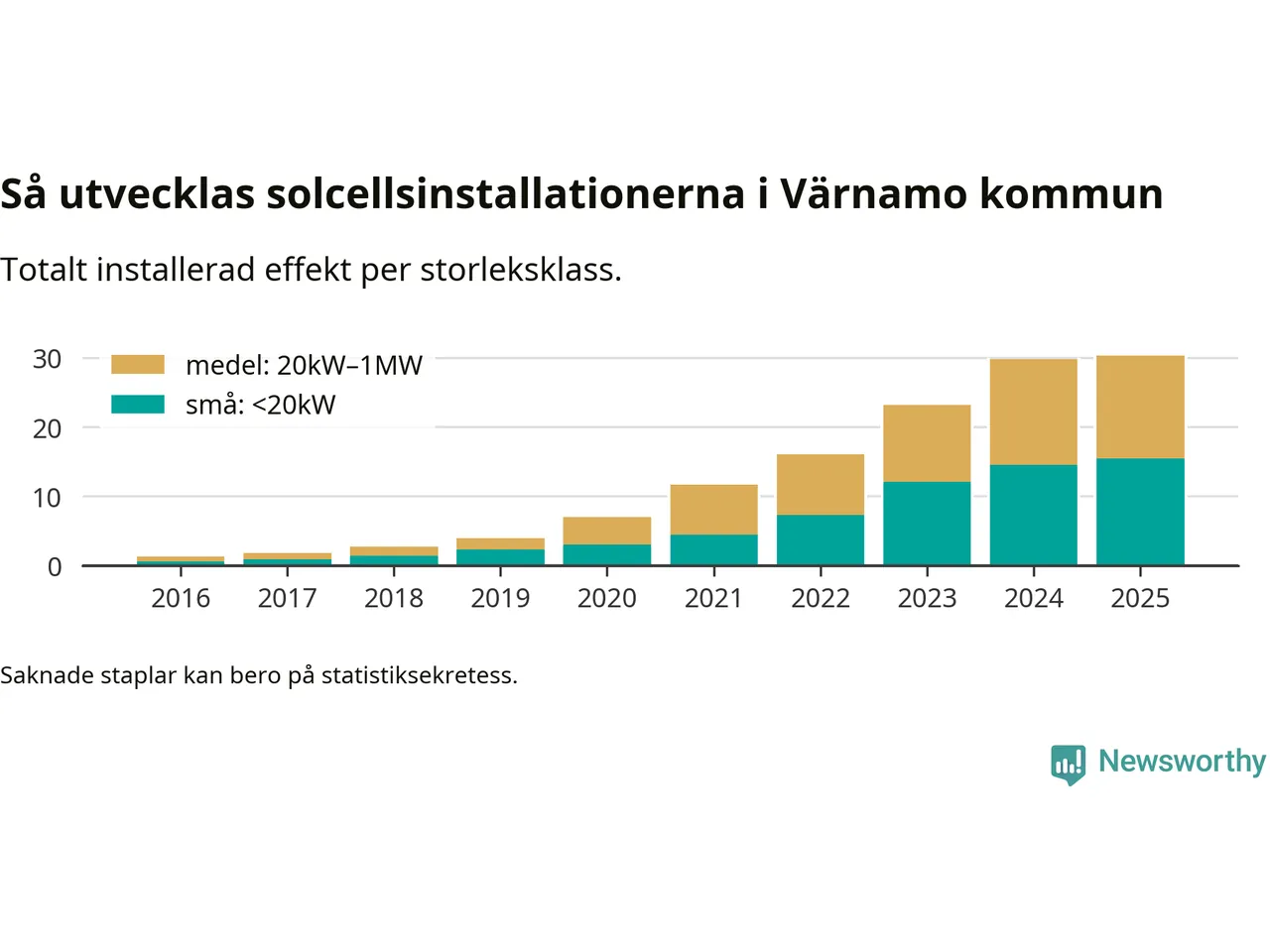 Under 2025 anslöts 0,5 megawatt ny solel till elnätet i Värnamo kommun, en ökning med 2 procent jämfört med året innan.