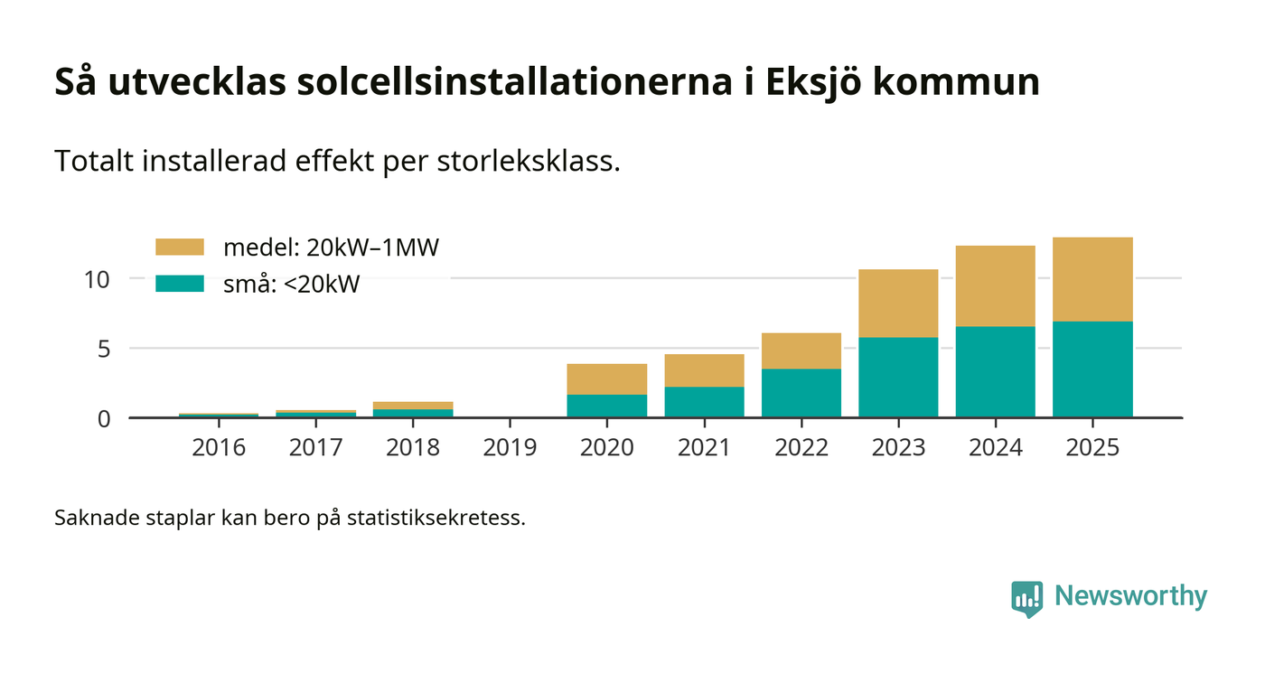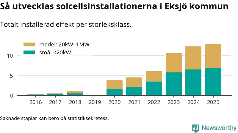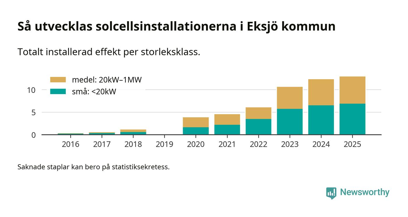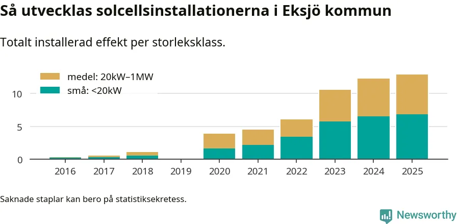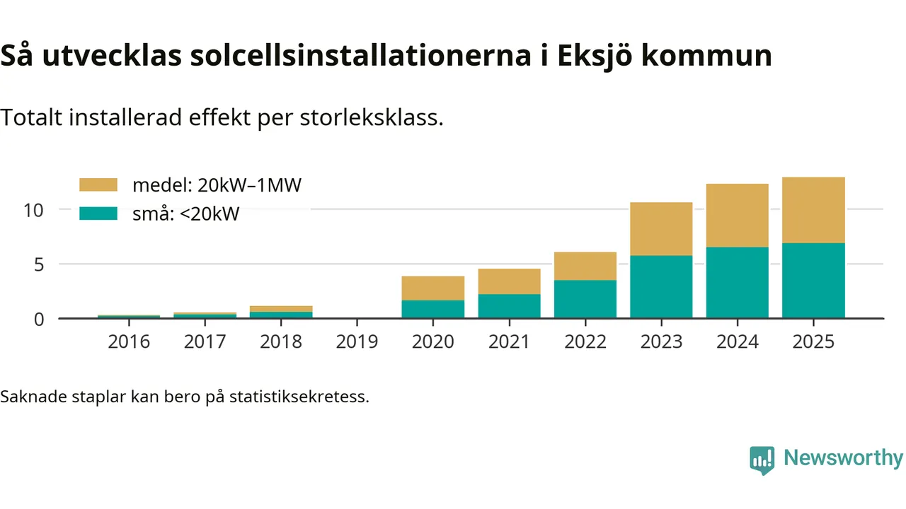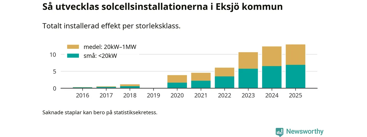 Under 2025 anslöts 0,6 megawatt ny solel till elnätet i Eksjö kommun, en ökning med 5 procent jämfört med året innan.