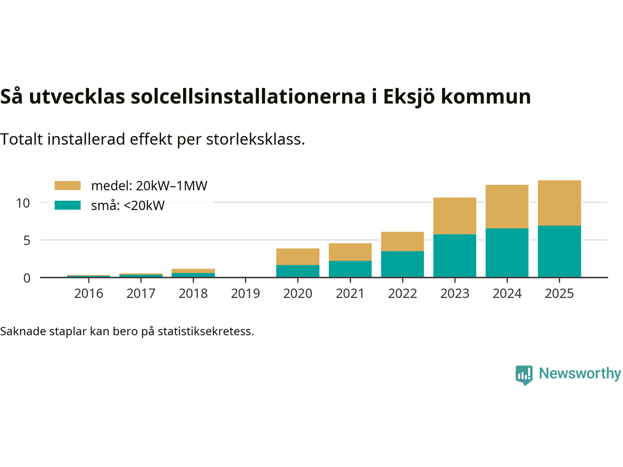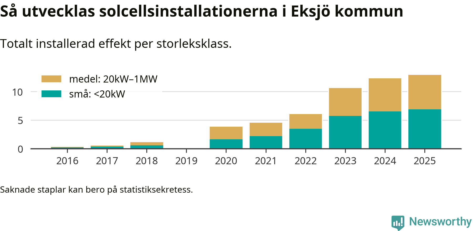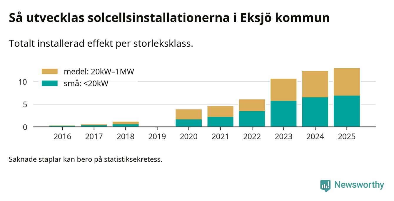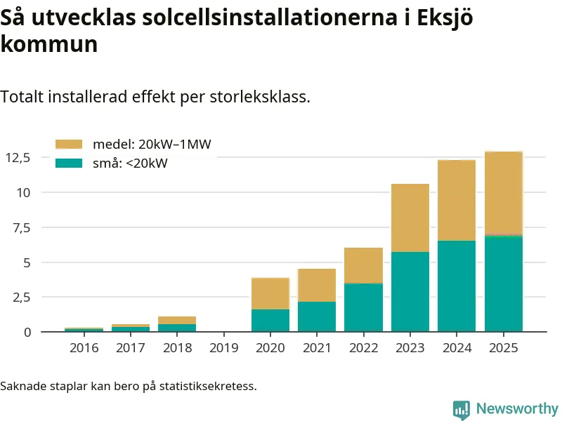 Under 2025 anslöts 0,6 megawatt ny solel till elnätet i Eksjö kommun, en ökning med 5 procent jämfört med året innan.