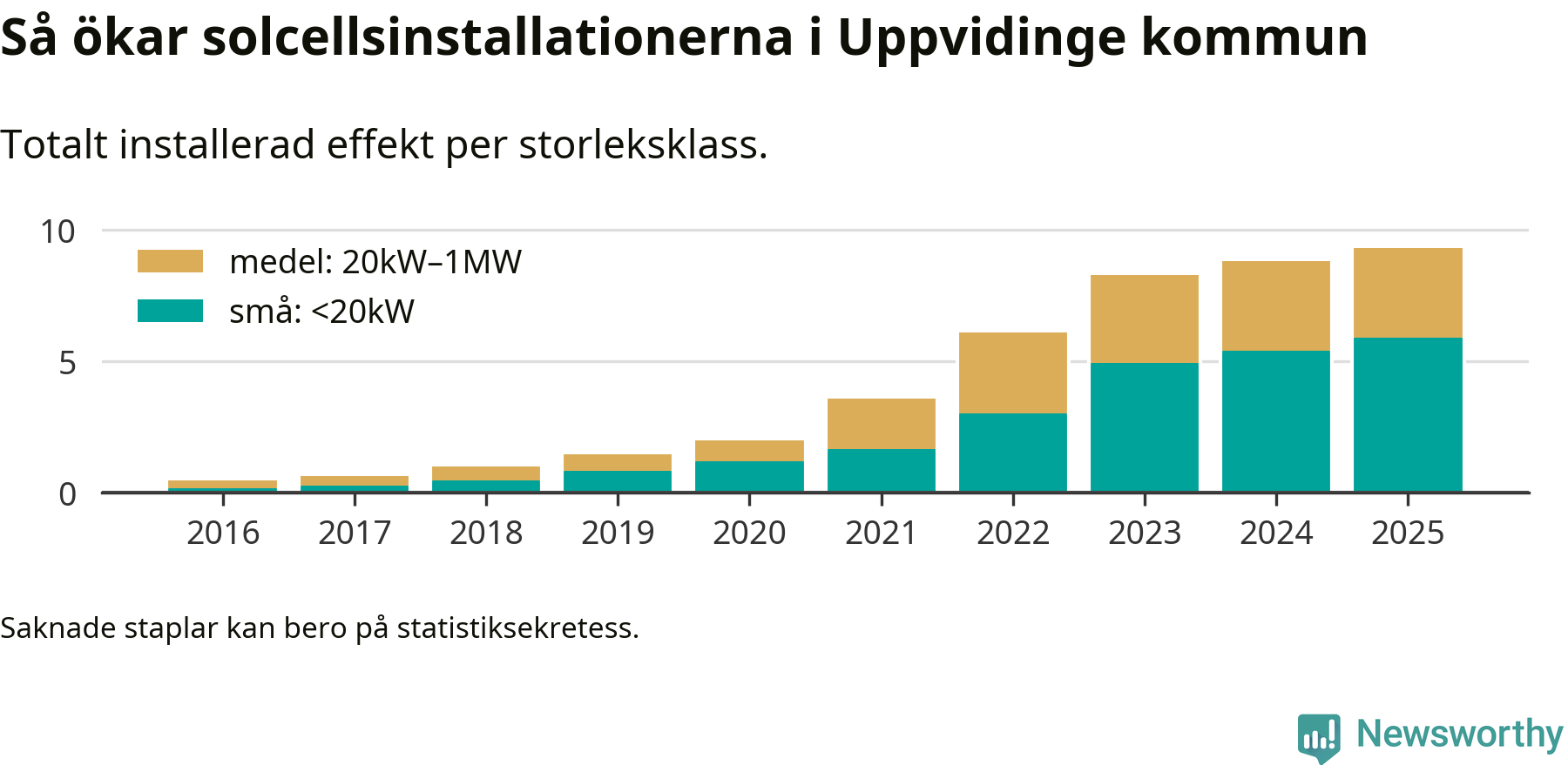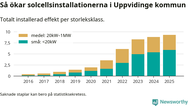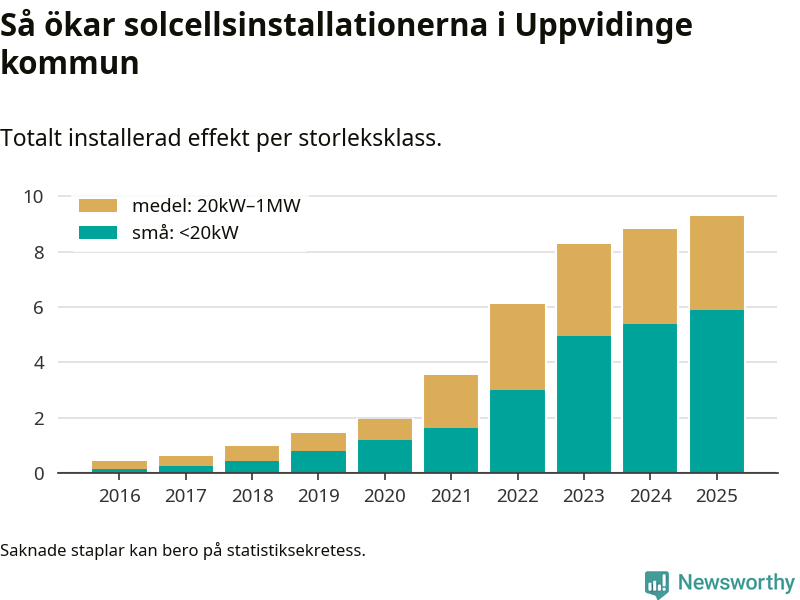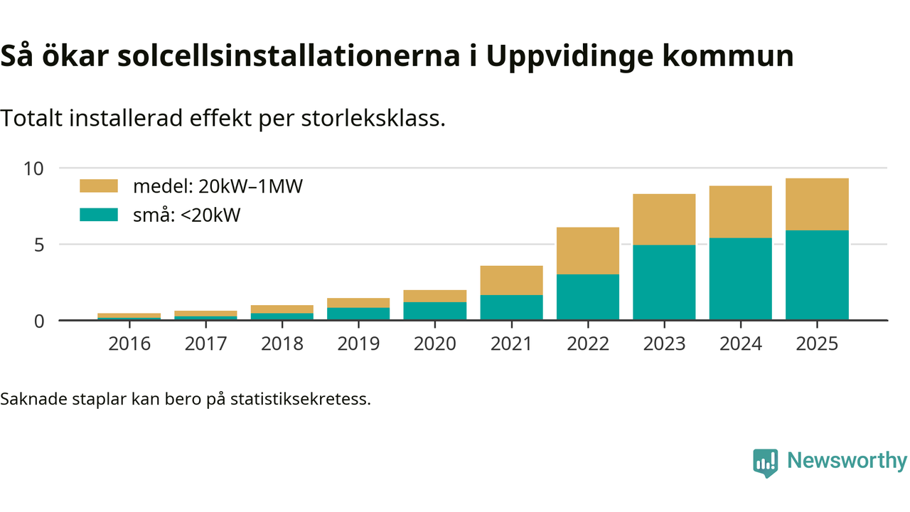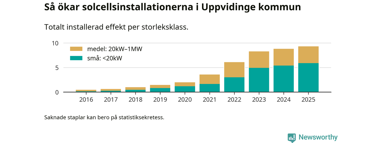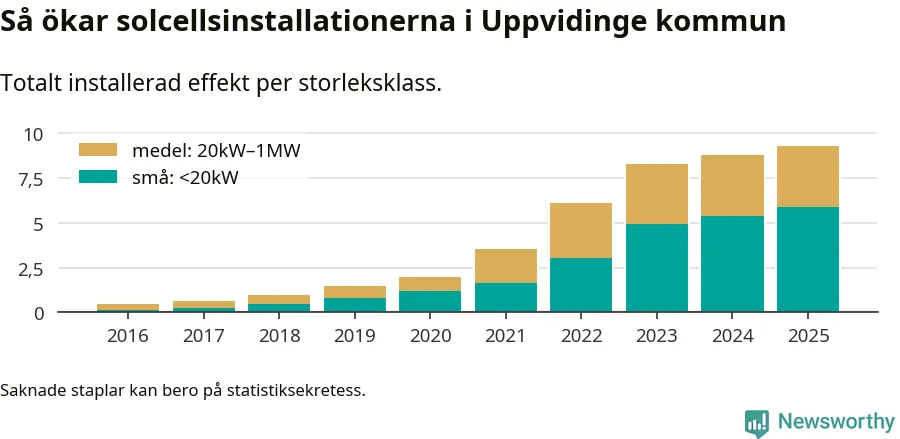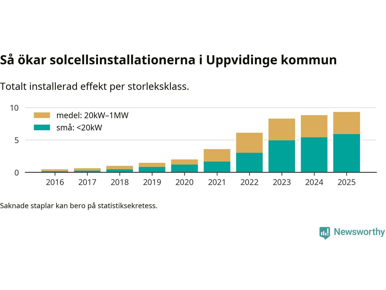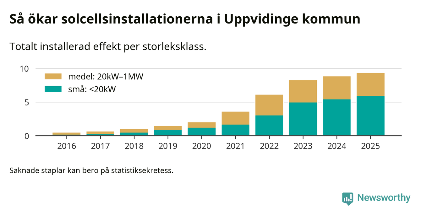 Det är framför allt de stora anläggningarna som driver tillväxten. Småskalig solel dominerar fortfarande produktionen – mer än hälften av effekten finns i anläggningar under 20 kilowatt – men det är bland de stora anläggningarna vi ser den största ökningstakten.