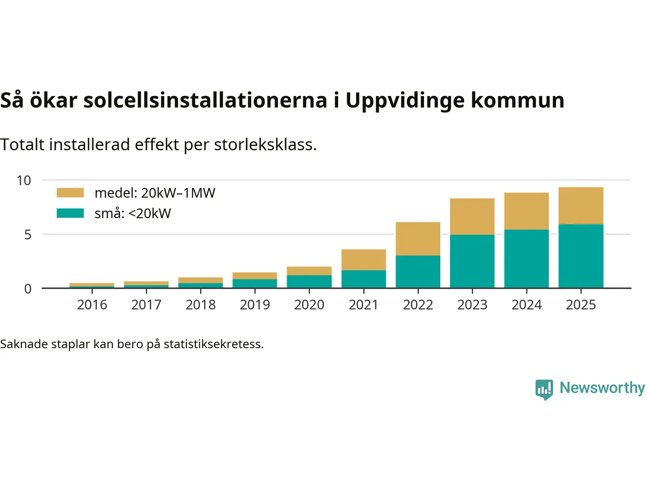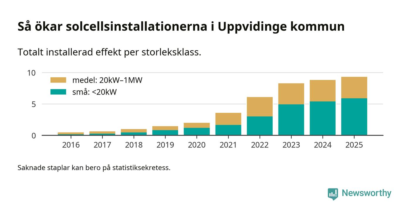 Under 2025 anslöts 490 kilowatt ny solel till elnätet i Uppvidinge kommun, en ökning med 6 procent jämfört med året innan.