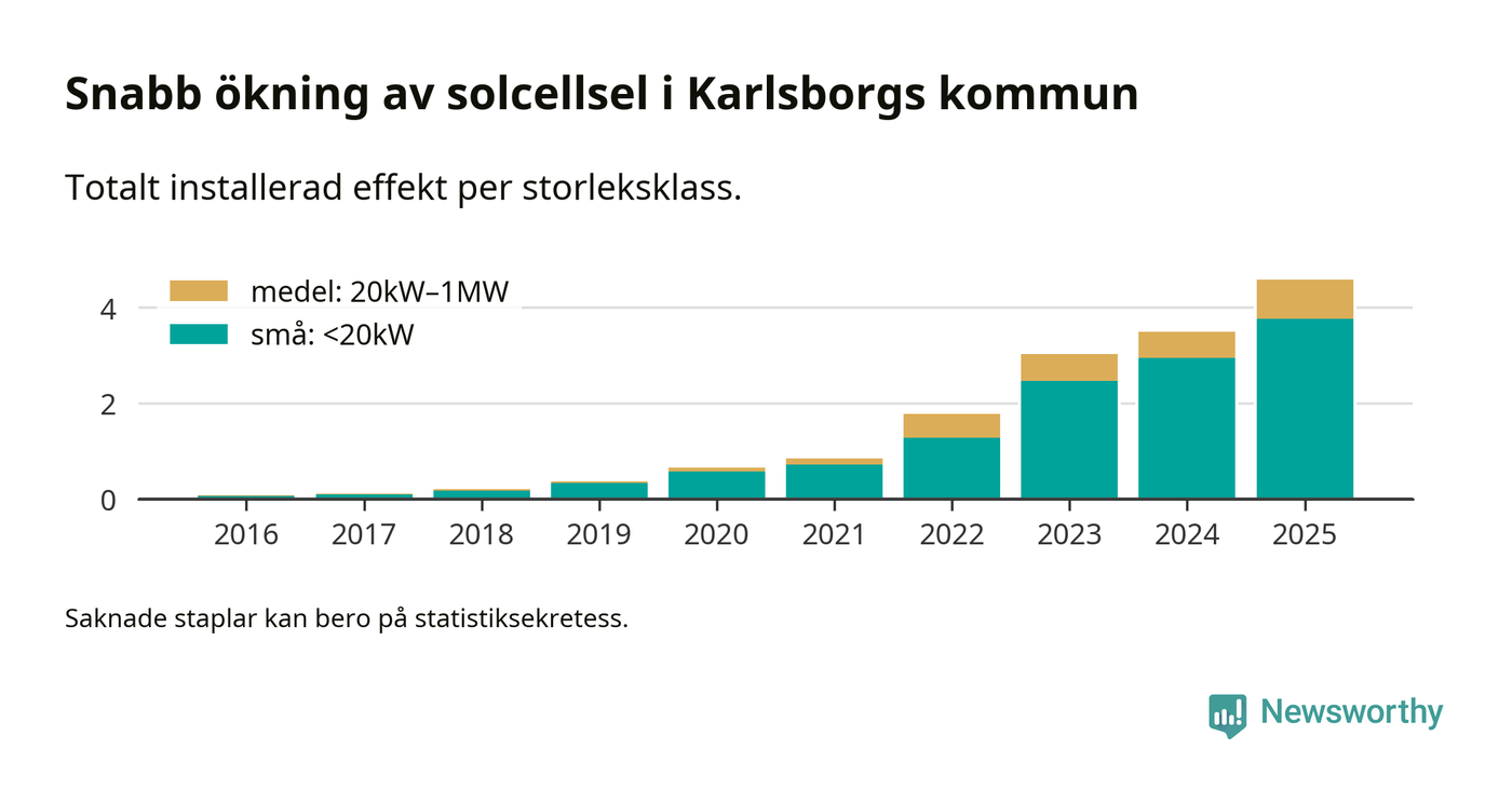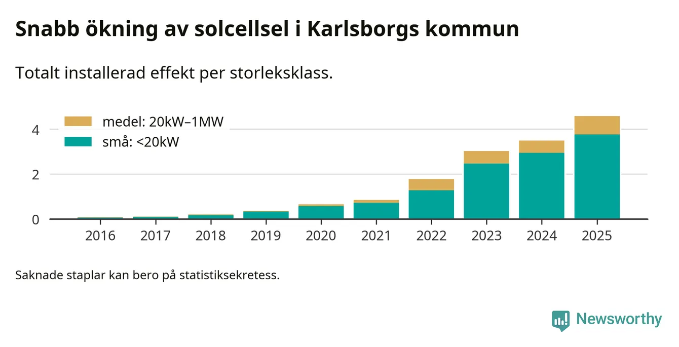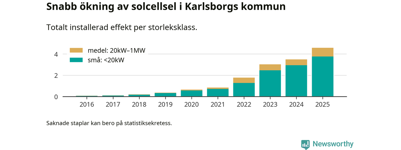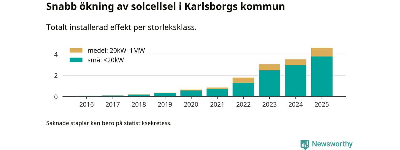 Det är framför allt de stora anläggningarna som driver tillväxten. Småskalig solel dominerar fortfarande produktionen – mer än hälften av effekten finns i anläggningar under 20 kilowatt – men det är bland de stora anläggningarna vi ser den största ökningstakten.