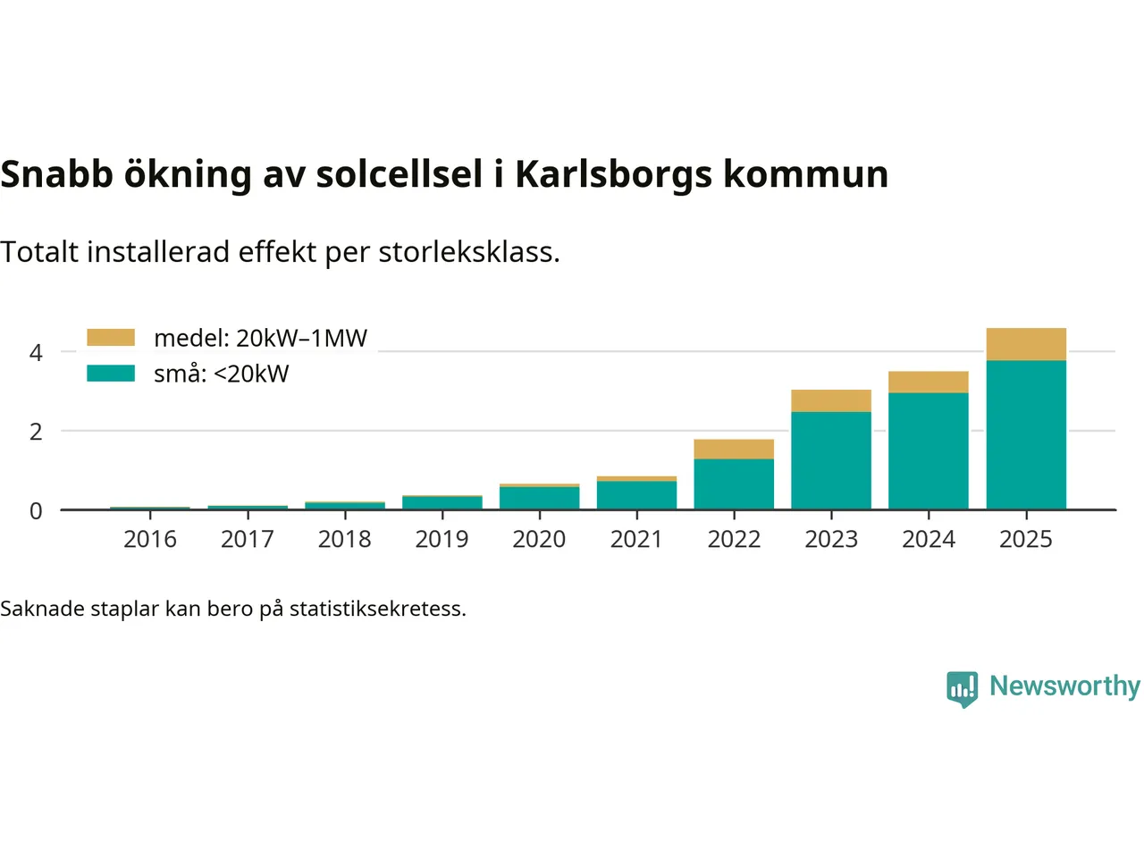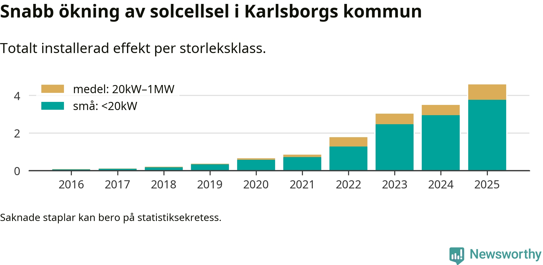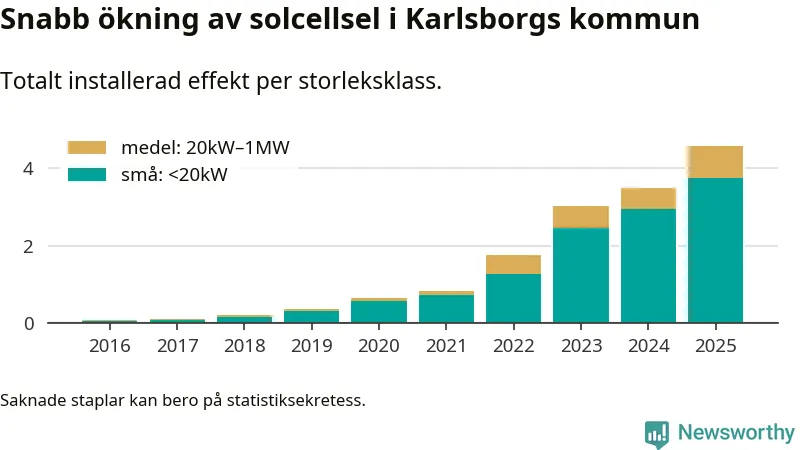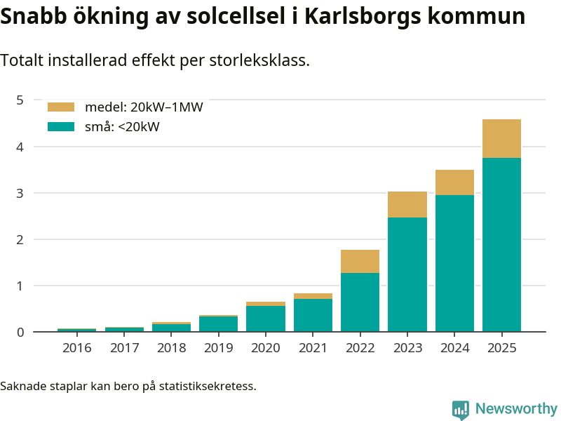 Det är framför allt de stora anläggningarna som driver tillväxten. Småskalig solel dominerar fortfarande produktionen – mer än hälften av effekten finns i anläggningar under 20 kilowatt – men det är bland de stora anläggningarna vi ser den största ökningstakten.