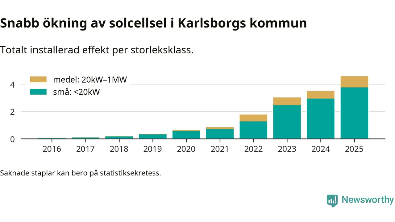 Under 2025 anslöts 1,1 megawatt ny solel till elnätet i Karlsborgs kommun, en ökning med 31 procent jämfört med året innan.