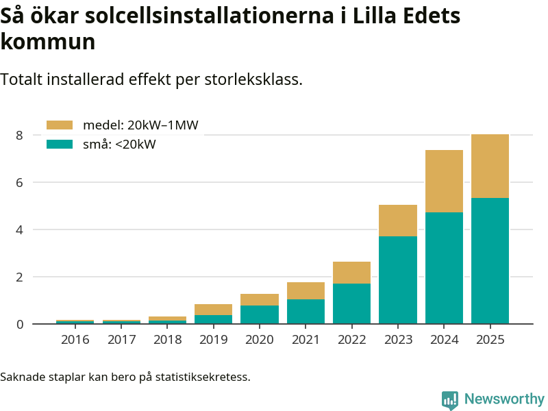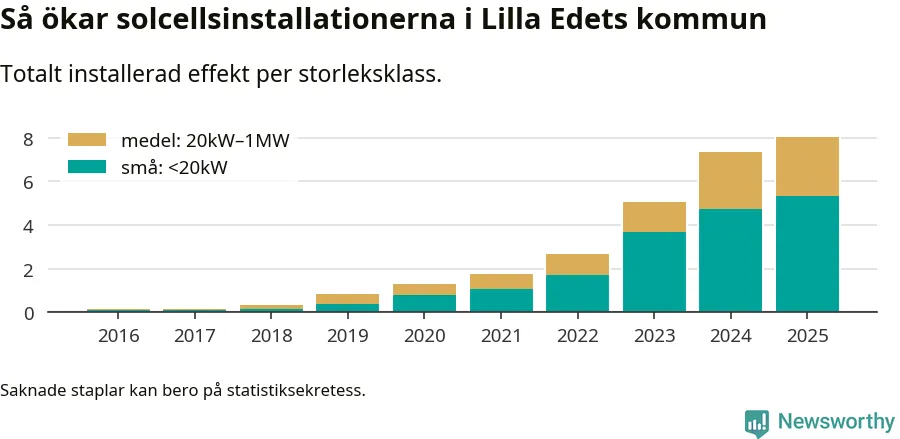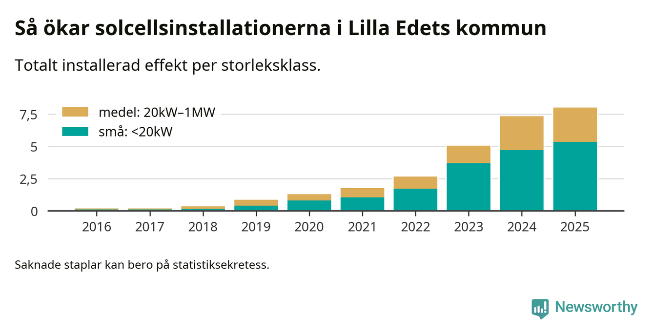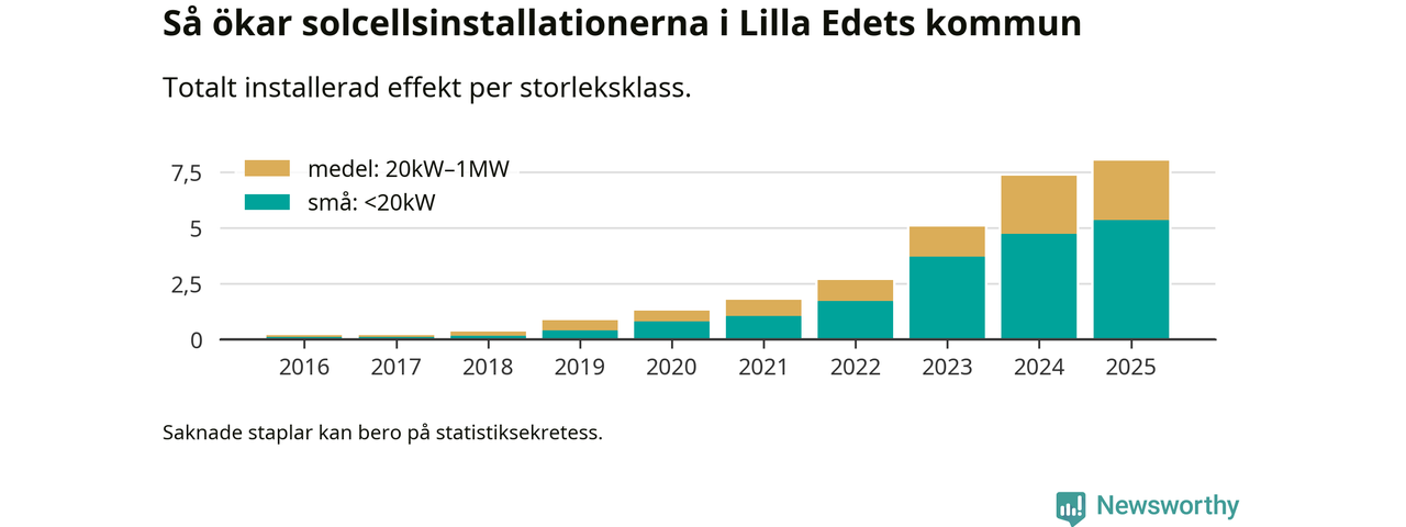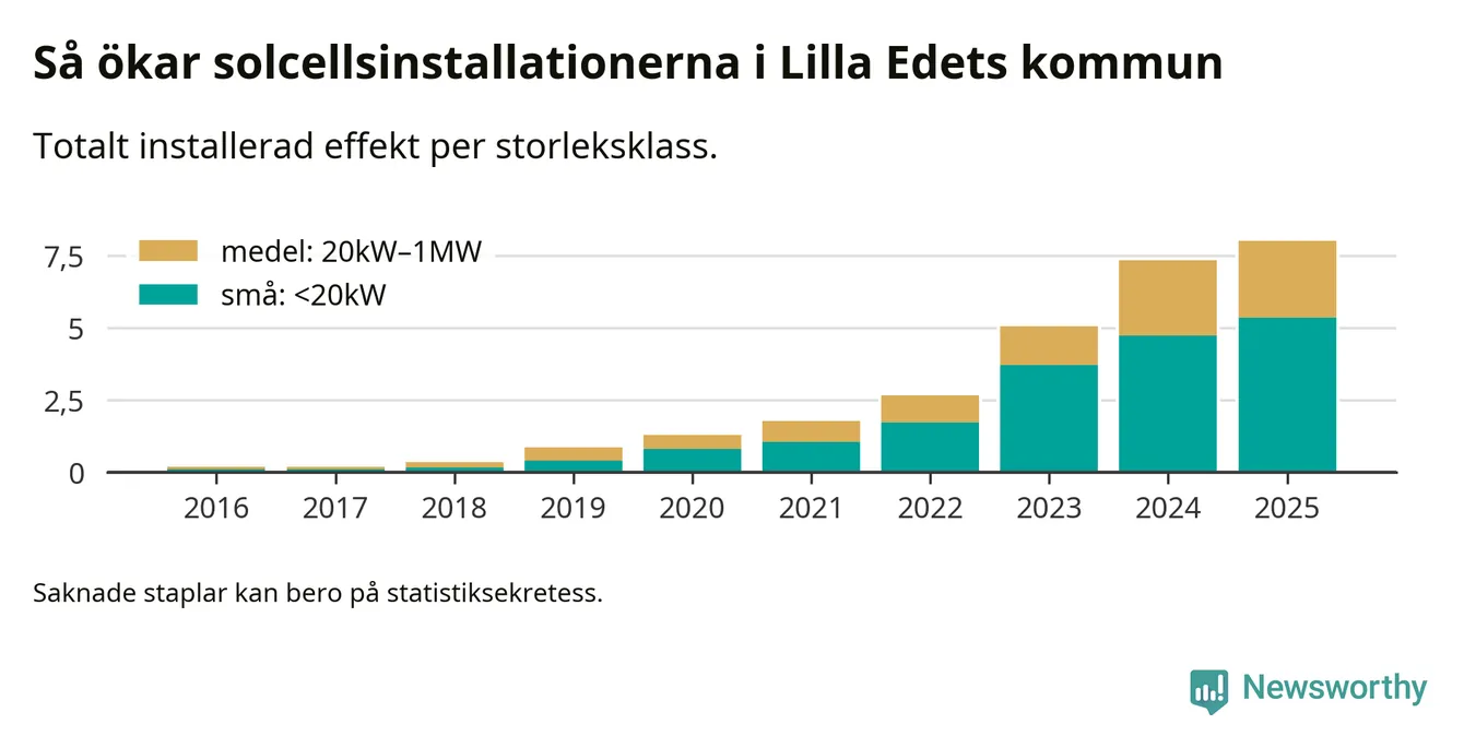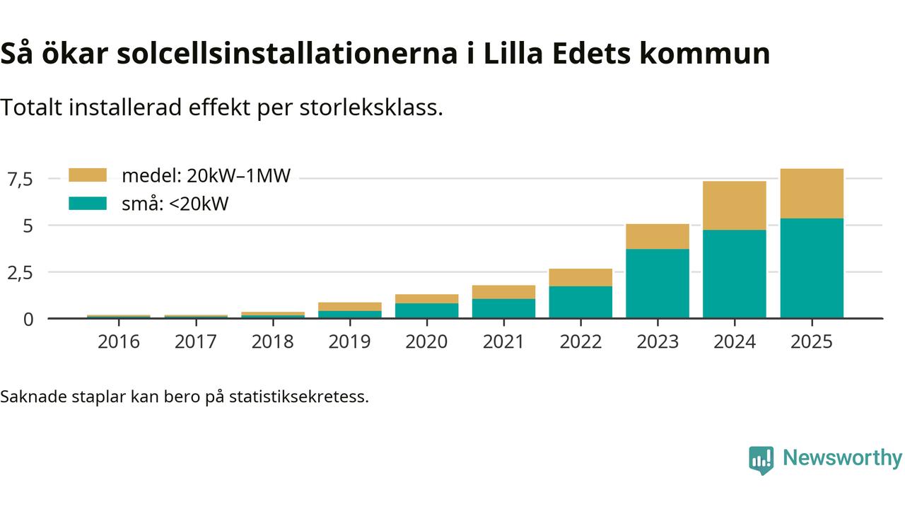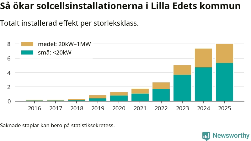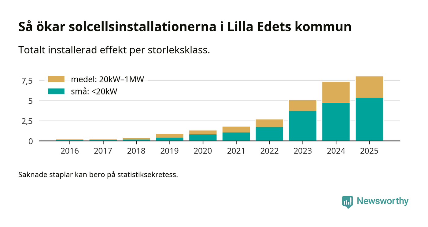 Under 2025 anslöts 0,7 megawatt ny solel till elnätet i Lilla Edets kommun, en ökning med 9 procent jämfört med året innan.