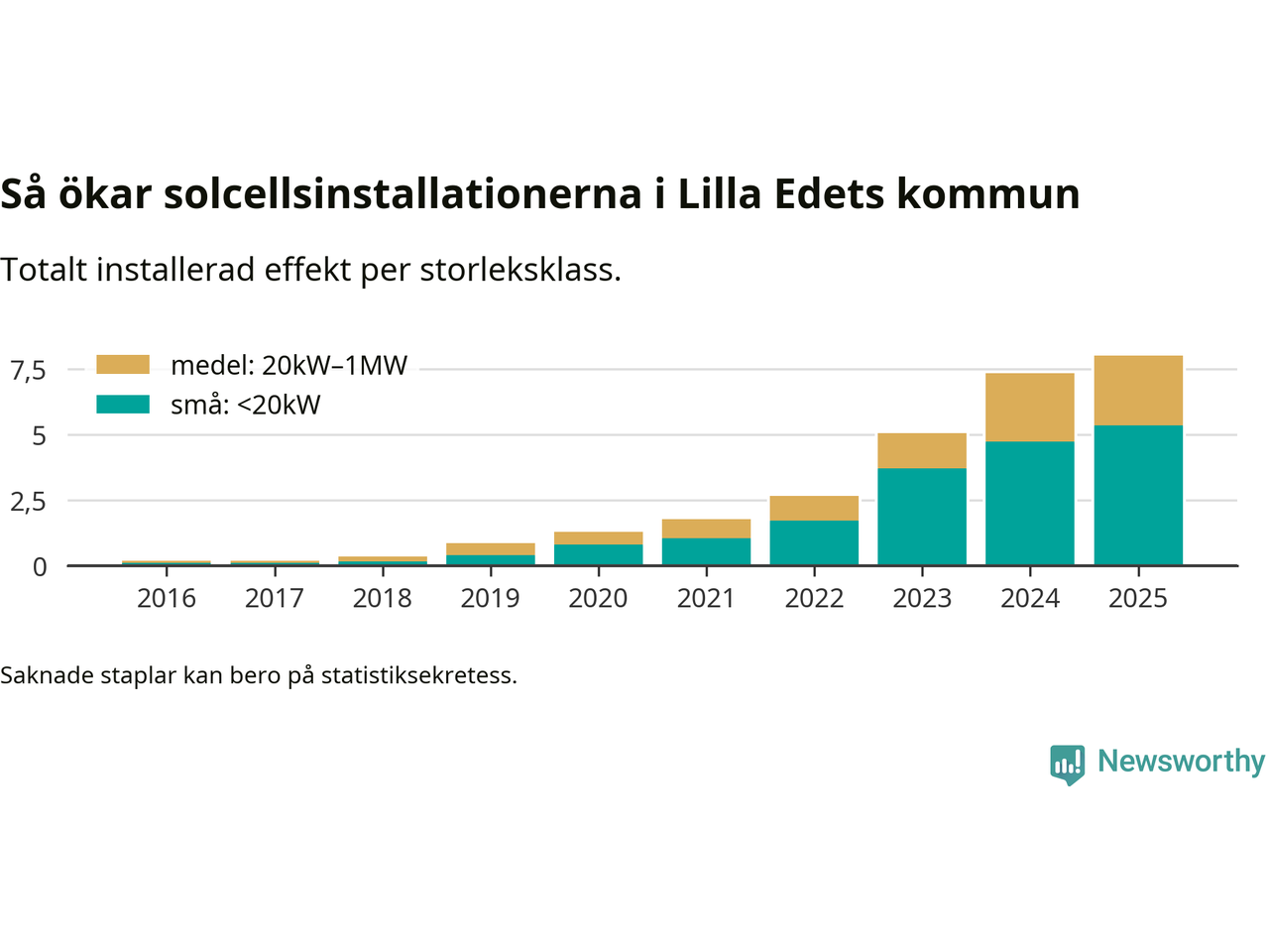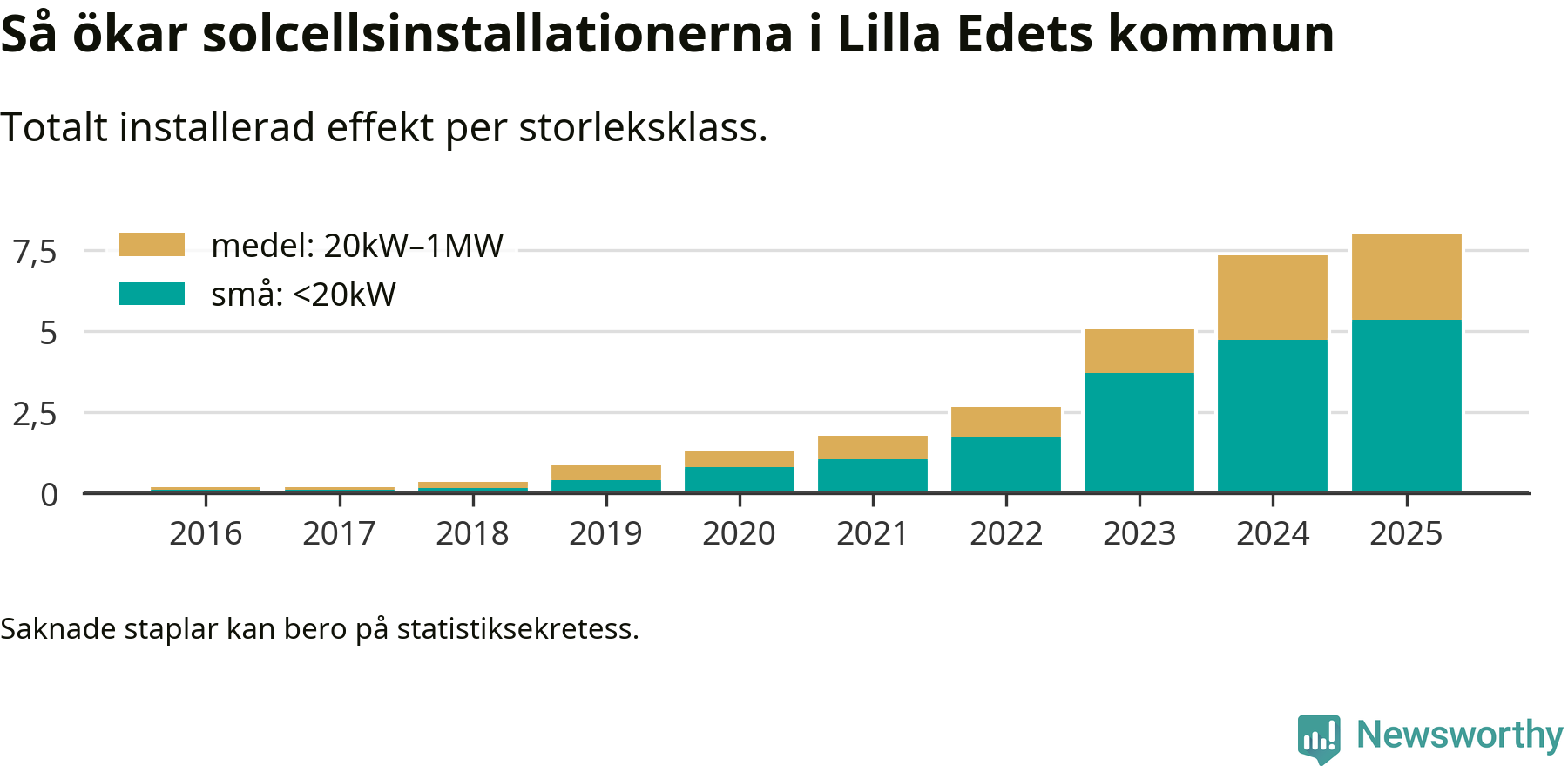 Det är framför allt de stora anläggningarna som driver tillväxten. Småskalig solel dominerar fortfarande produktionen – mer än hälften av effekten finns i anläggningar under 20 kilowatt – men det är bland de stora anläggningarna vi ser den största ökningstakten.