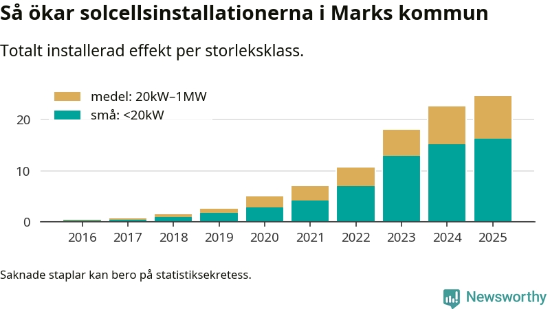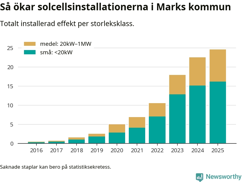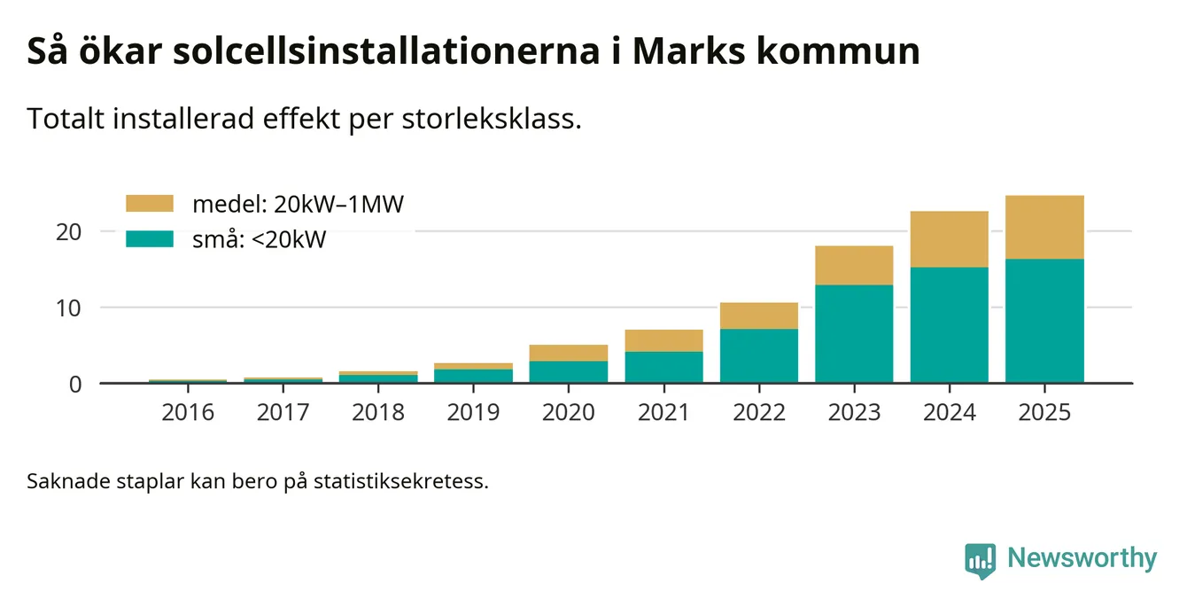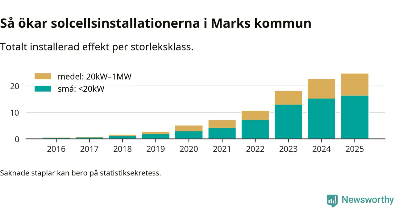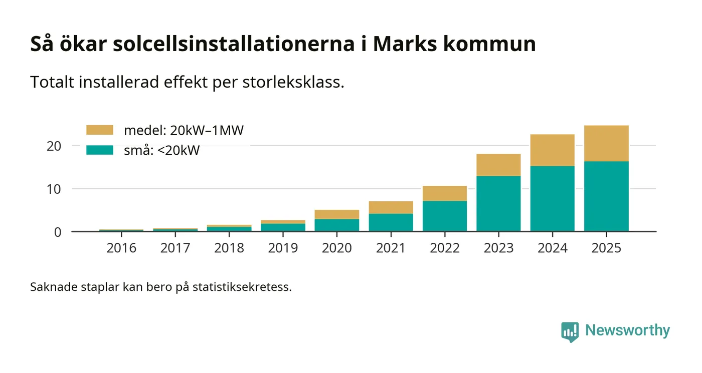 Under 2025 anslöts 2,1 megawatt ny solel till elnätet i Marks kommun, en ökning med 9 procent jämfört med året innan.