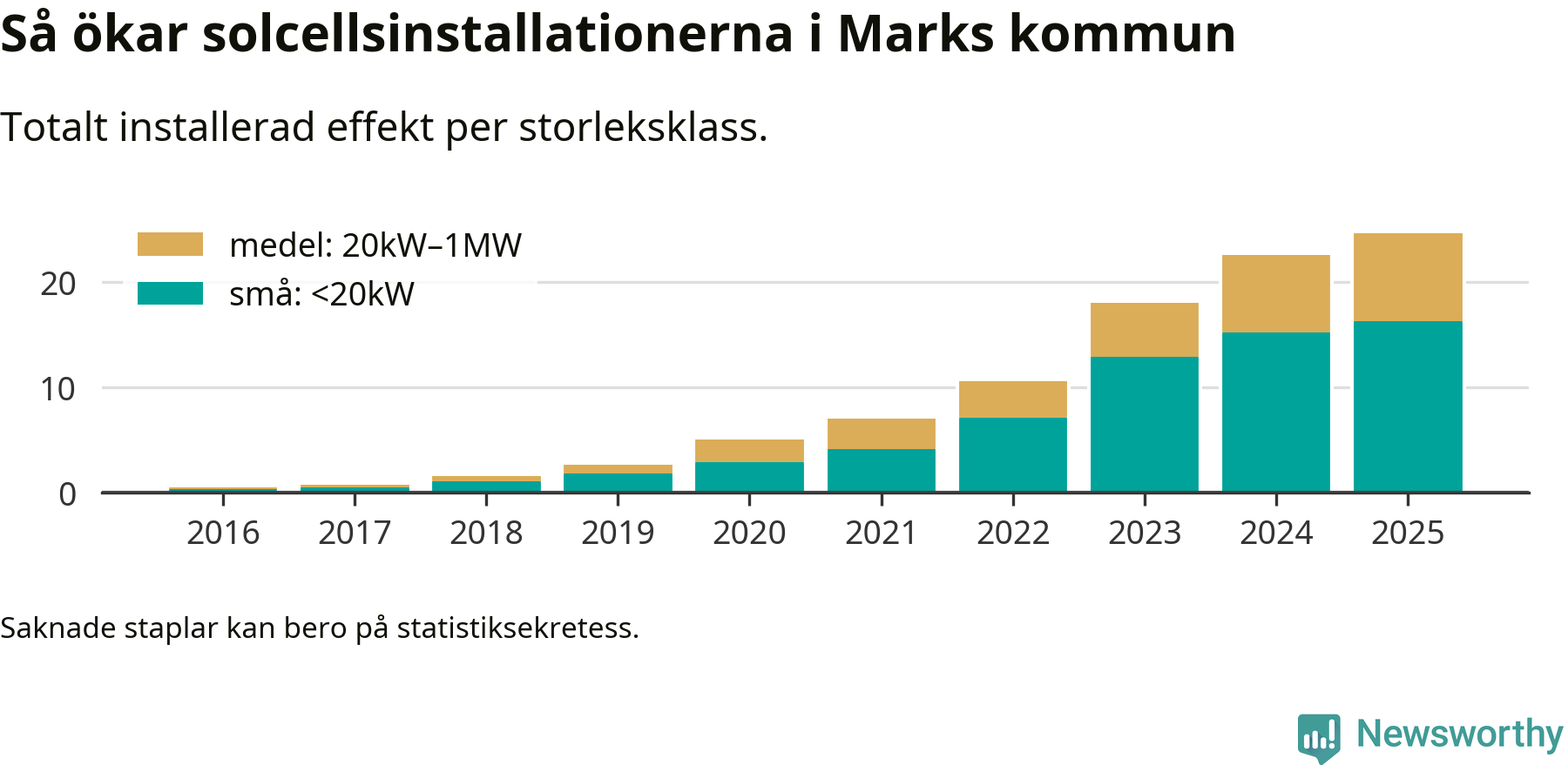 Det är framför allt de stora anläggningarna som driver tillväxten. Småskalig solel dominerar fortfarande produktionen – mer än hälften av effekten finns i anläggningar under 20 kilowatt – men det är bland de stora anläggningarna vi ser den största ökningstakten.