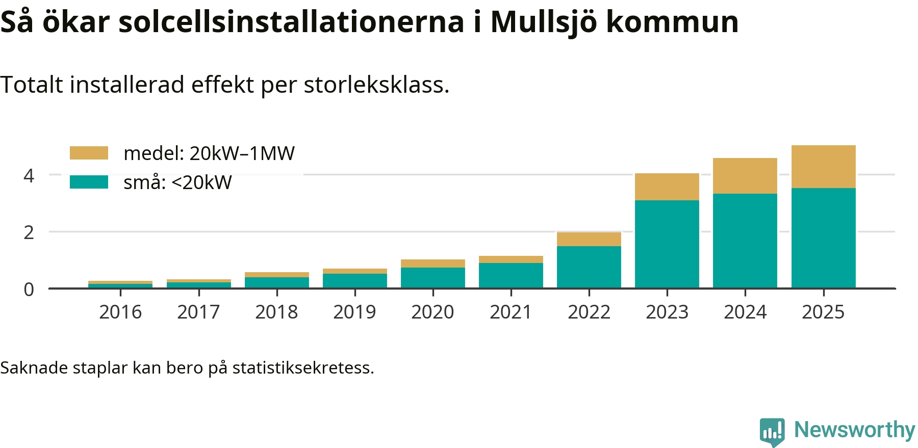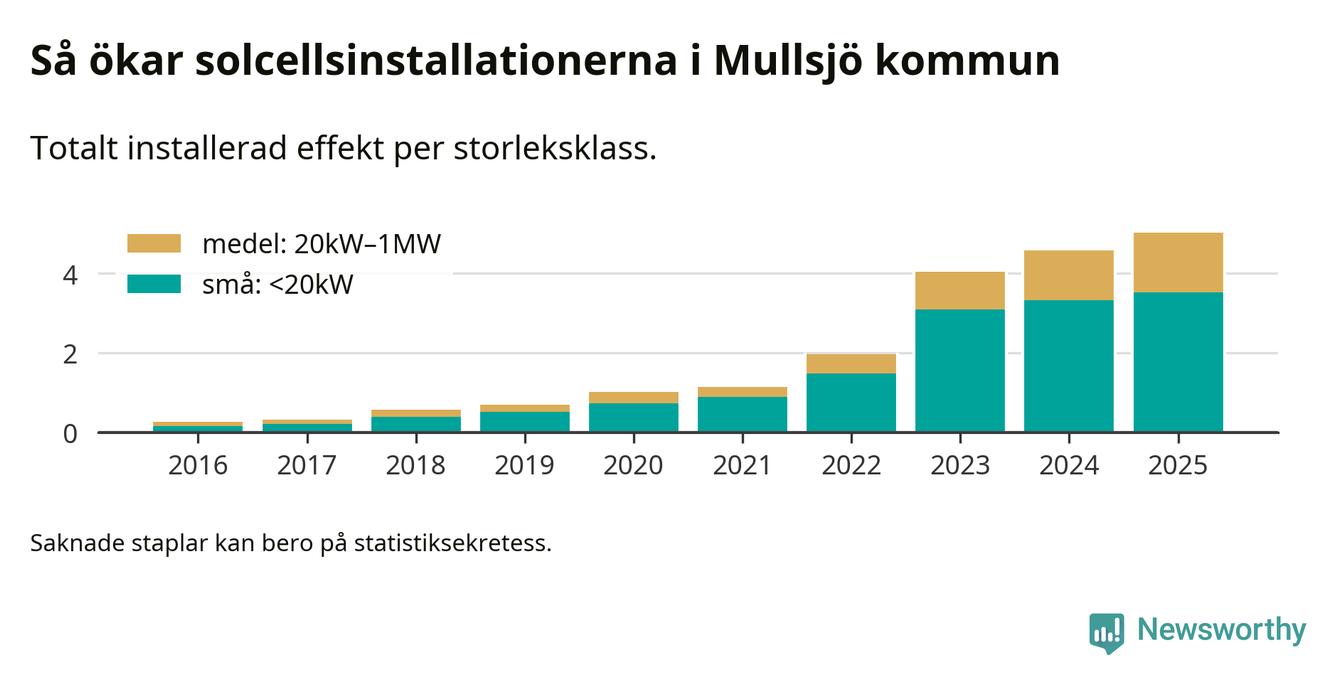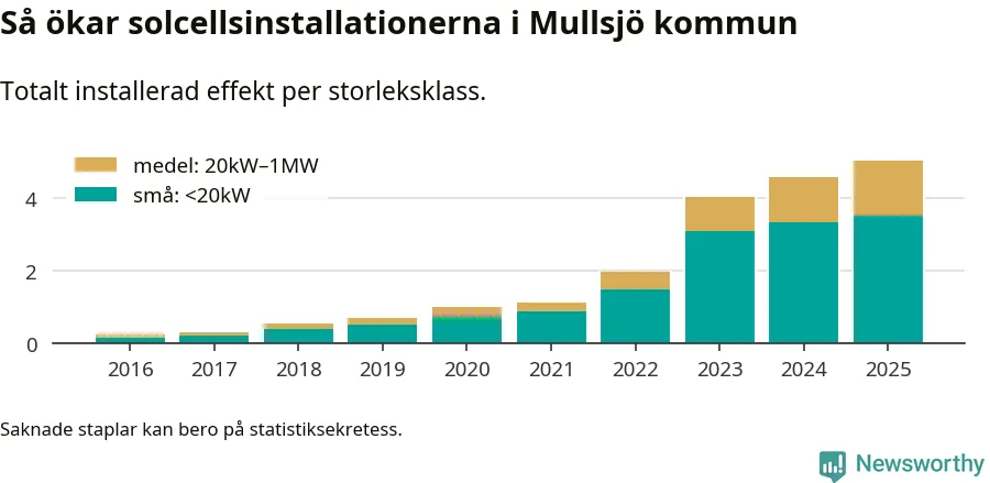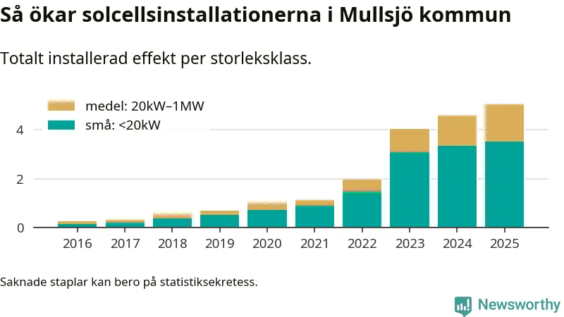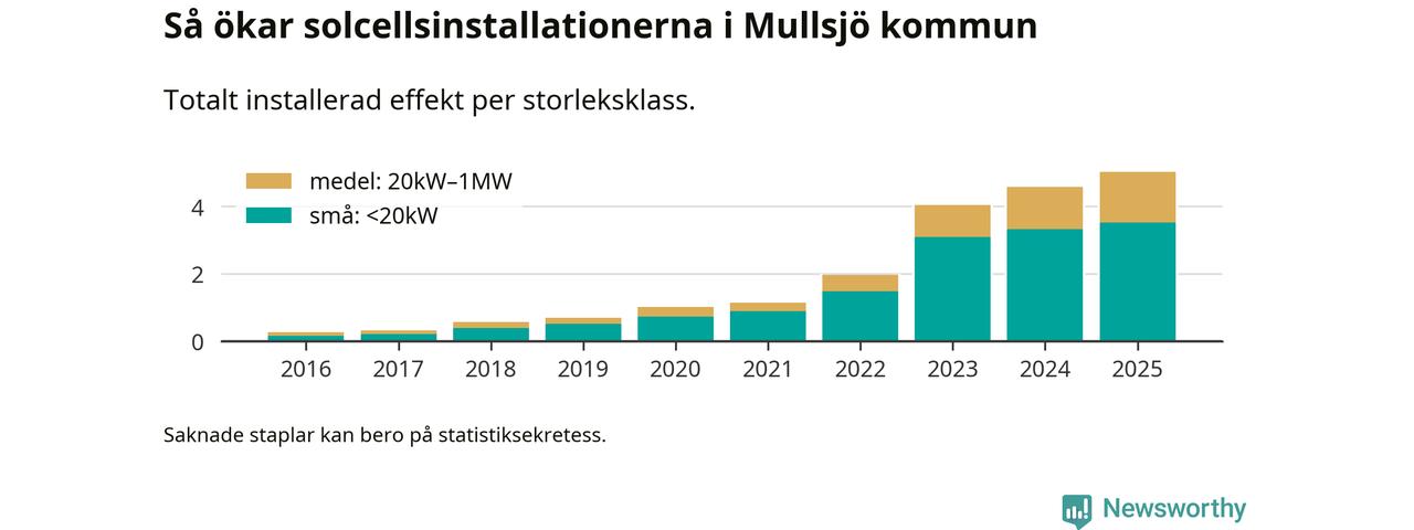 Den största delen av solelen i Mullsjö, 70 procent, kommer från småskaliga anläggningar, totalt 323 stycken. Det påminner om hur det ser ut i riket som helhet. I hela Sverige står anläggningar under 20 kilowatt för mer än hälften av den installerade effekten. Generellt är deras andel störst i kommuner med många villahushåll, medan större anläggningar dominerar i tätbefolkade kommuner med fler flerfamiljsbostäder – och förstås i de småkommuner som har någon av landets stora markanläggningar för solel.