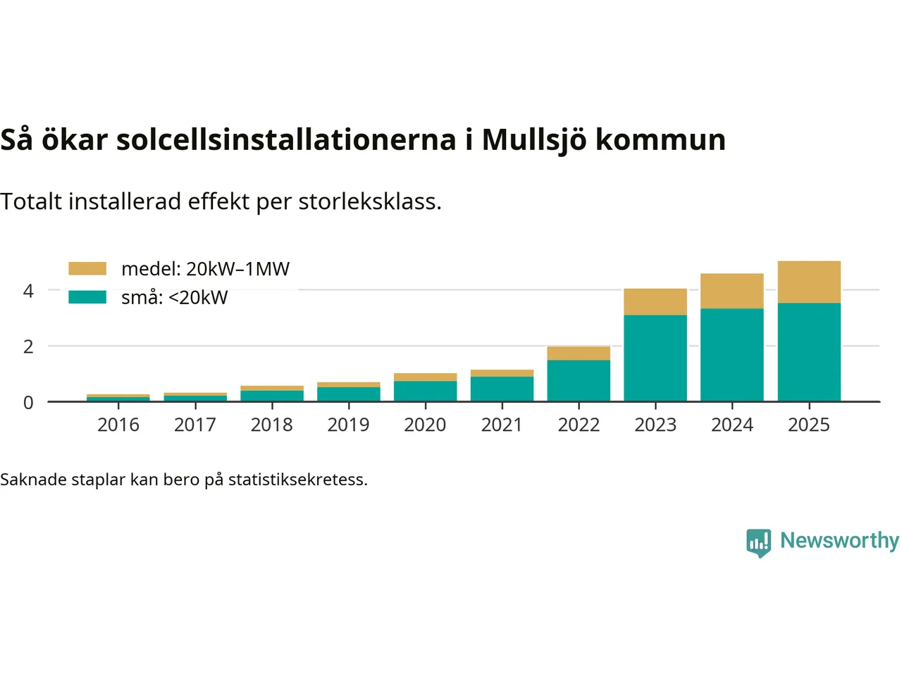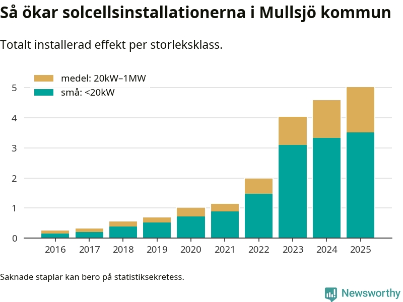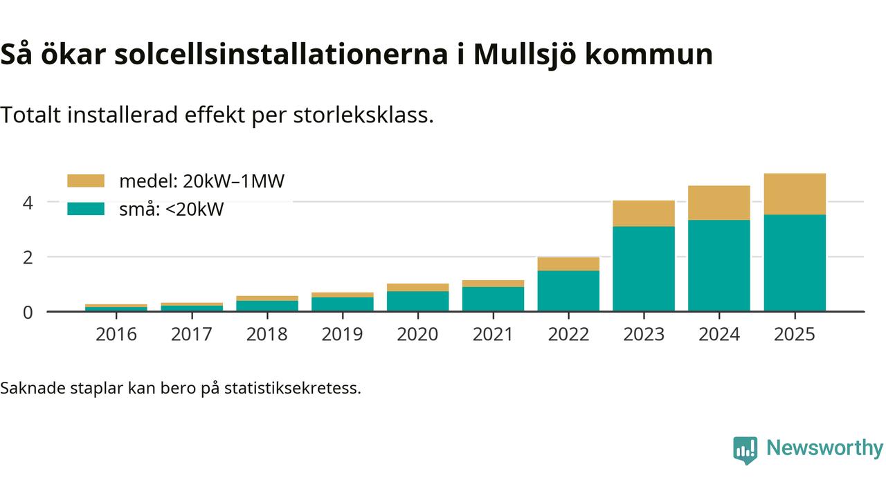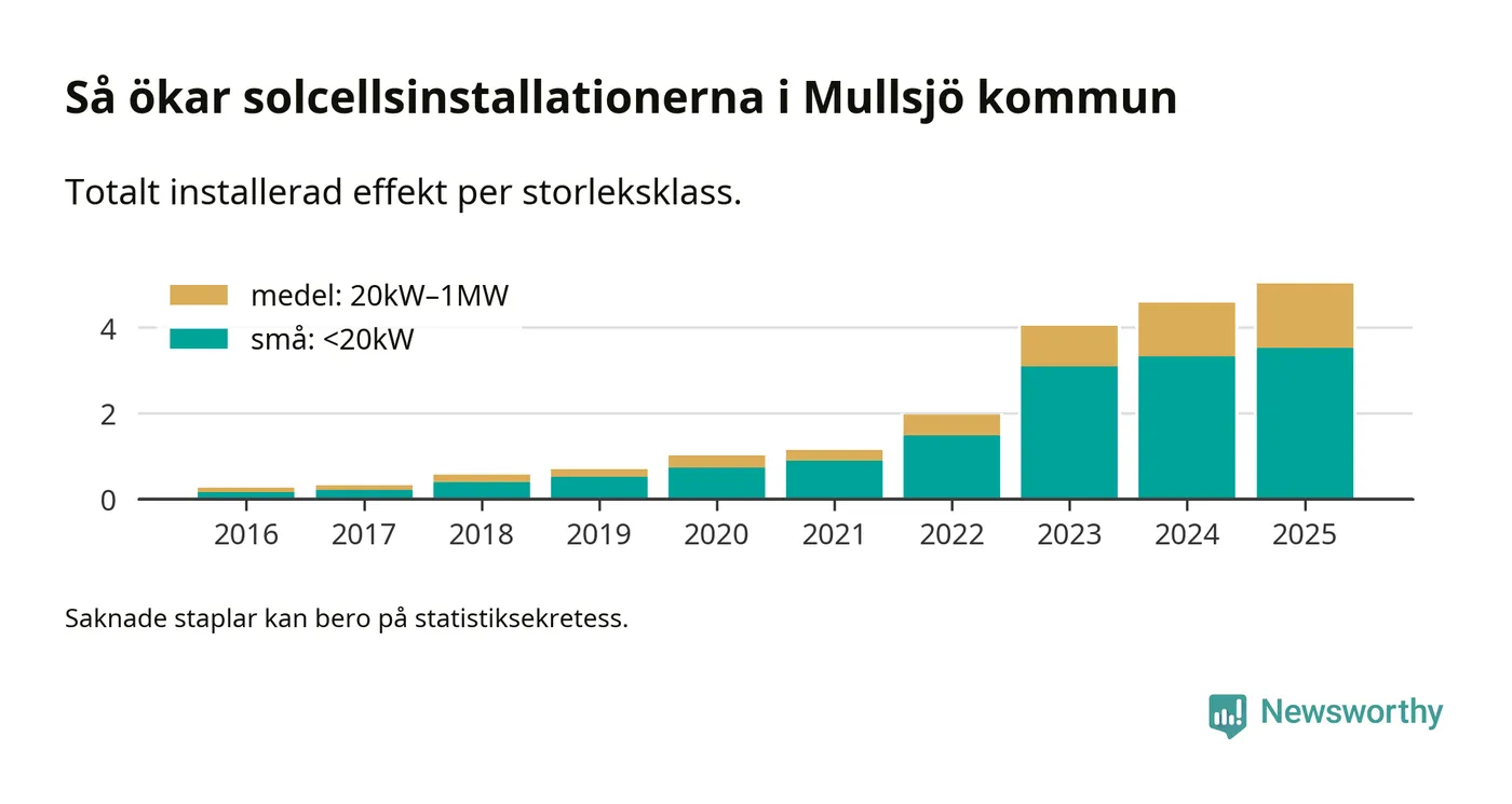 Antalet solcellsinstallationer i Sverige ökar, men i Mullsjö kommun var utbyggnadstakten under 2025 mindre än i riket i stort. Det visar ny statistik från Energimyndigheten.