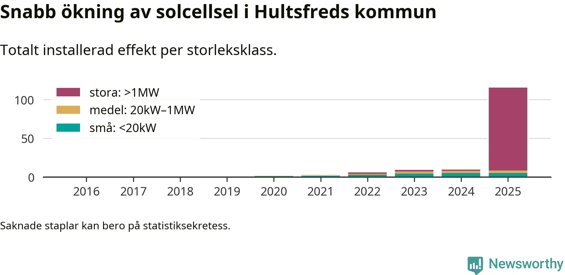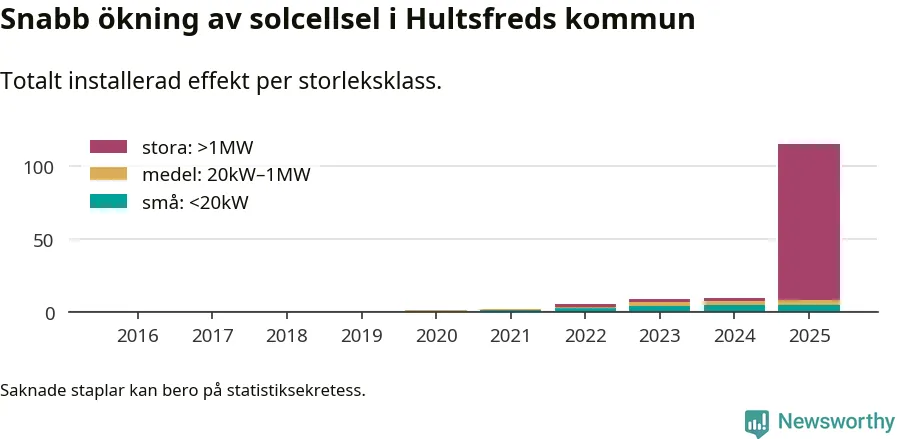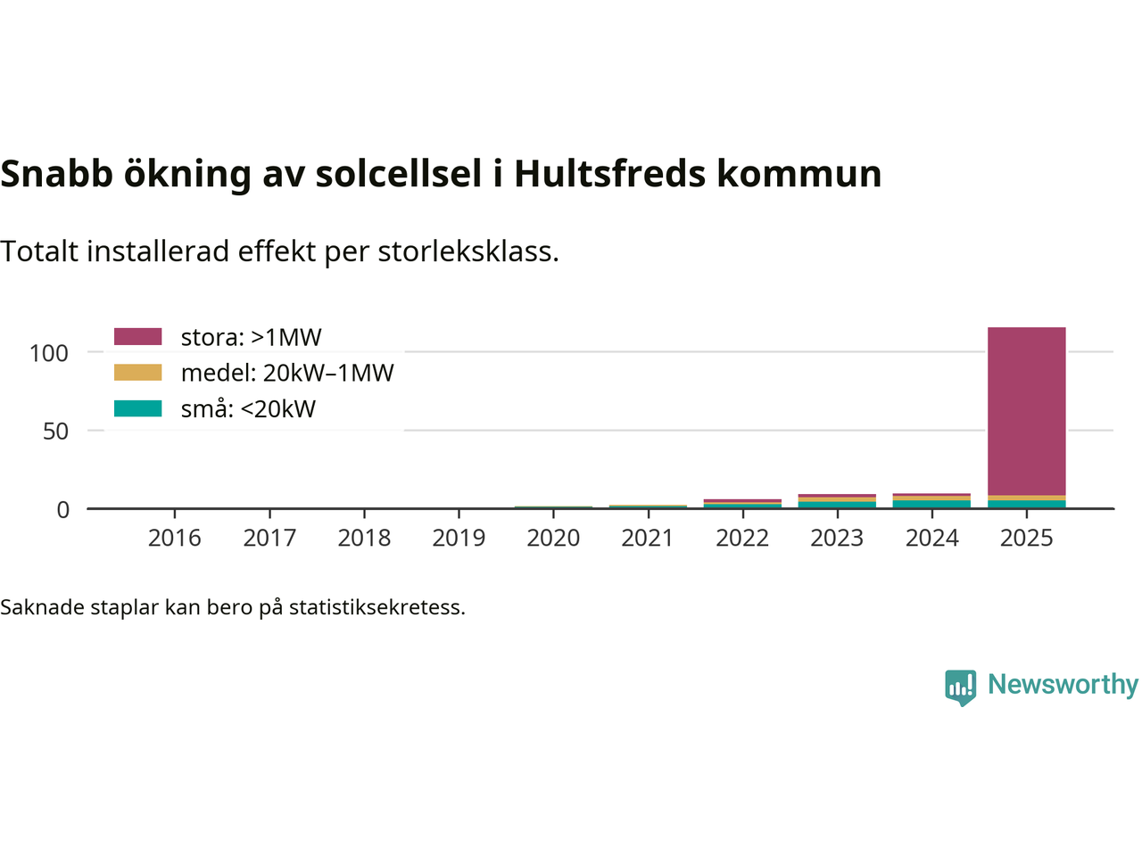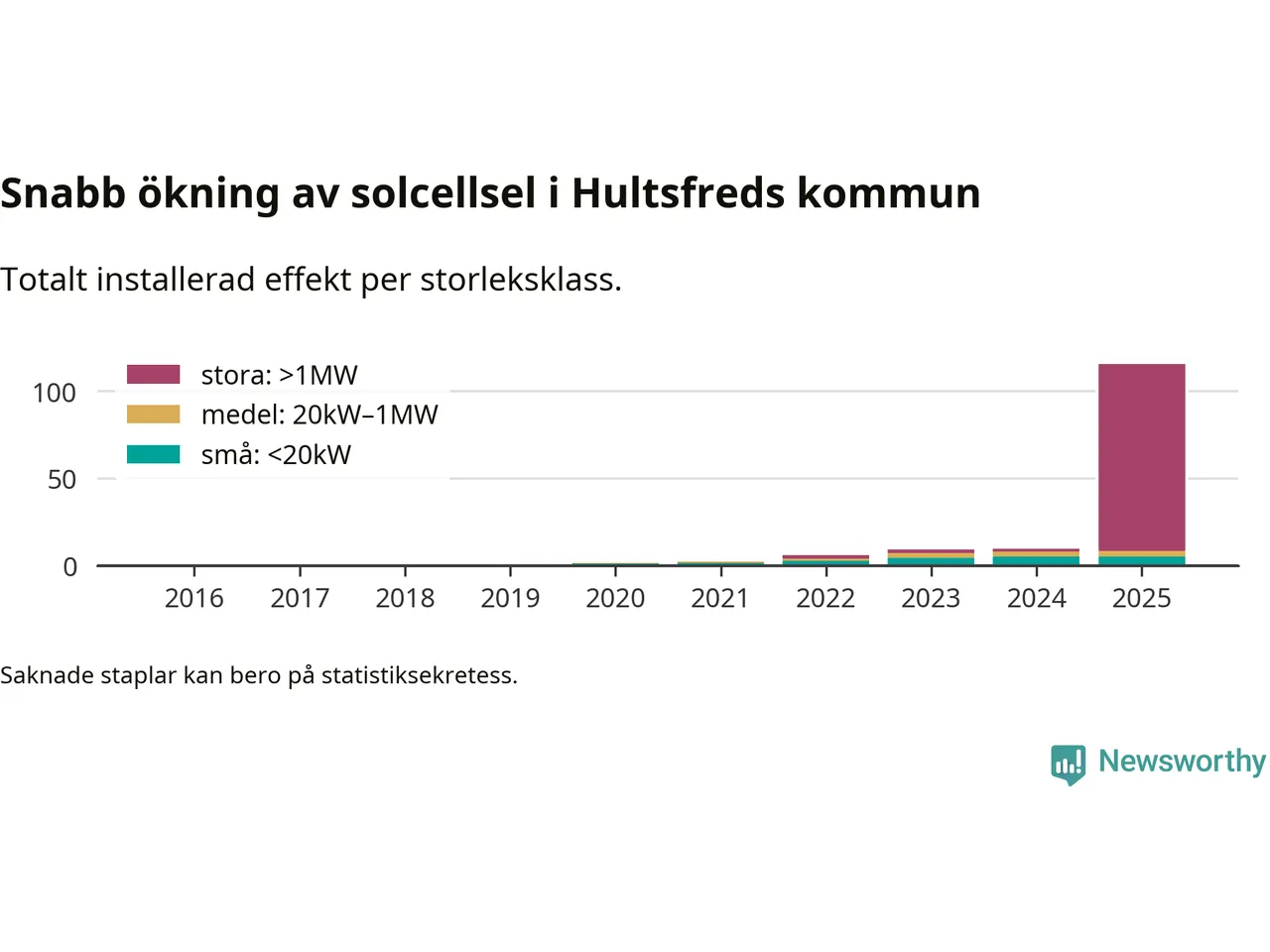 Under 2025 anslöts 105,6 megawatt ny solel till elnätet i Hultsfreds kommun, en flerfaldig ökning jämfört med året innan.