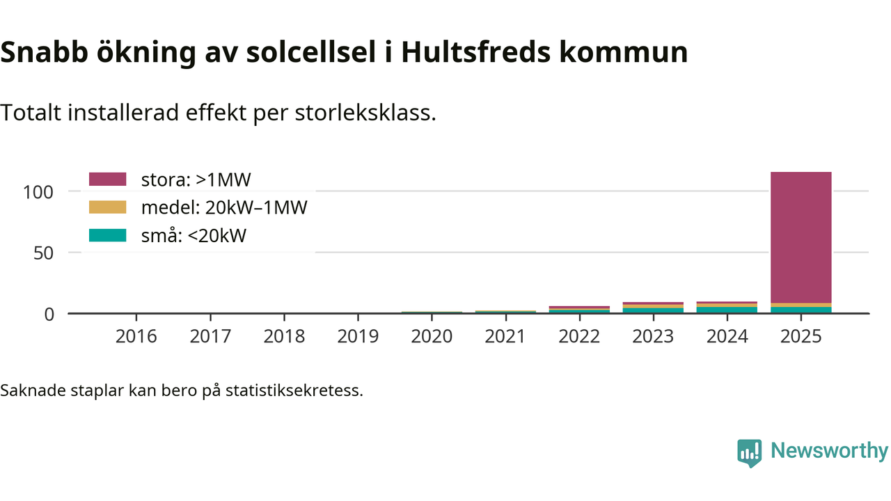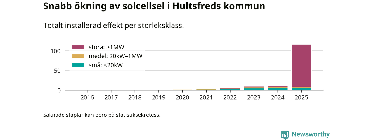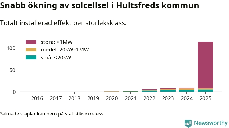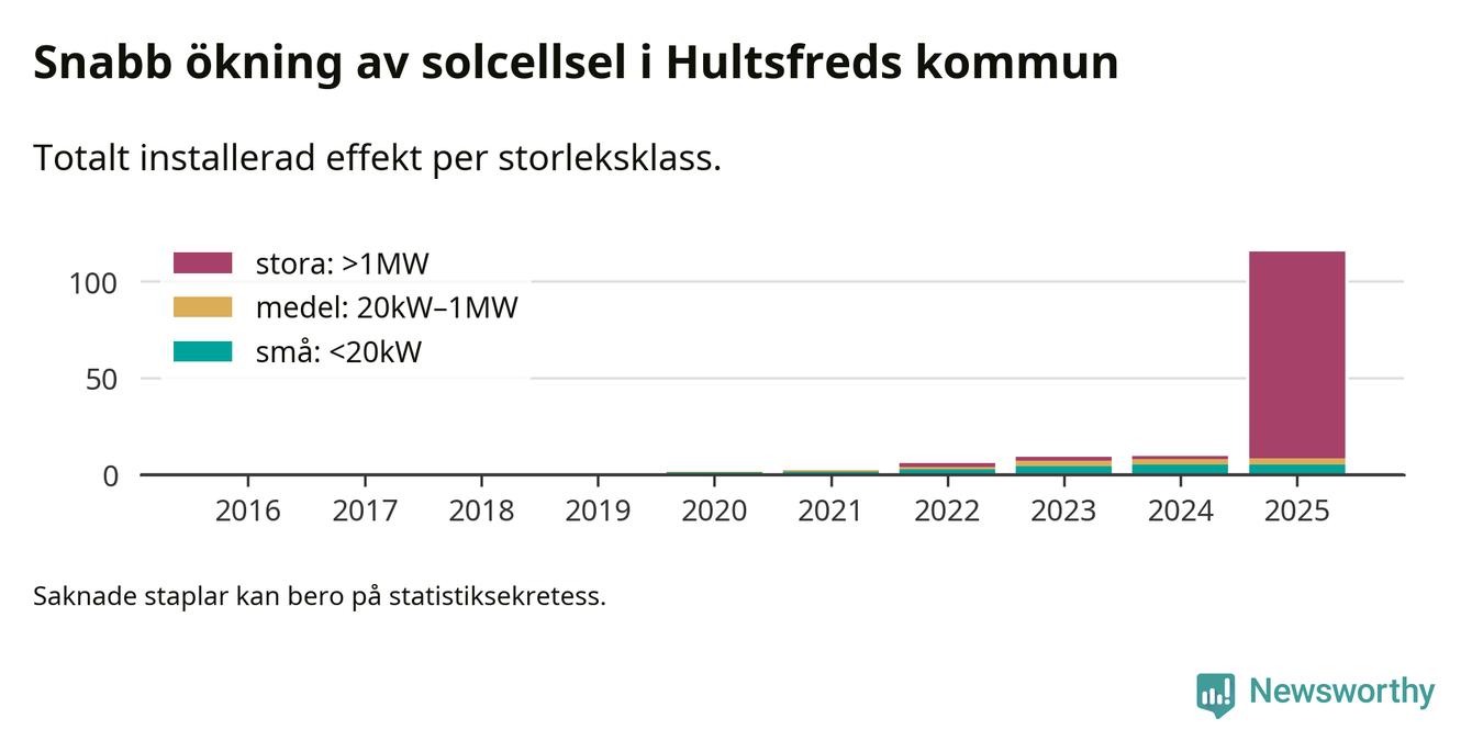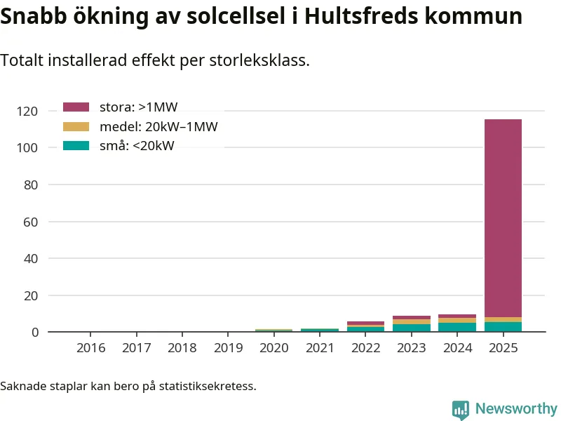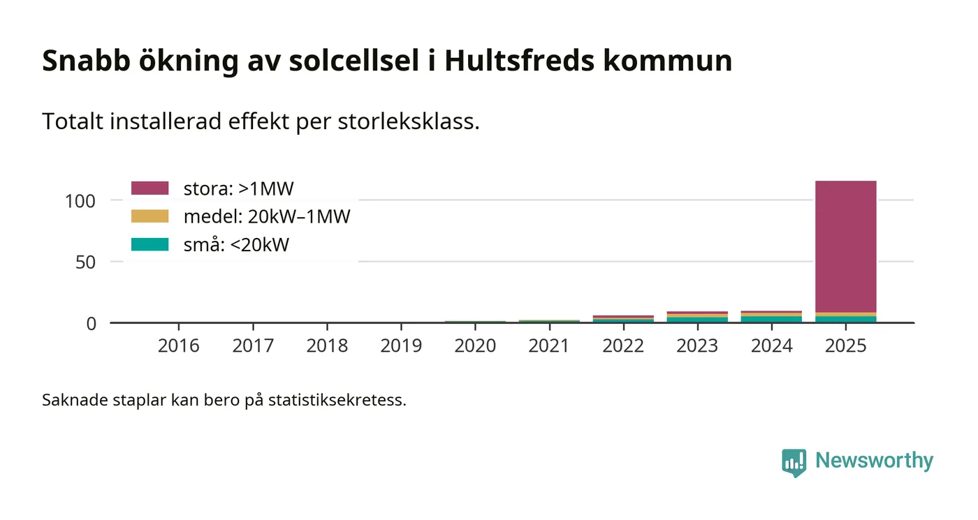 Under 2025 anslöts 105,6 megawatt ny solel till elnätet i Hultsfreds kommun, en flerfaldig ökning jämfört med året innan.