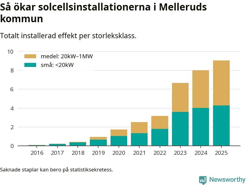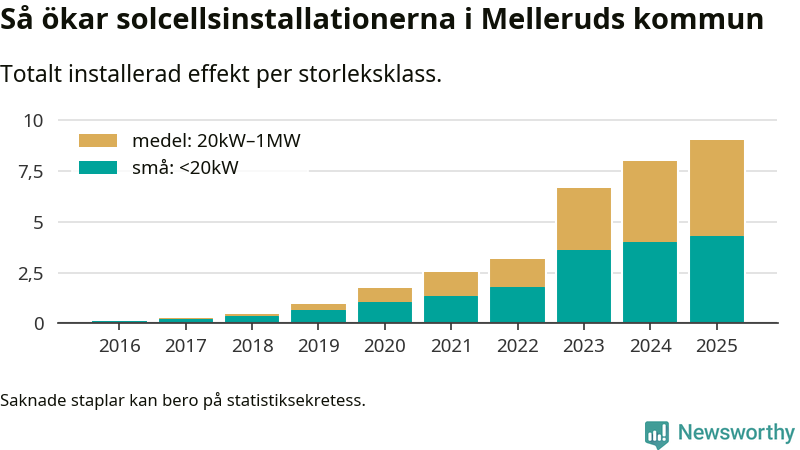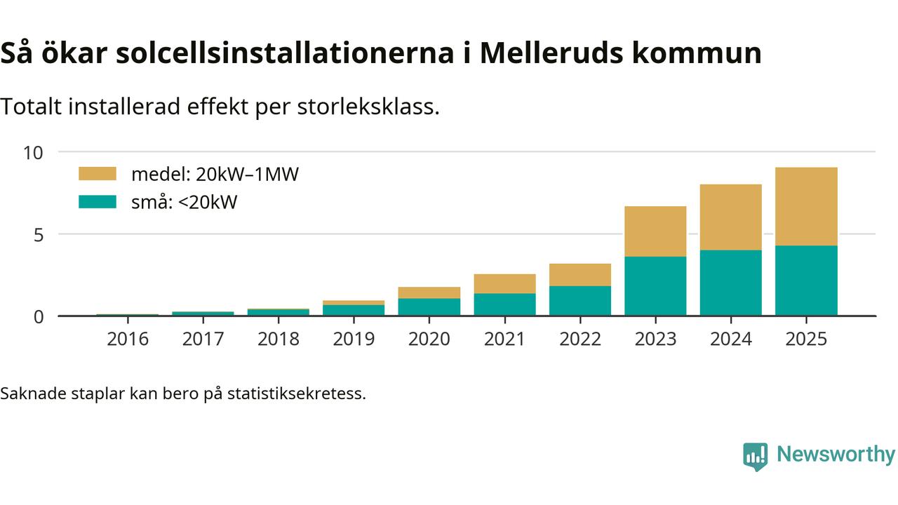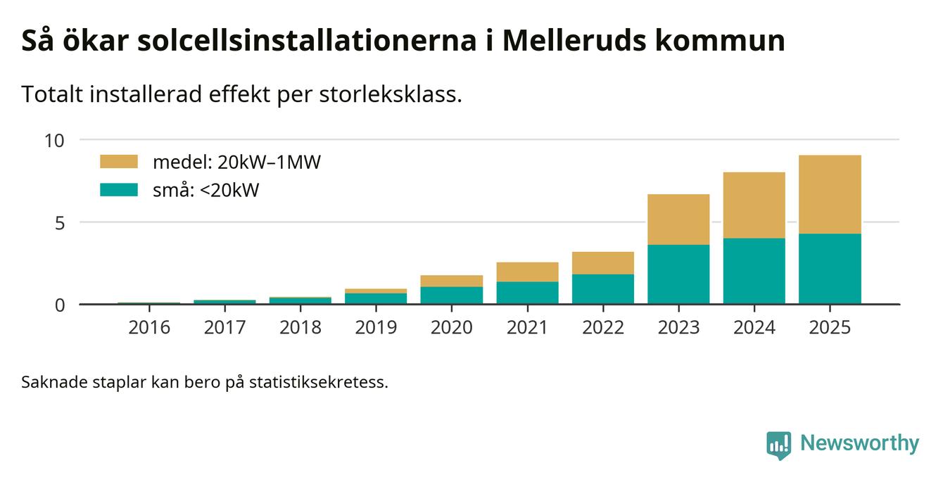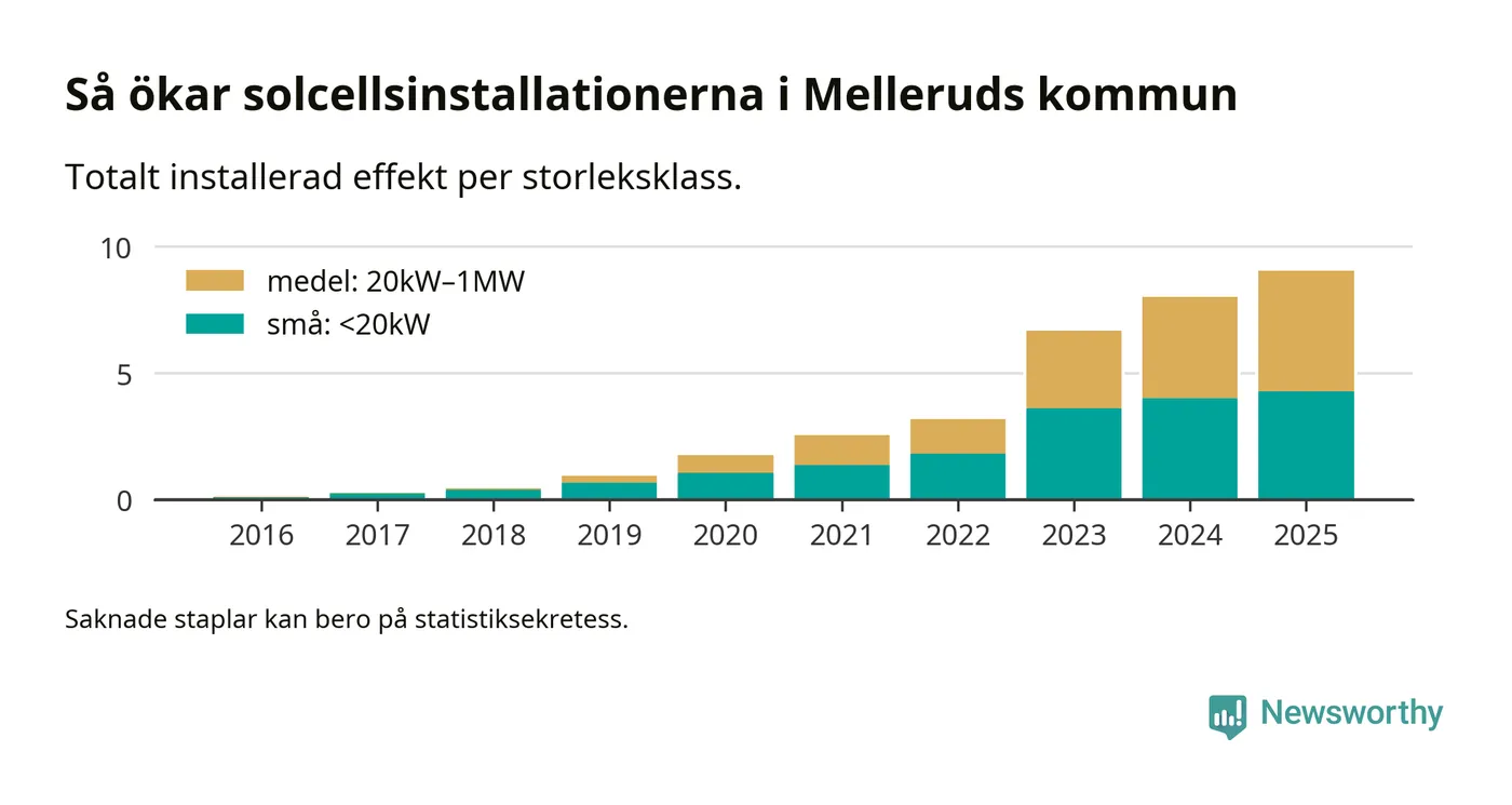 Den största delen av solelen i Mellerud, 53 procent, kommer från medelstora anläggningar, totalt 72 stycken. Det skiljer Mellerud från de flesta andra delar av landet, där de småskaliga installationerna dominerar. I hela Sverige står anläggningar under 20 kilowatt för mer än hälften av den installerade effekten. Generellt är deras andel störst i kommuner med många villahushåll, medan större anläggningar dominerar i tätbefolkade kommuner med fler flerfamiljsbostäder – och förstås i de småkommuner som har någon av landets stora markanläggningar för solel.