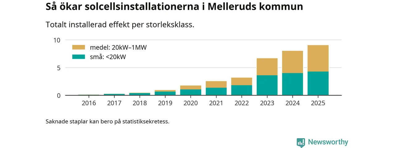 Under 2025 anslöts ett megawatt ny solel till elnätet i Melleruds kommun, en ökning med 13 procent jämfört med året innan.