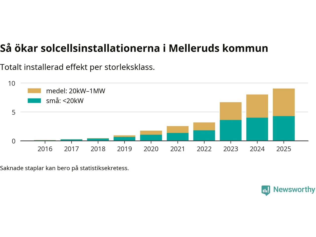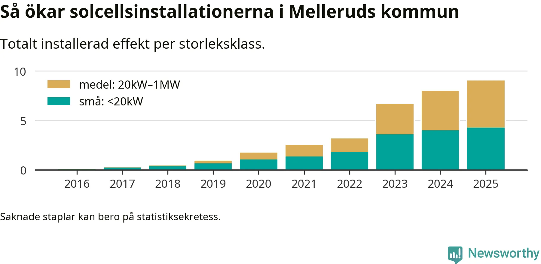 Det är framför allt de stora anläggningarna som driver tillväxten. Småskalig solel dominerar fortfarande produktionen – mer än hälften av effekten finns i anläggningar under 20 kilowatt – men det är bland de stora anläggningarna vi ser den största ökningstakten.