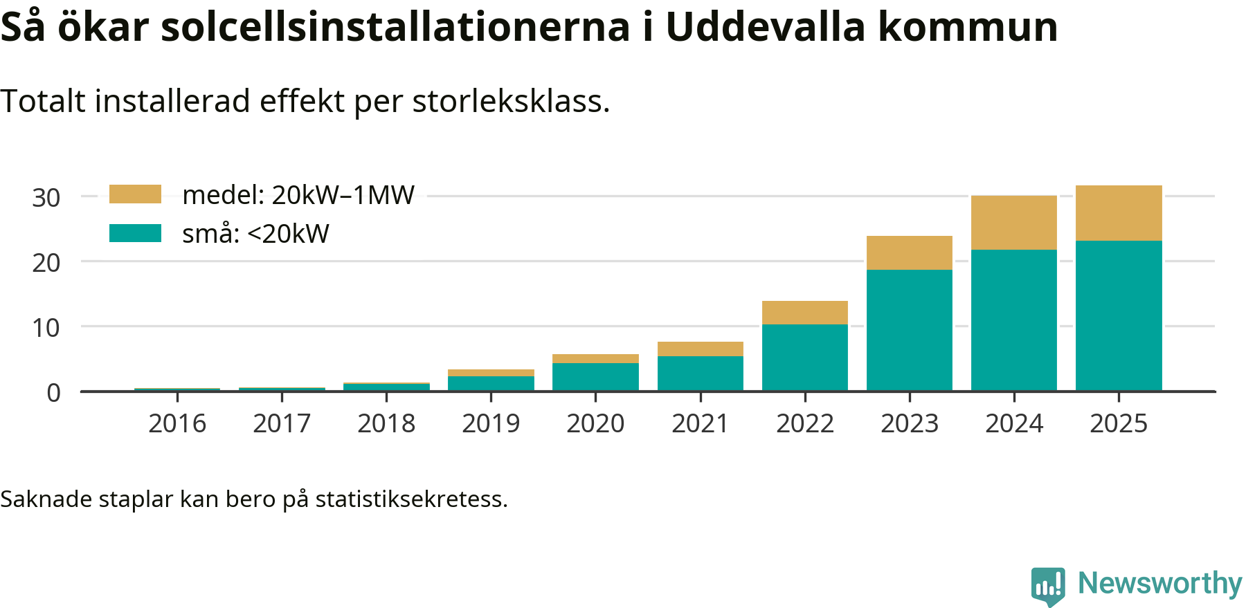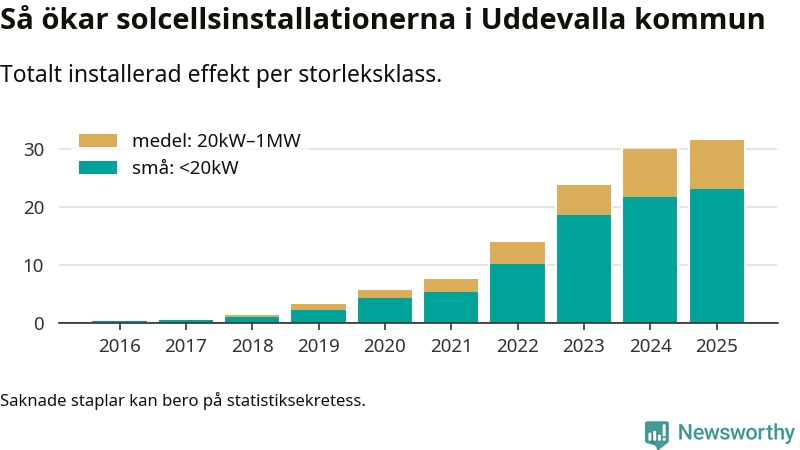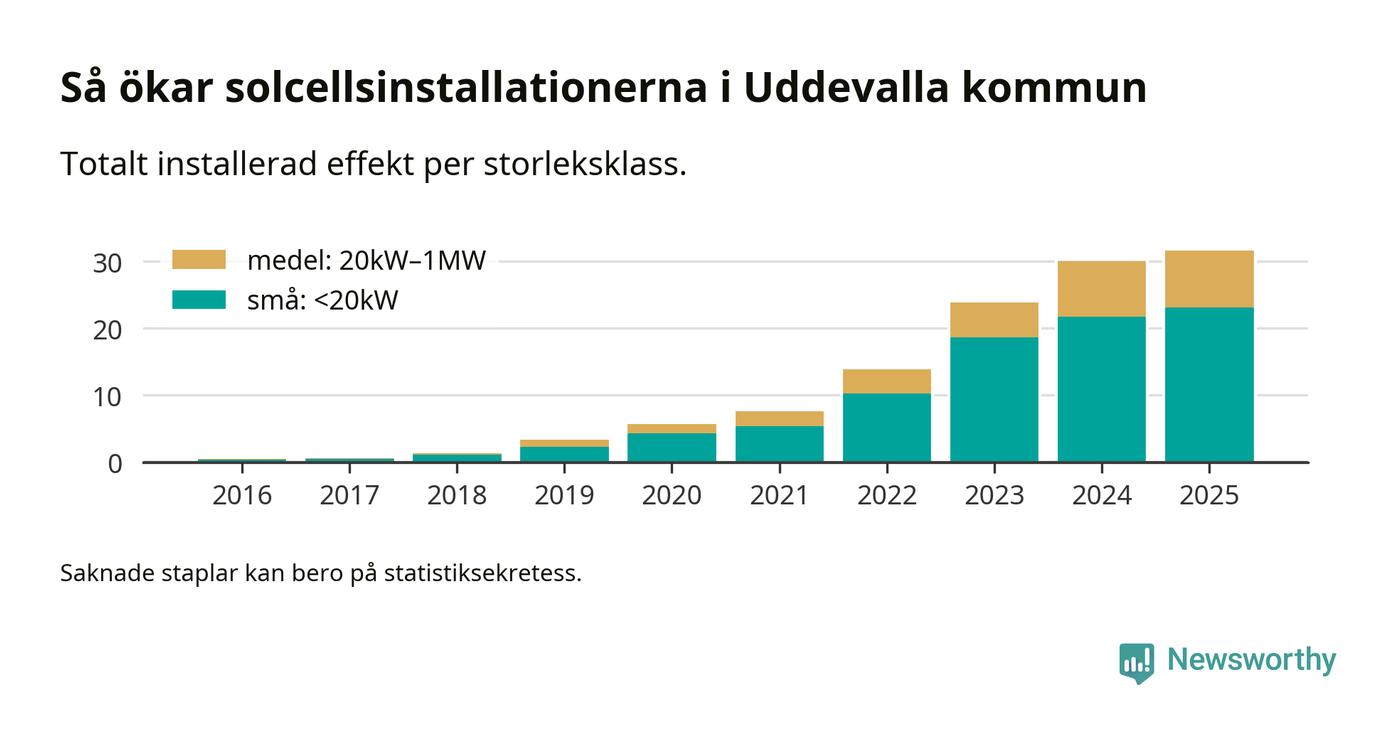 Totalt finns 2 261 nätanslutna anläggningar, om sammanlagt 31,6 megawatt i kommunen. Det motsvarar, i runda tal, en elproduktion på någonstans mellan 15 och 18 procent av vad hushållen i Uddevalla förbrukar per år.1