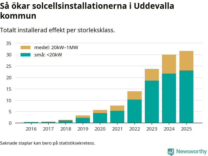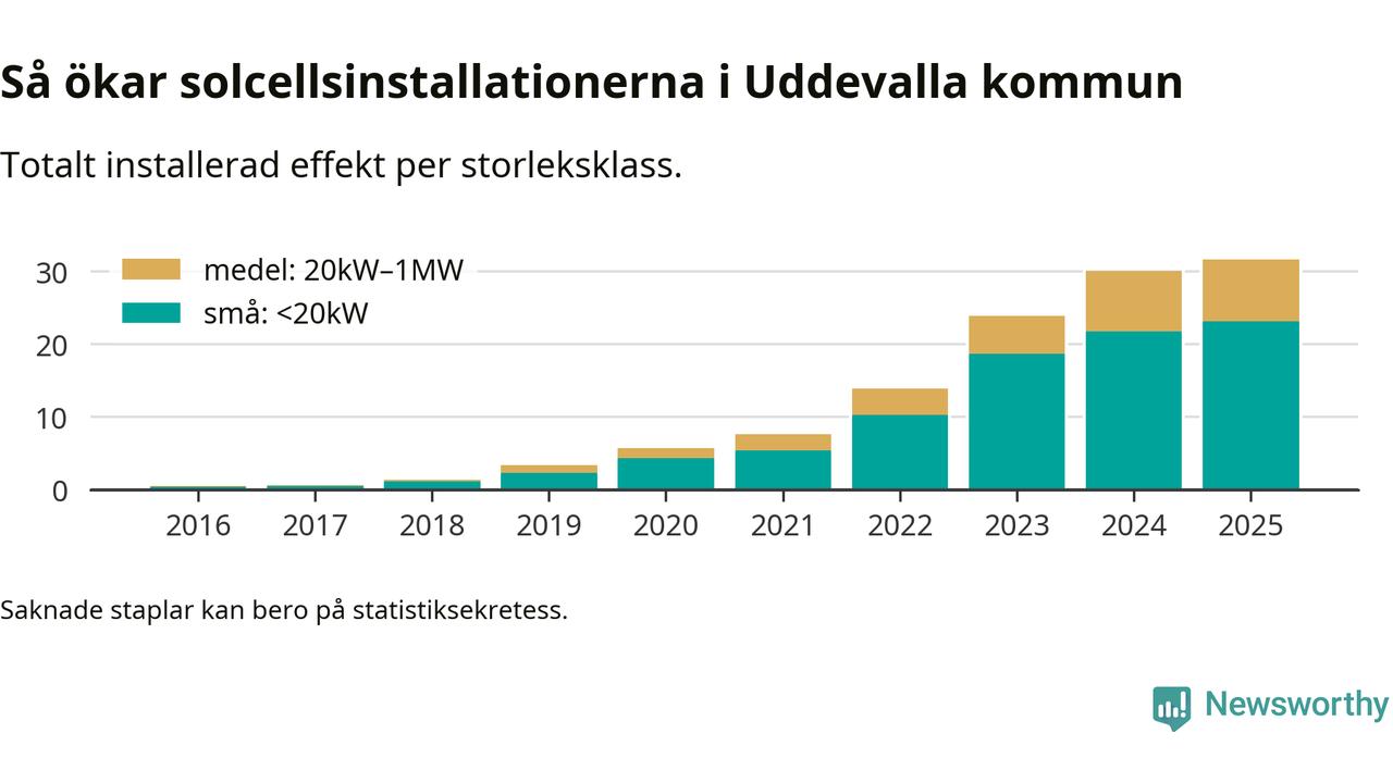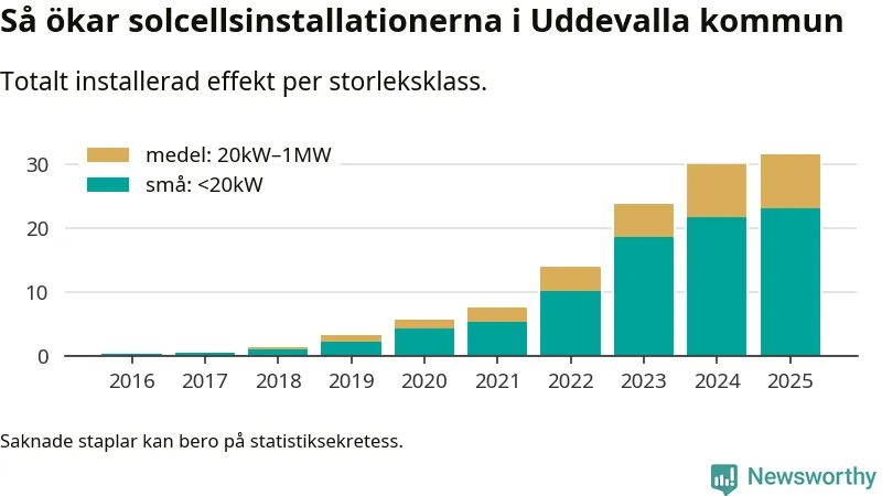 Den största delen av solelen i Uddevalla, 73 procent, kommer från småskaliga anläggningar, totalt 2 093 stycken. Det påminner om hur det ser ut i riket som helhet. I hela Sverige står anläggningar under 20 kilowatt för mer än hälften av den installerade effekten. Generellt är deras andel störst i kommuner med många villahushåll, medan större anläggningar dominerar i tätbefolkade kommuner med fler flerfamiljsbostäder – och förstås i de småkommuner som har någon av landets stora markanläggningar för solel.