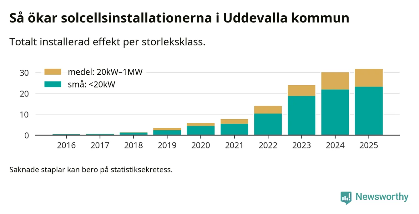 Antalet solcellsinstallationer i Sverige ökar, men i Uddevalla kommun var utbyggnadstakten under 2025 mindre än i riket i stort. Det visar ny statistik från Energimyndigheten.