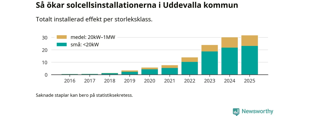 Under 2025 anslöts 1,6 megawatt ny solel till elnätet i Uddevalla kommun, en ökning med 5 procent jämfört med året innan.
