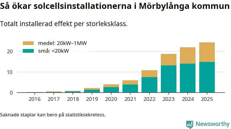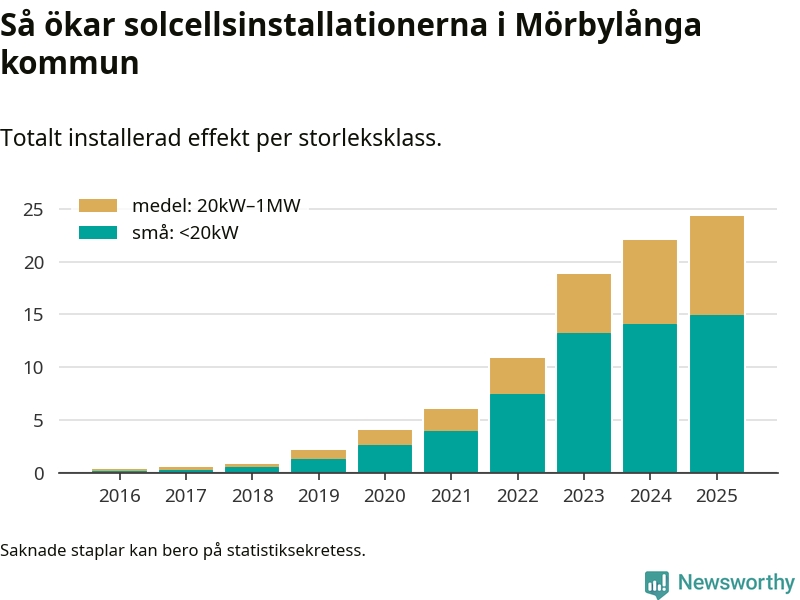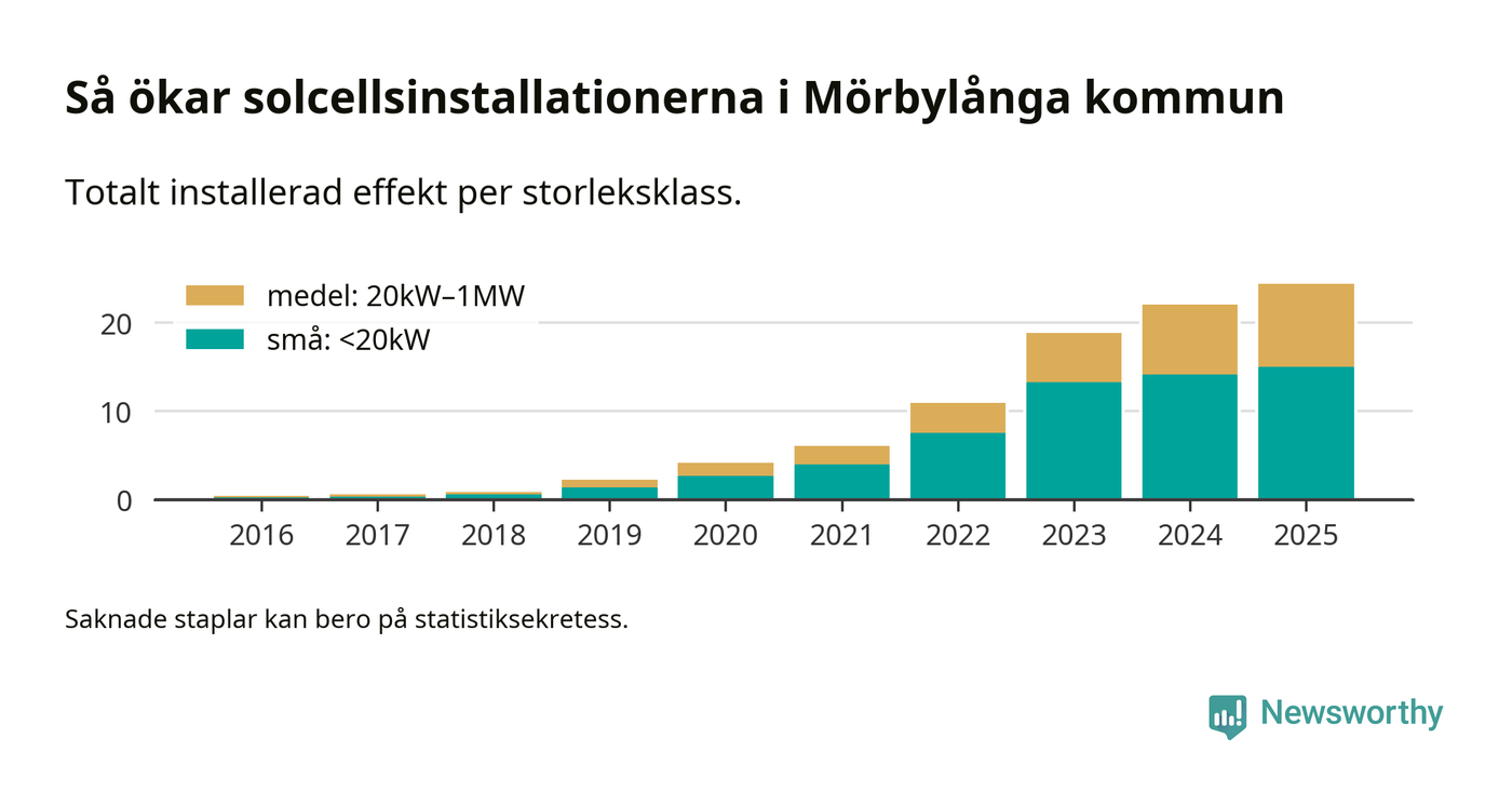 Det är framför allt de stora anläggningarna som driver tillväxten. Småskalig solel dominerar fortfarande produktionen – mer än hälften av effekten finns i anläggningar under 20 kilowatt – men det är bland de stora anläggningarna vi ser den största ökningstakten.