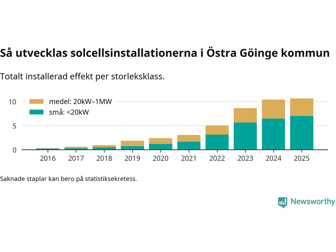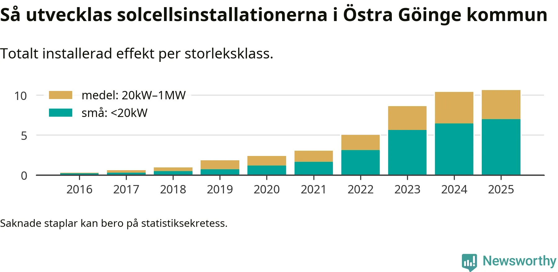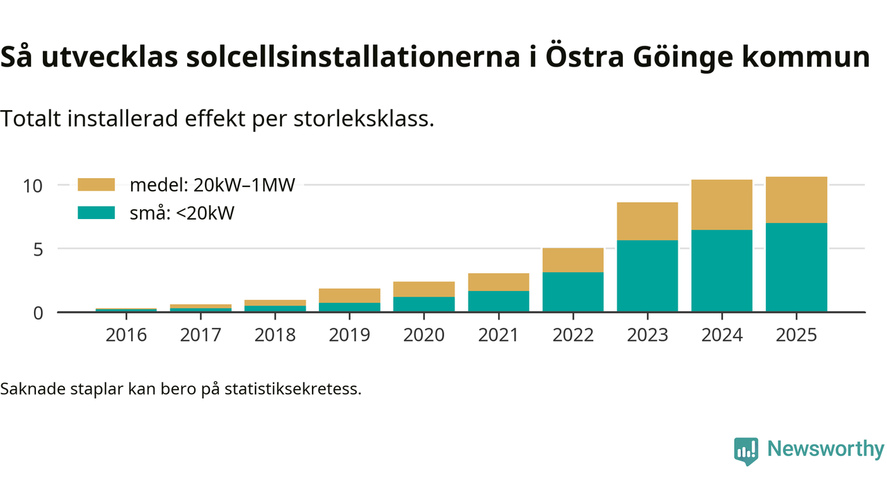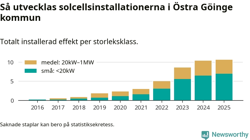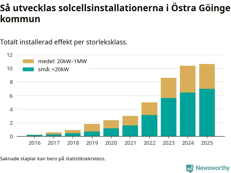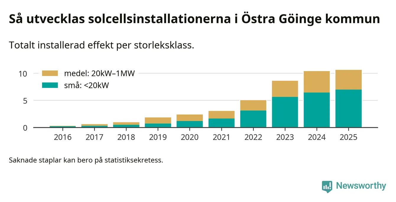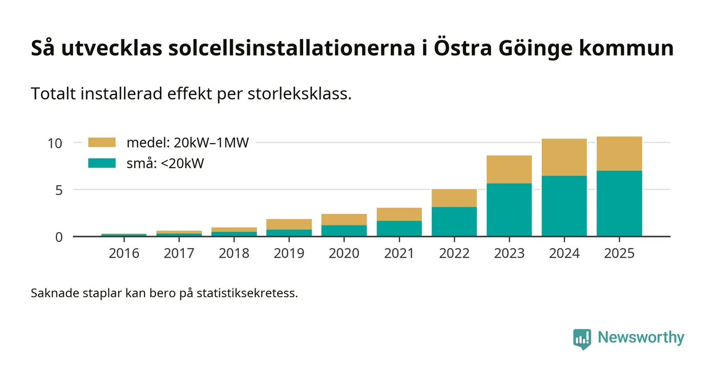 Det är framför allt de stora anläggningarna som driver tillväxten. Småskalig solel dominerar fortfarande produktionen – mer än hälften av effekten finns i anläggningar under 20 kilowatt – men det är bland de stora anläggningarna vi ser den största ökningstakten.