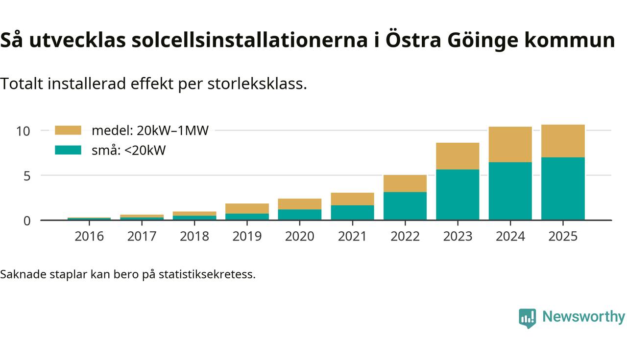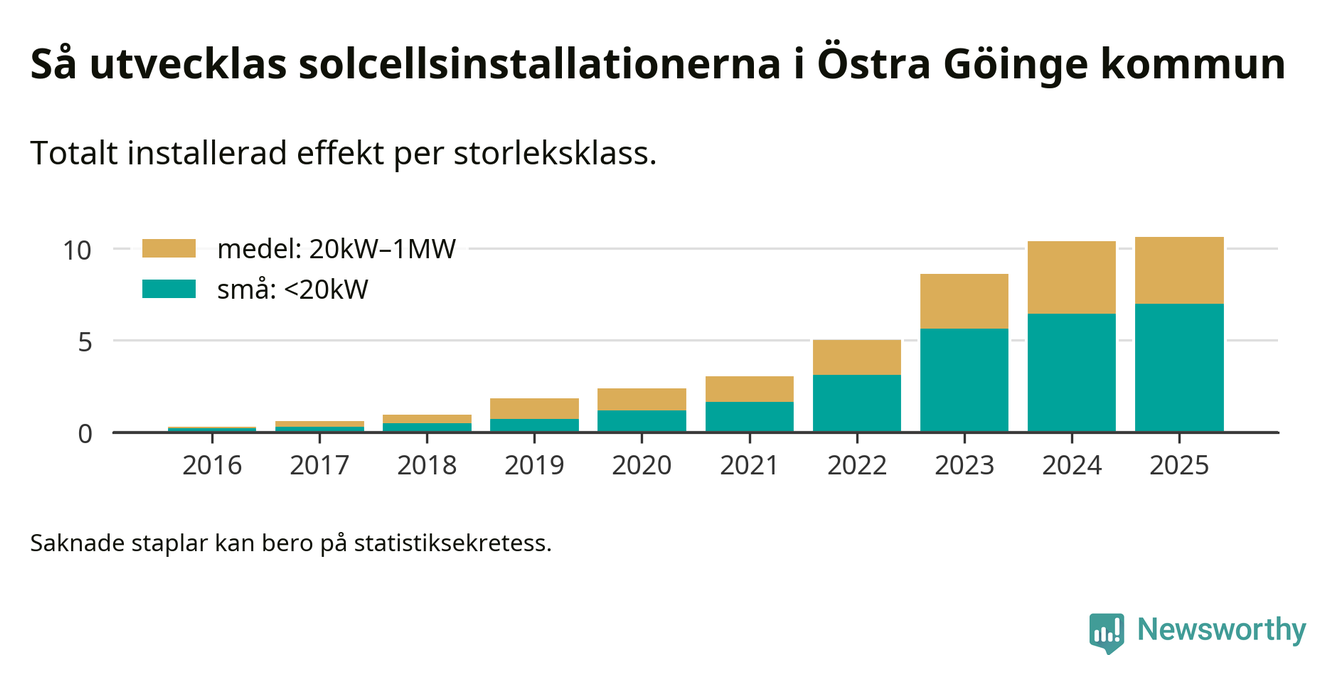 Totalt finns 723 nätanslutna anläggningar, om sammanlagt 10,6 megawatt i kommunen. Det motsvarar, i runda tal, en elproduktion på någonstans mellan 19 och 20 procent av vad hushållen i Östra Göinge förbrukar per år.1