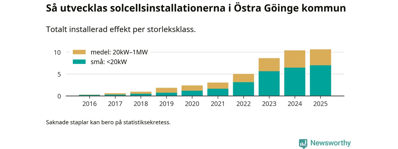 Under 2025 anslöts 220 kilowatt ny solel till elnätet i Östra Göinge kommun, en ökning med 2 procent jämfört med året innan.