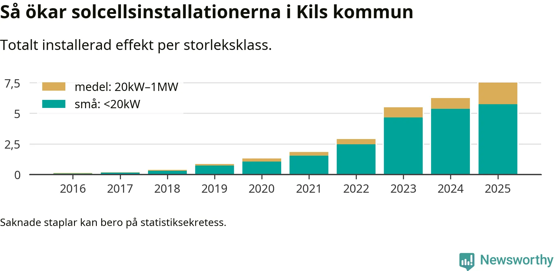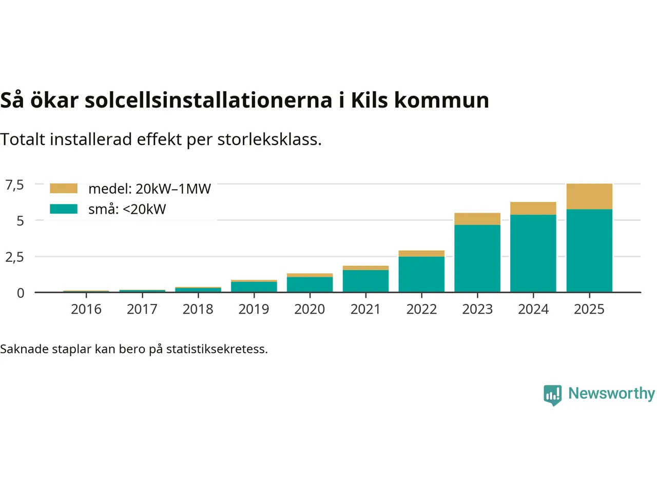 Under 2025 anslöts 1,3 megawatt ny solel till elnätet i Kils kommun, en ökning med 21 procent jämfört med året innan.