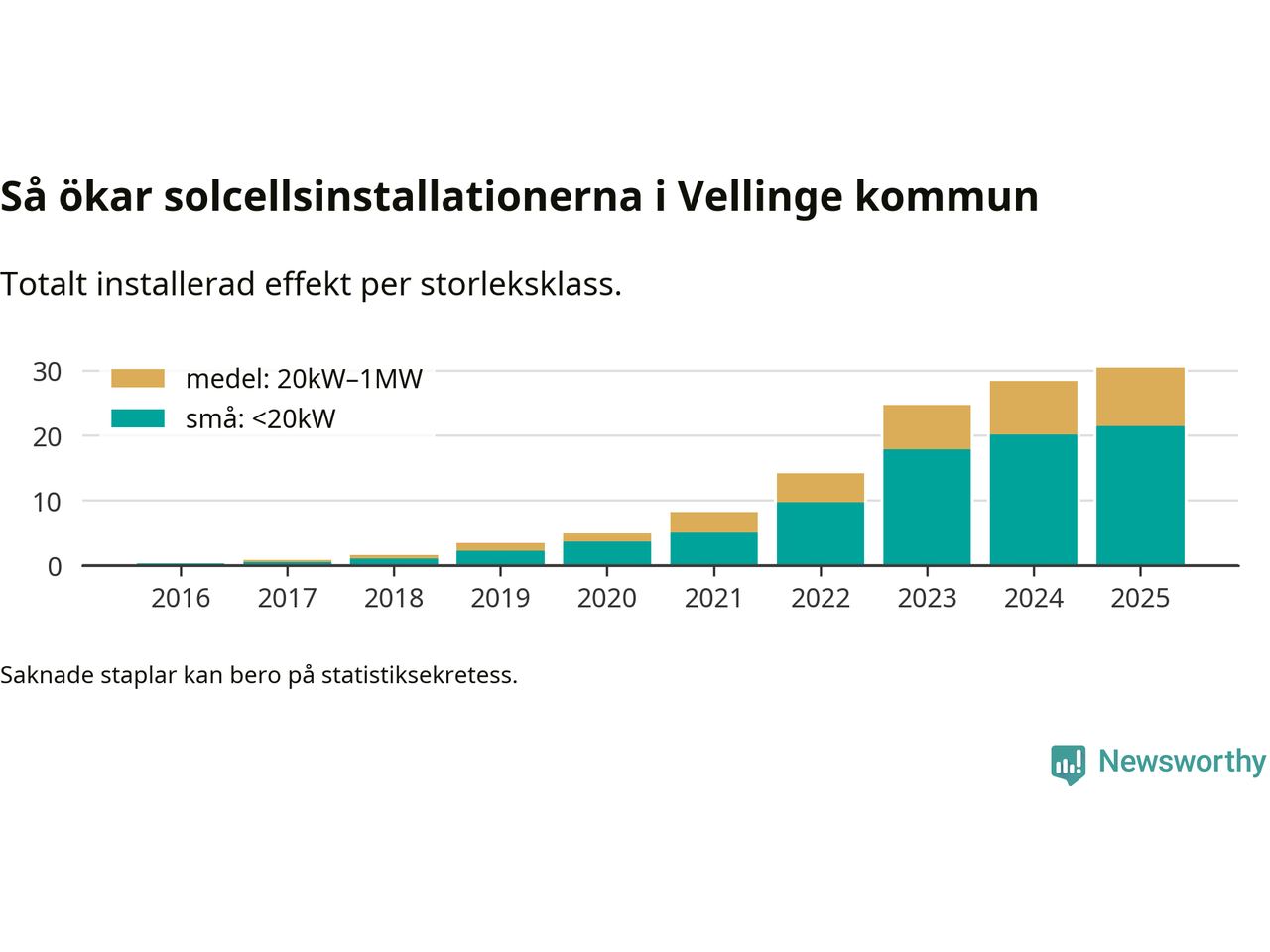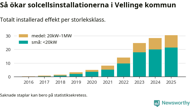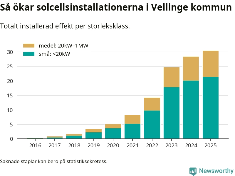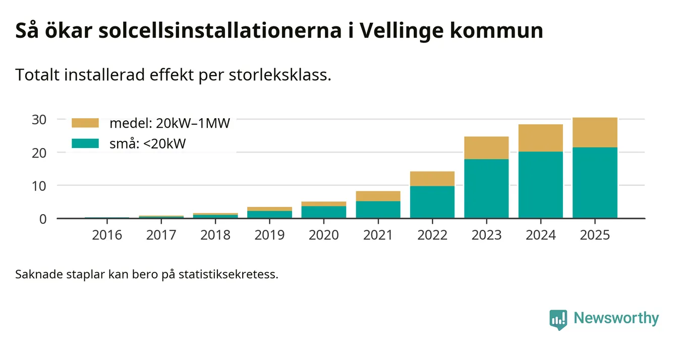 Det är framför allt de stora anläggningarna som driver tillväxten. Småskalig solel dominerar fortfarande produktionen – mer än hälften av effekten finns i anläggningar under 20 kilowatt – men det är bland de stora anläggningarna vi ser den största ökningstakten.