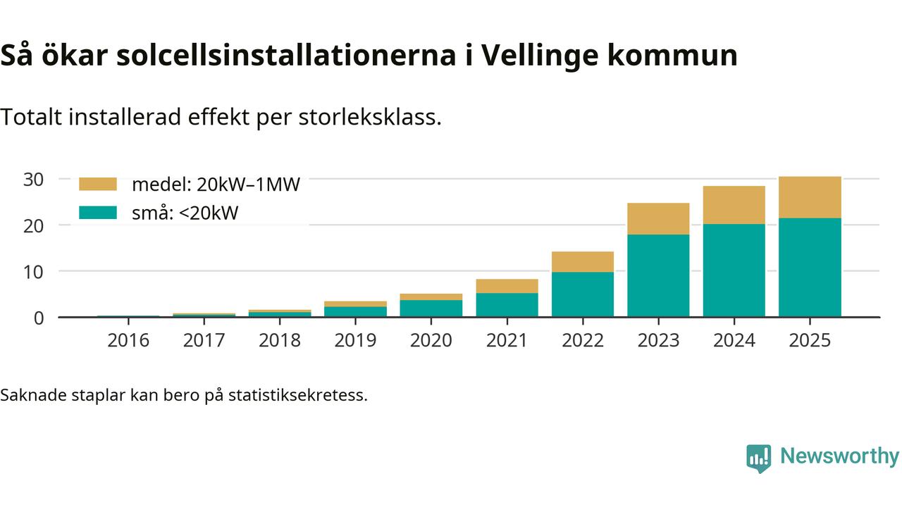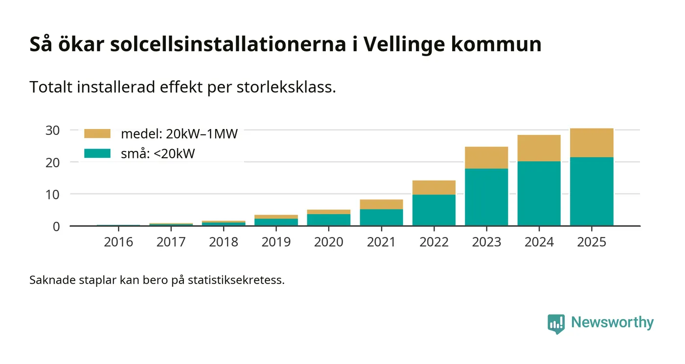 Under 2025 anslöts två megawatt ny solel till elnätet i Vellinge kommun, en ökning med 7 procent jämfört med året innan.