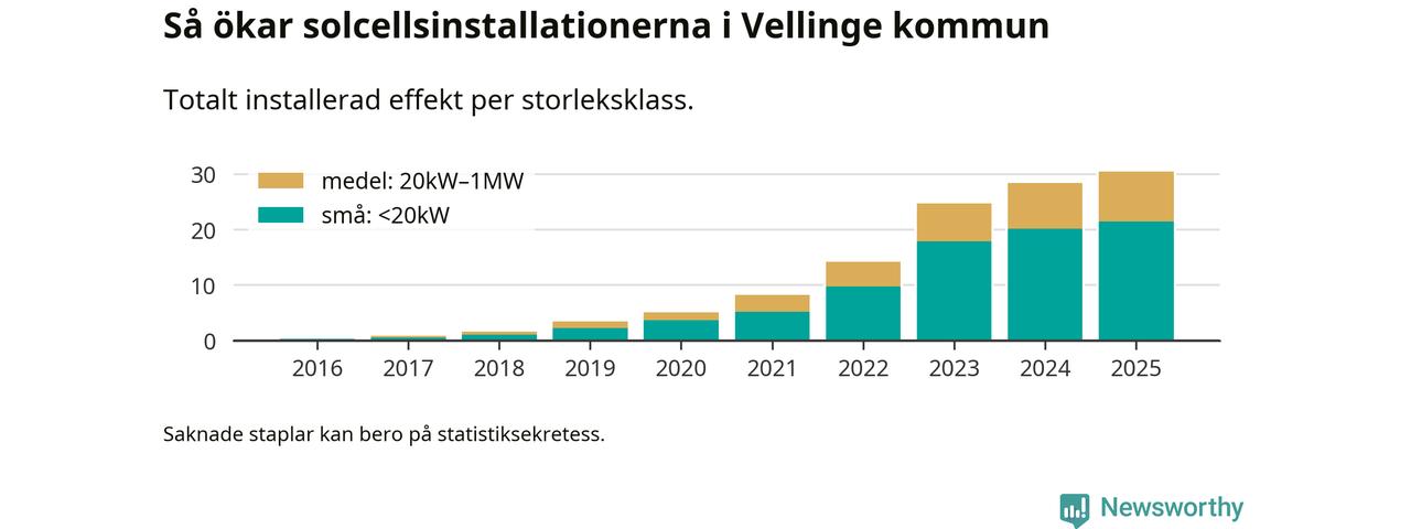 Den största delen av solelen i Vellinge, 70 procent, kommer från småskaliga anläggningar, totalt 1 916 stycken. Det påminner om hur det ser ut i riket som helhet. I hela Sverige står anläggningar under 20 kilowatt för mer än hälften av den installerade effekten. Generellt är deras andel störst i kommuner med många villahushåll, medan större anläggningar dominerar i tätbefolkade kommuner med fler flerfamiljsbostäder – och förstås i de småkommuner som har någon av landets stora markanläggningar för solel.