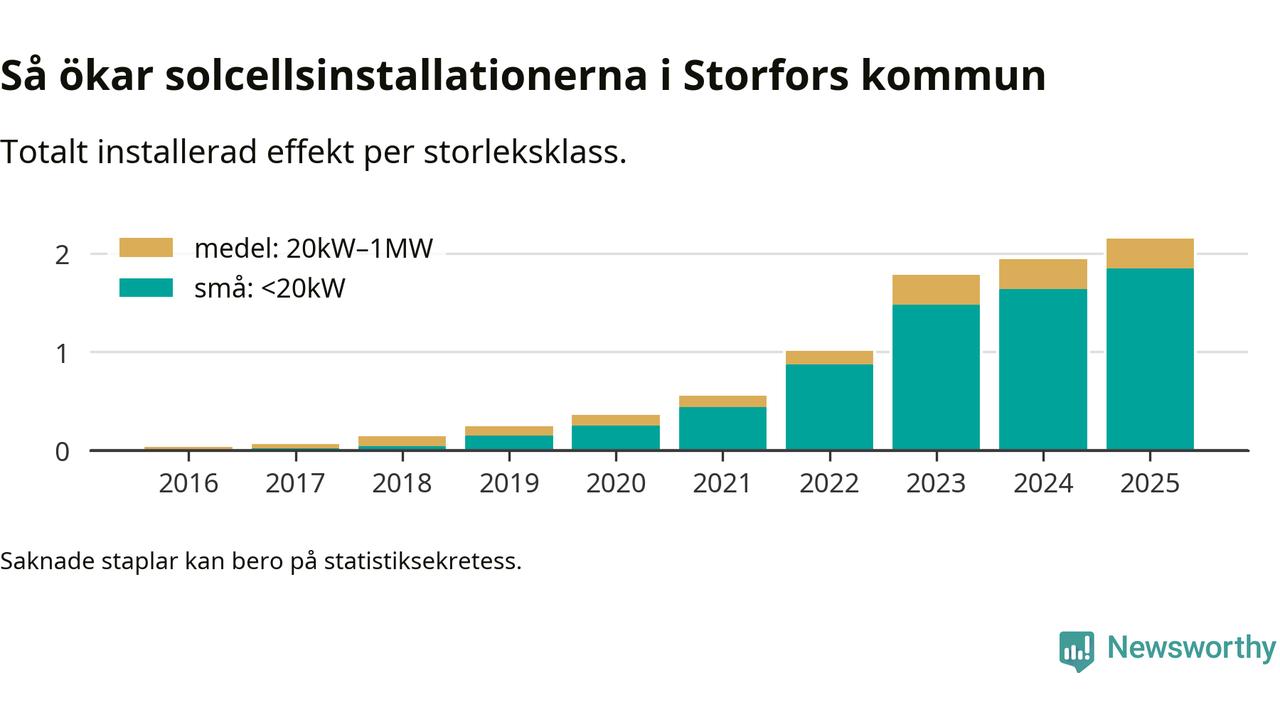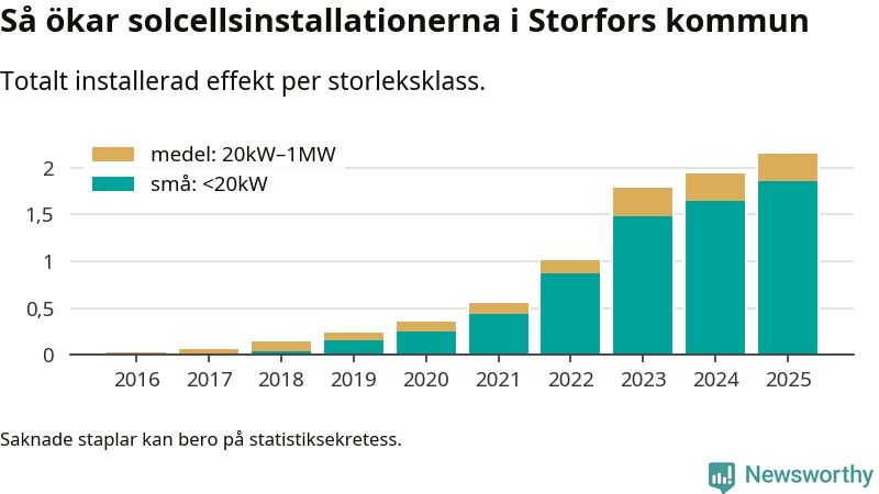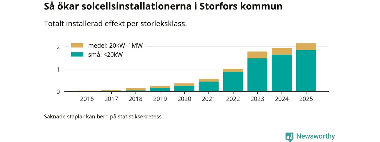Under 2025 anslöts 210 kilowatt ny solel till elnätet i Storfors kommun, en ökning med 11 procent jämfört med året innan.