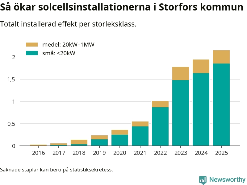 Den största delen av solelen i Storfors, 86 procent, kommer från småskaliga anläggningar, totalt 177 stycken. Det påminner om hur det ser ut i riket som helhet. I hela Sverige står anläggningar under 20 kilowatt för mer än hälften av den installerade effekten. Generellt är deras andel störst i kommuner med många villahushåll, medan större anläggningar dominerar i tätbefolkade kommuner med fler flerfamiljsbostäder – och förstås i de småkommuner som har någon av landets stora markanläggningar för solel.