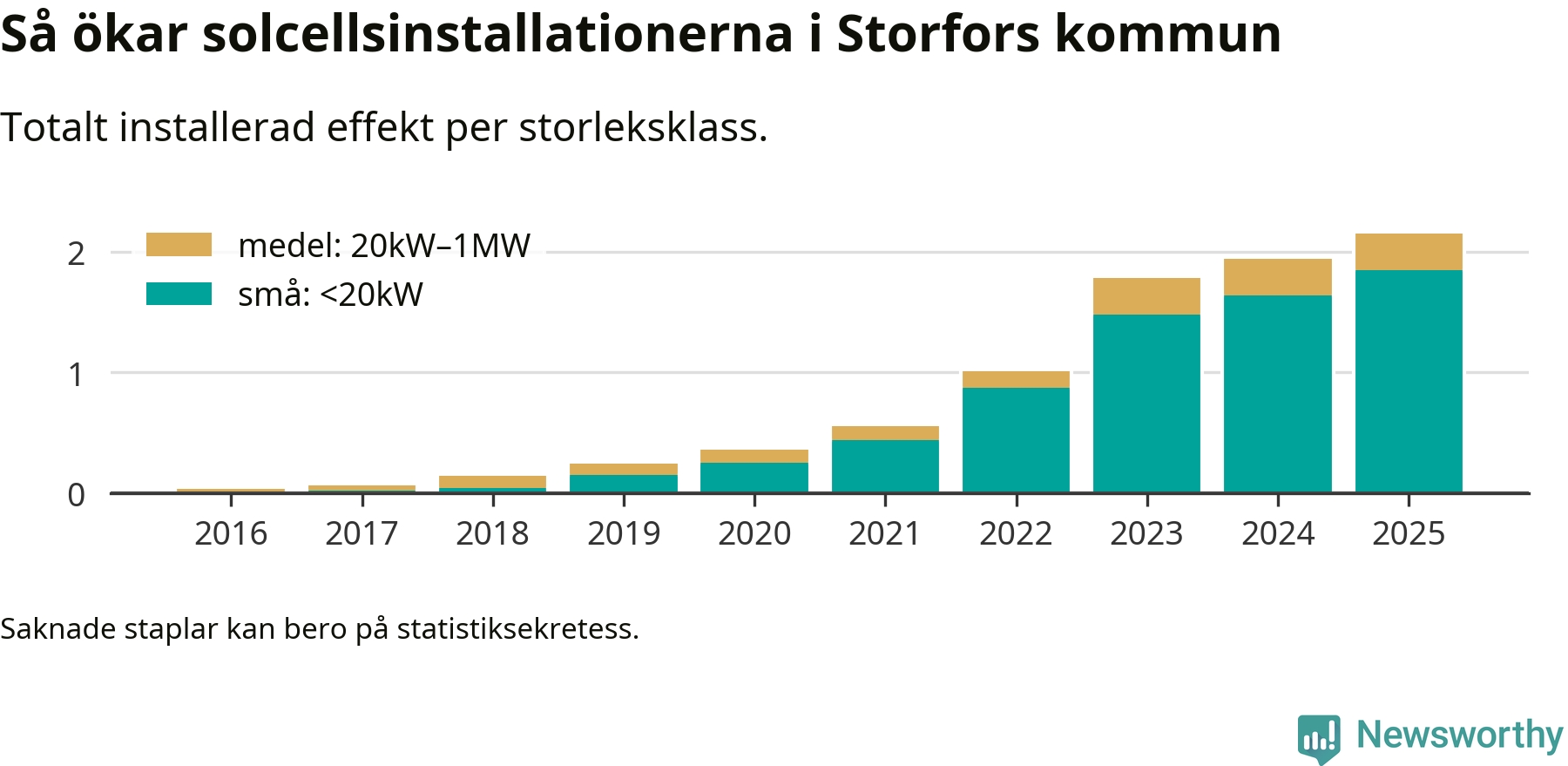 Det är framför allt de stora anläggningarna som driver tillväxten. Småskalig solel dominerar fortfarande produktionen – mer än hälften av effekten finns i anläggningar under 20 kilowatt – men det är bland de stora anläggningarna vi ser den största ökningstakten.