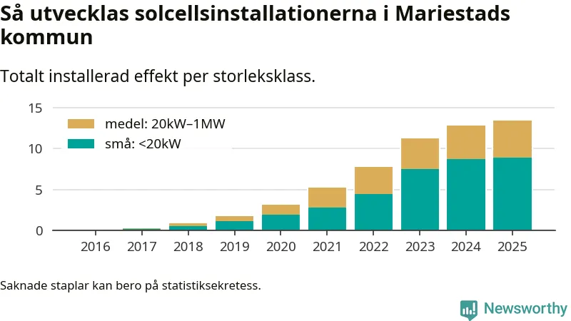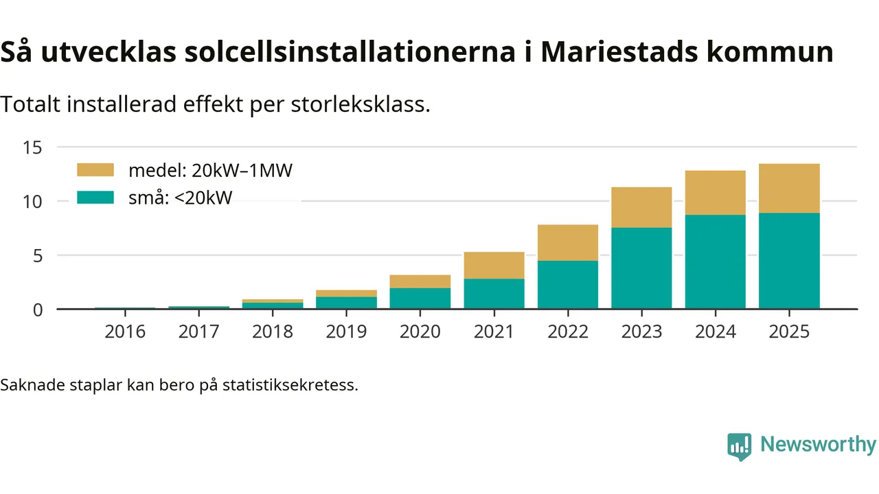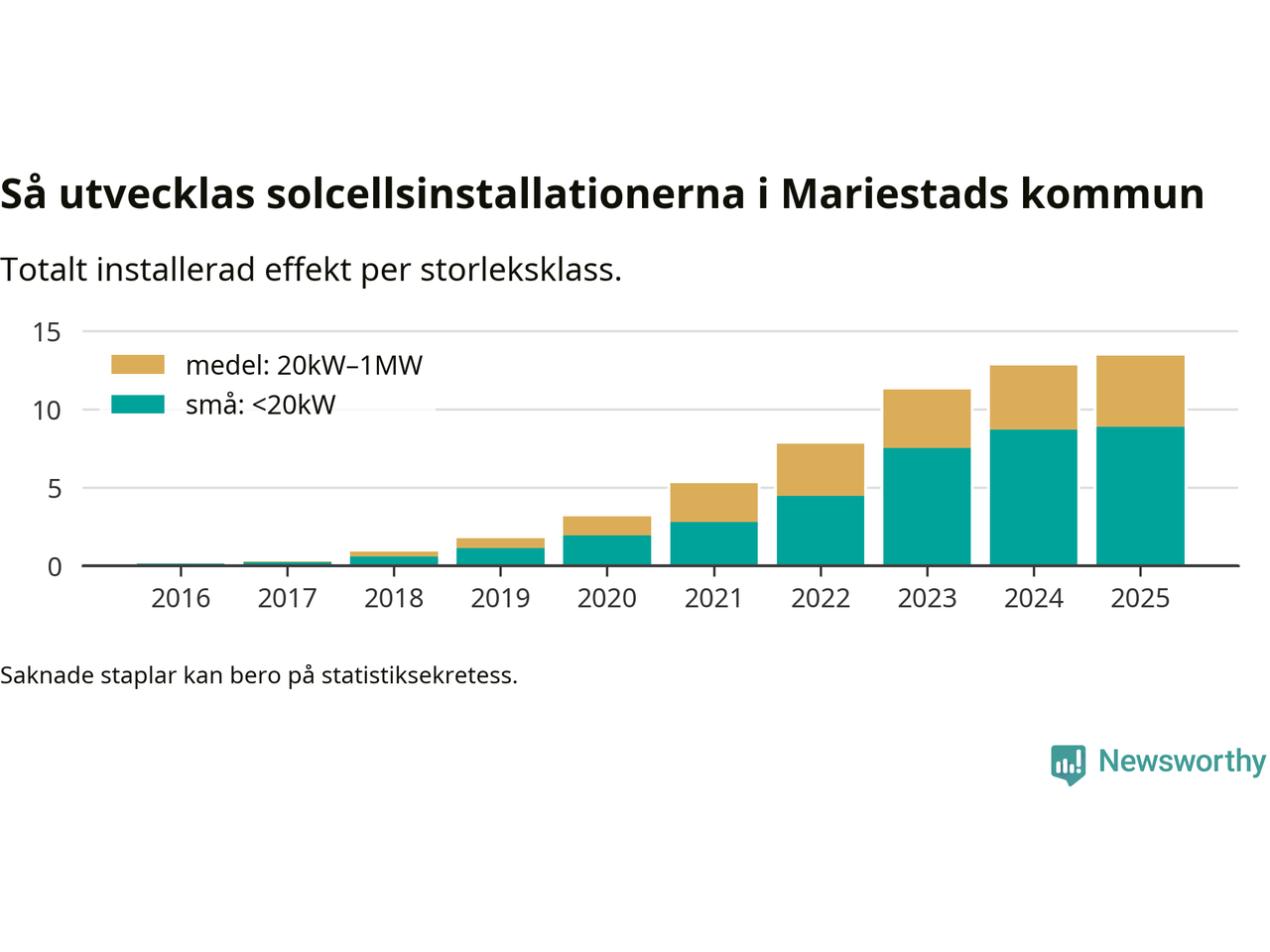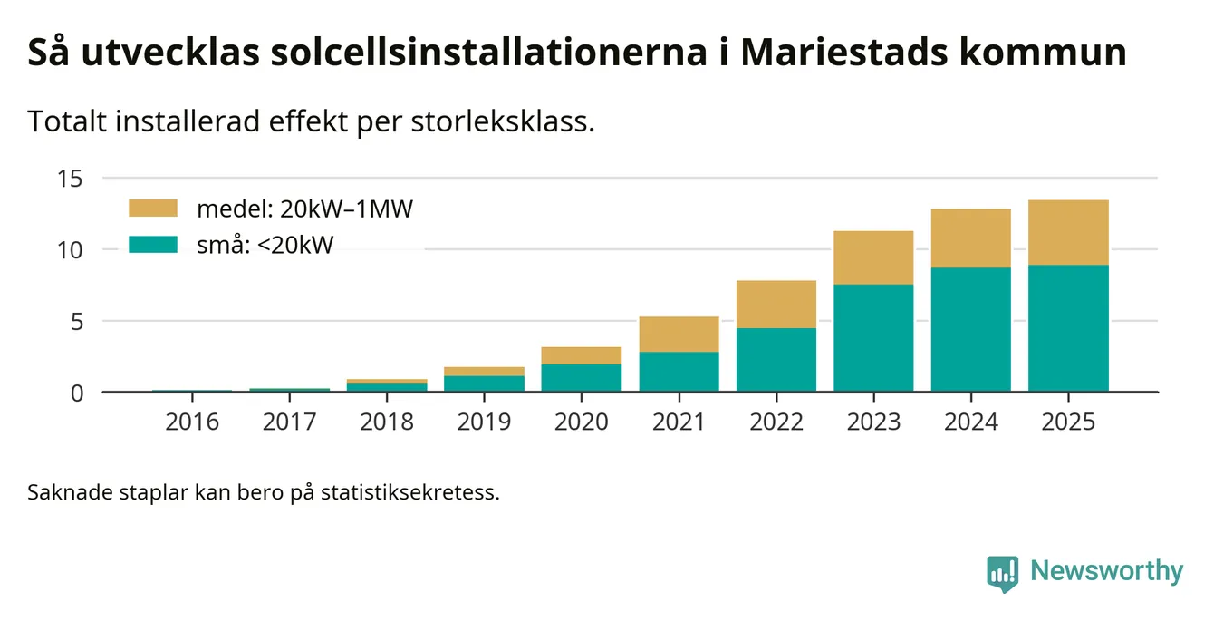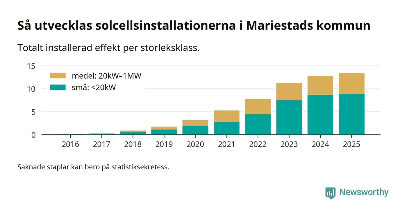 Under 2025 anslöts 0,6 megawatt ny solel till elnätet i Mariestads kommun, en ökning med 5 procent jämfört med året innan.