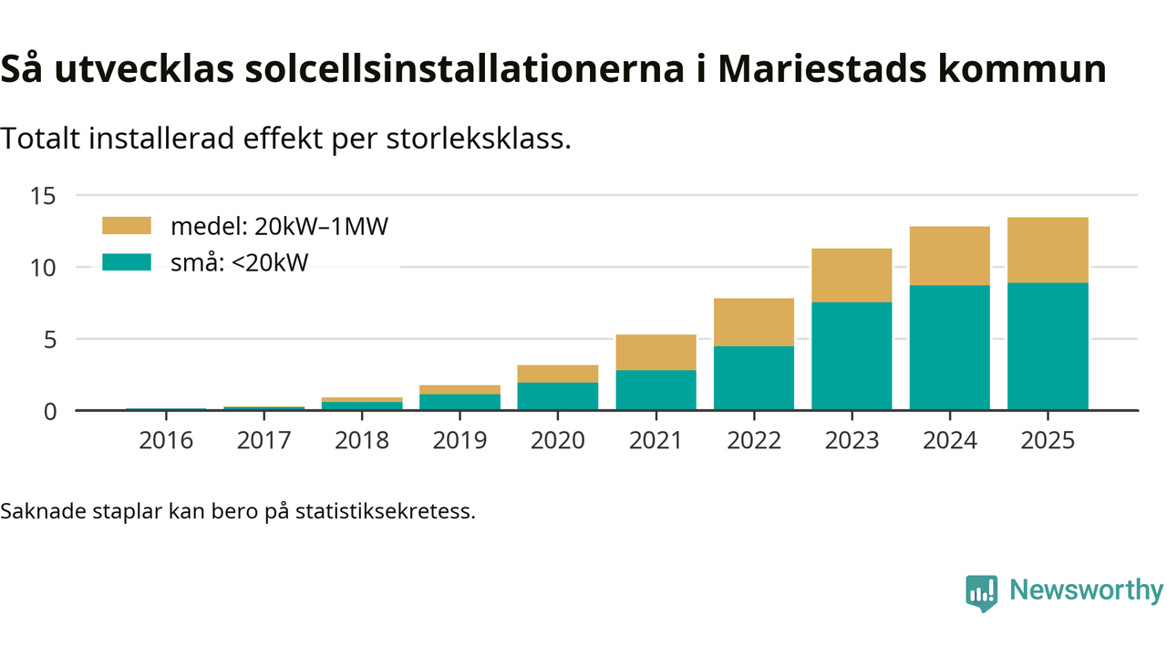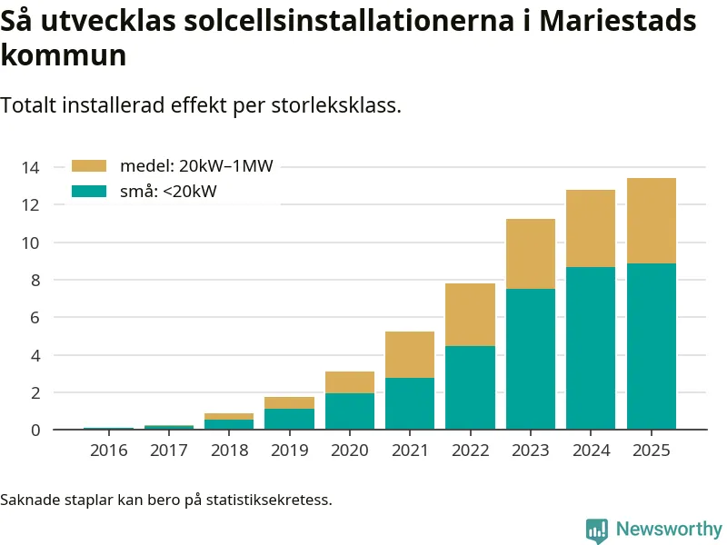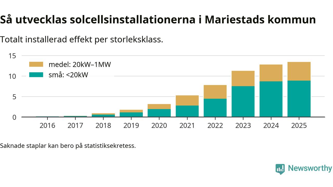 Den största delen av solelen i Mariestad, 66 procent, kommer från småskaliga anläggningar, totalt 809 stycken. Det påminner om hur det ser ut i riket som helhet. I hela Sverige står anläggningar under 20 kilowatt för mer än hälften av den installerade effekten. Generellt är deras andel störst i kommuner med många villahushåll, medan större anläggningar dominerar i tätbefolkade kommuner med fler flerfamiljsbostäder – och förstås i de småkommuner som har någon av landets stora markanläggningar för solel.