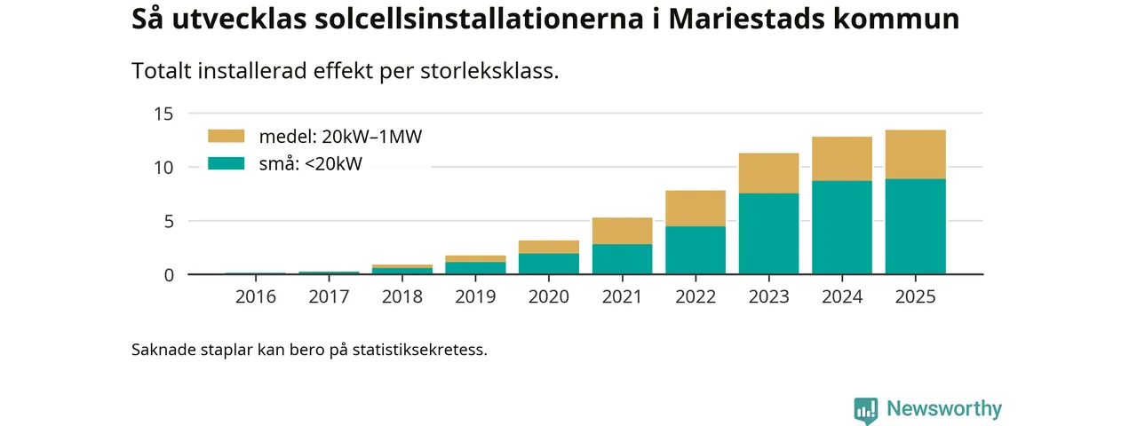 Antalet solcellsinstallationer i Sverige ökar, men Mariestads kommun hörde till de kommuner där utbyggnaden var som minst. Det visar ny statistik från Energimyndigheten.