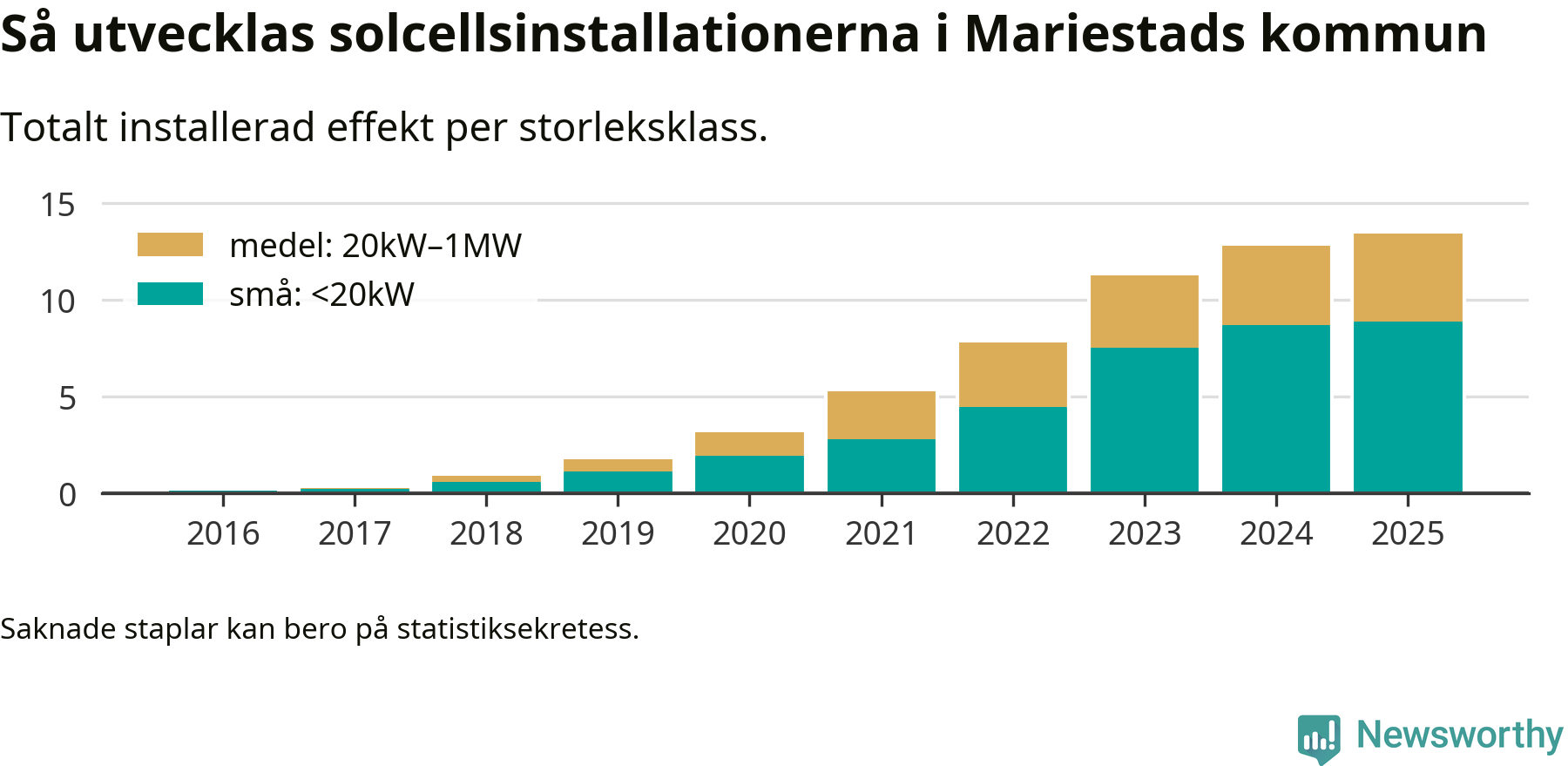 Totalt finns 892 nätanslutna anläggningar, om sammanlagt 13,4 megawatt i kommunen. Det motsvarar, i runda tal, en elproduktion på någonstans mellan 13 och 16 procent av vad hushållen i Mariestad förbrukar per år.1