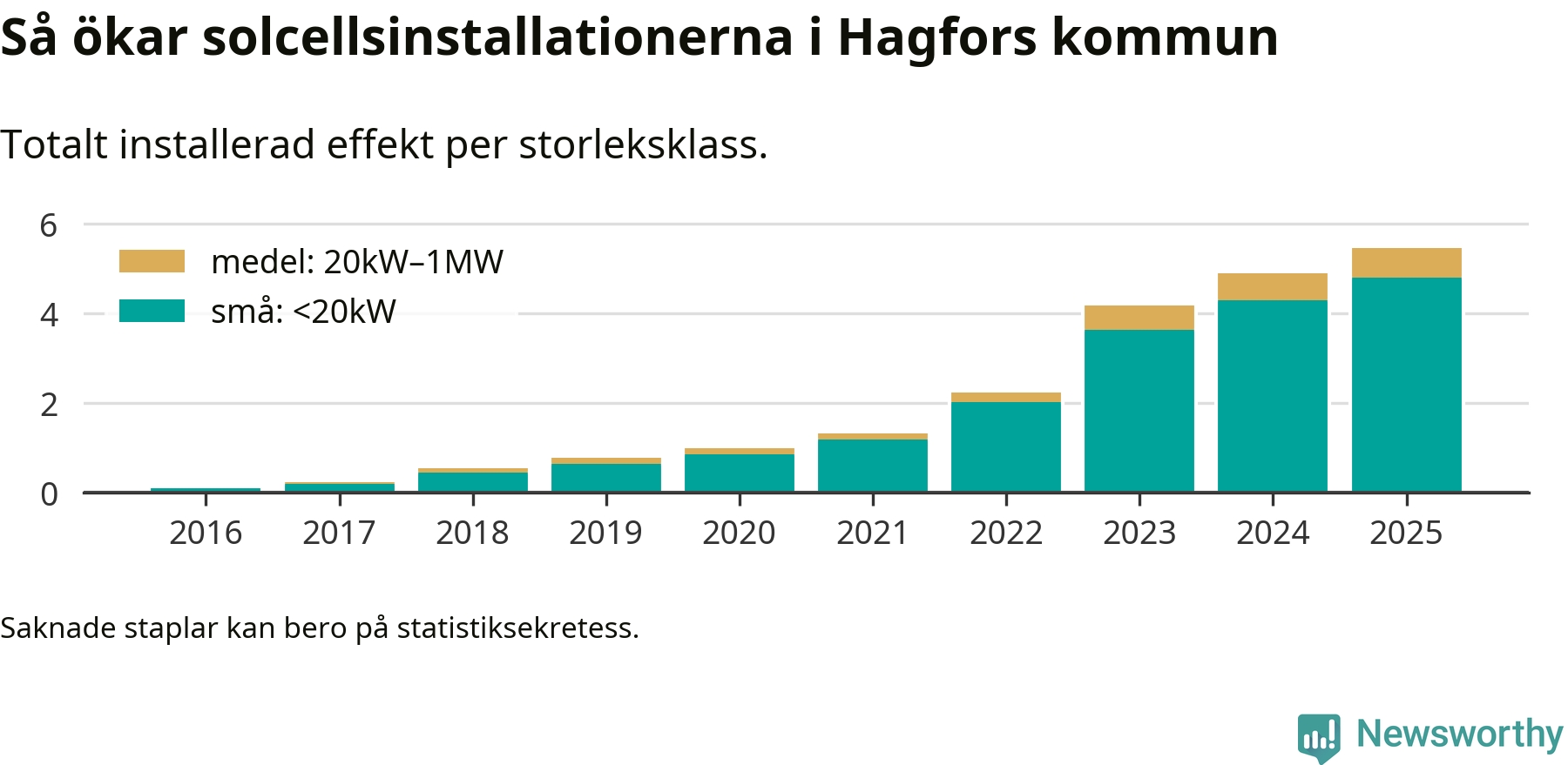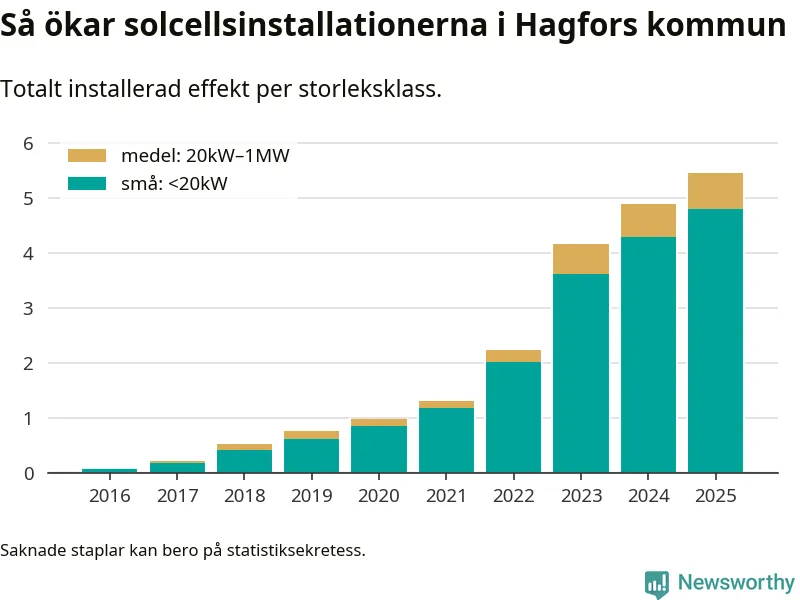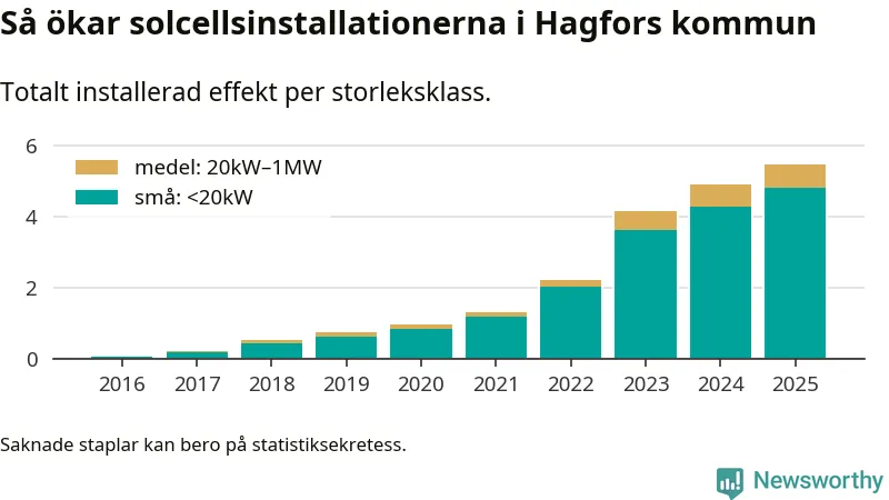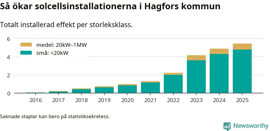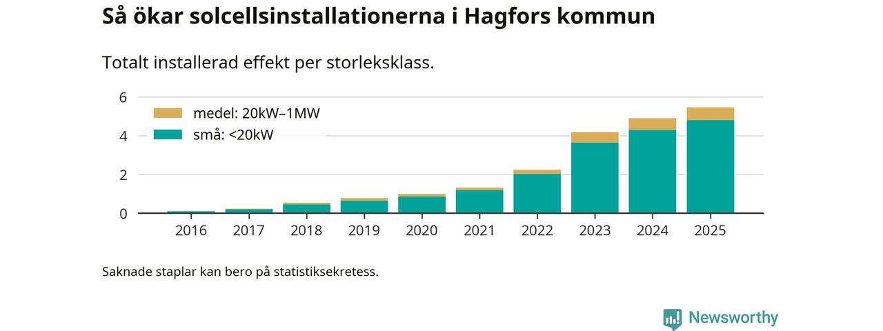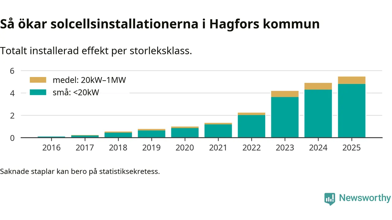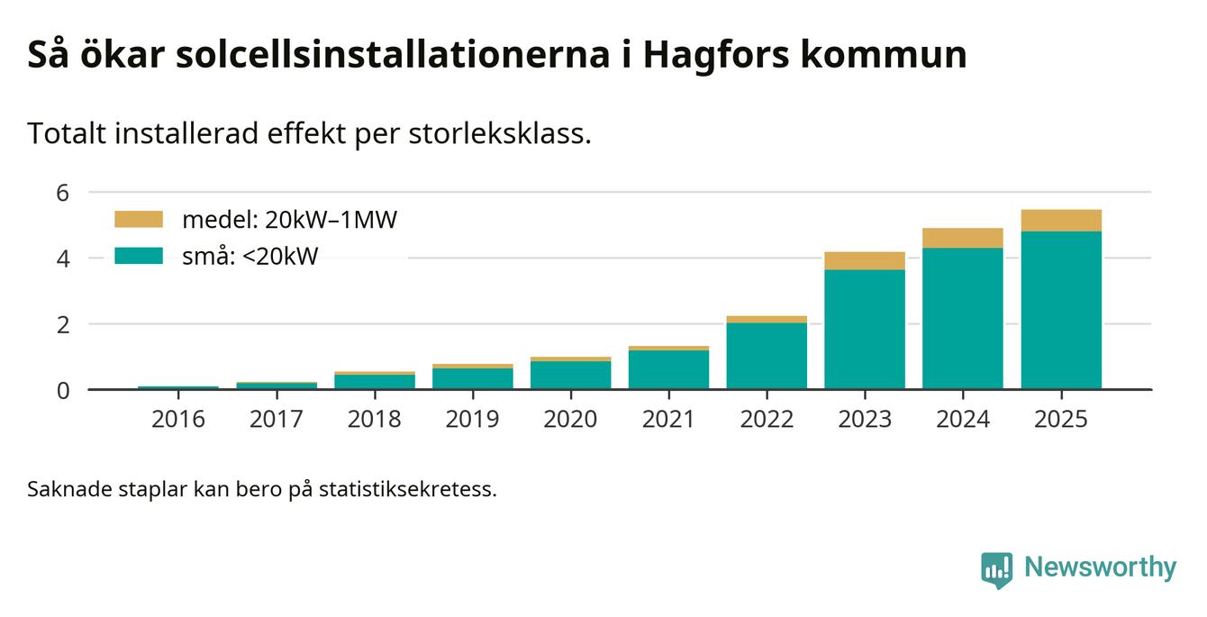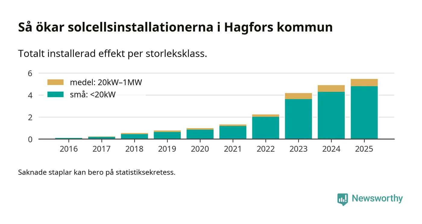 Under 2025 anslöts 0,6 megawatt ny solel till elnätet i Hagfors kommun, en ökning med 11 procent jämfört med året innan.