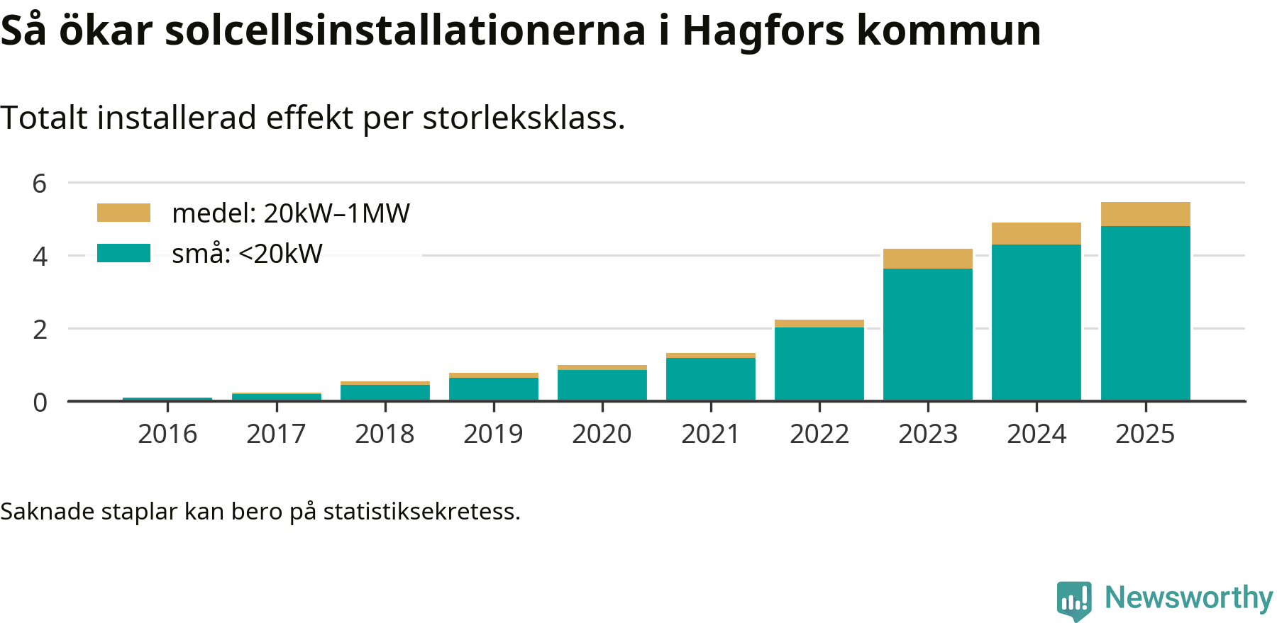Det är framför allt de stora anläggningarna som driver tillväxten. Småskalig solel dominerar fortfarande produktionen – mer än hälften av effekten finns i anläggningar under 20 kilowatt – men det är bland de stora anläggningarna vi ser den största ökningstakten.