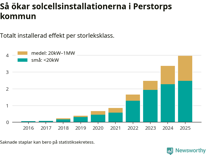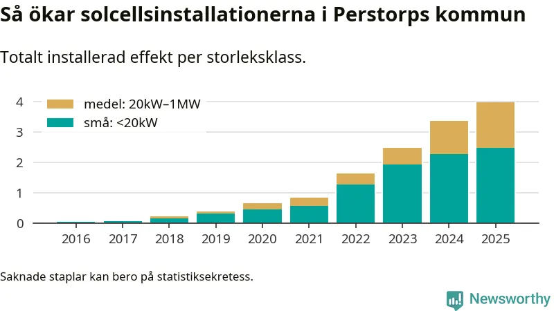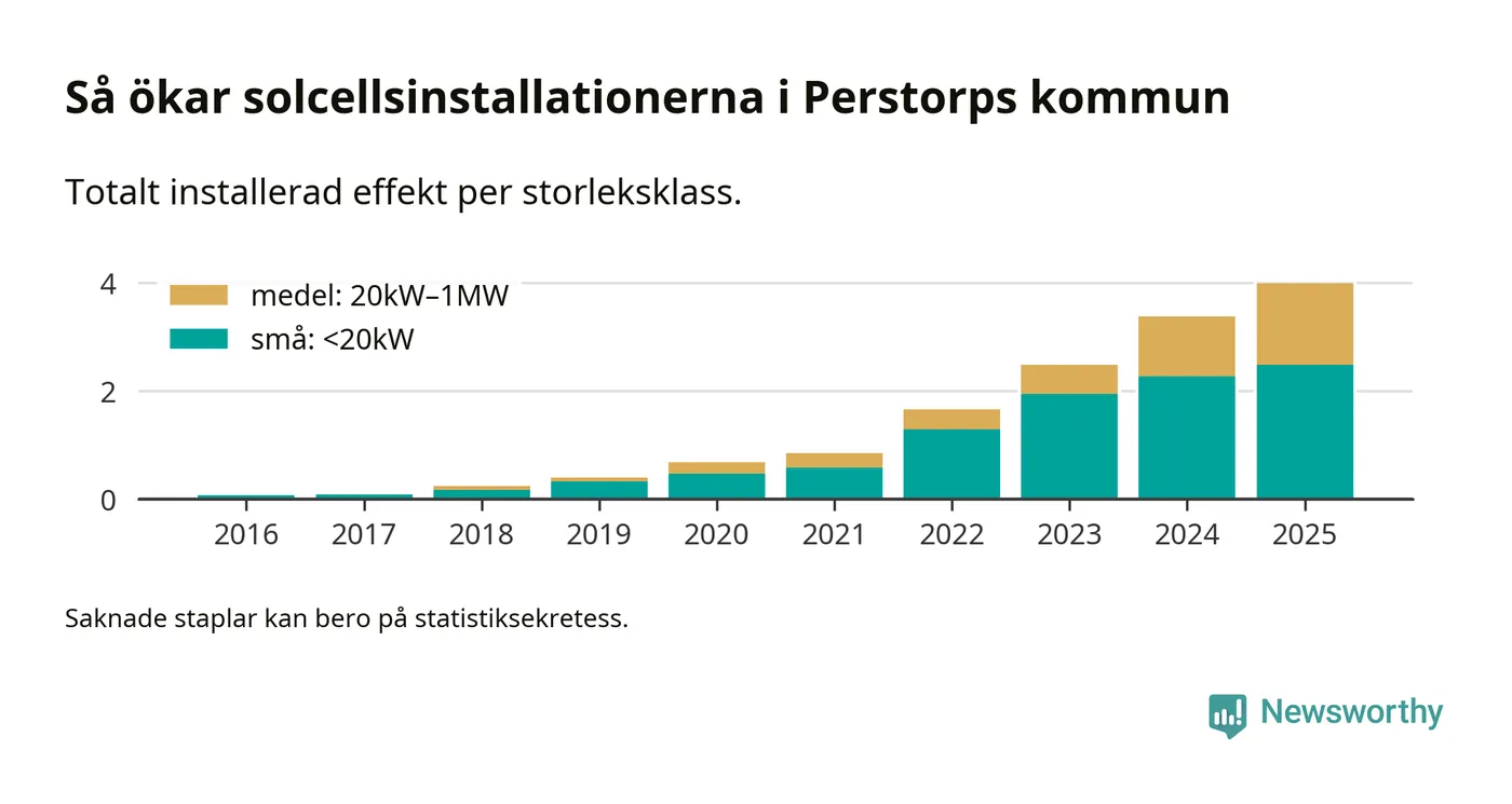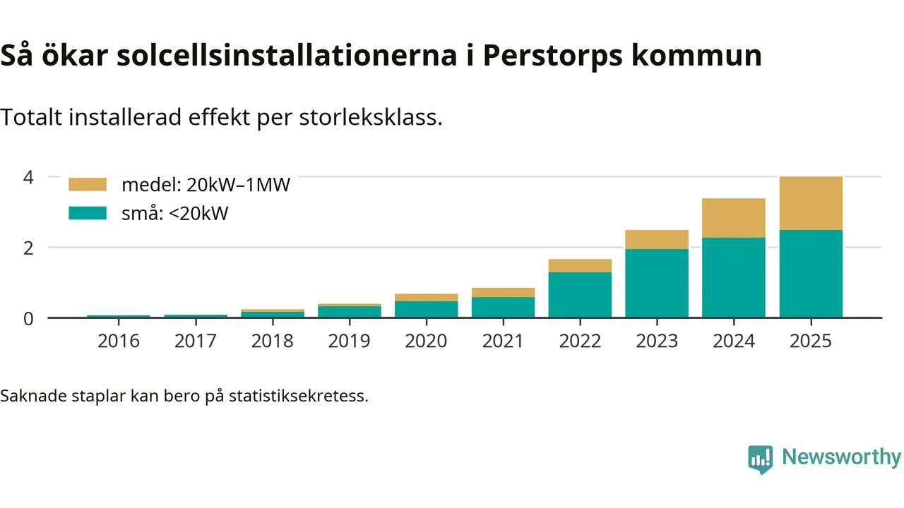 Under 2025 anslöts 0,6 megawatt ny solel till elnätet i Perstorps kommun, en ökning med 18 procent jämfört med året innan.