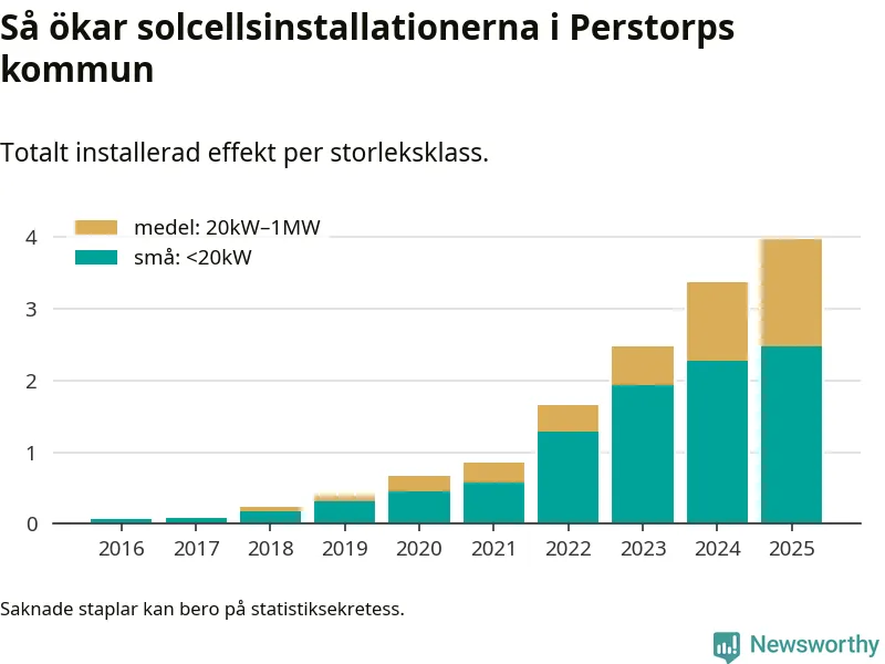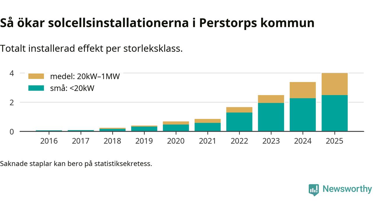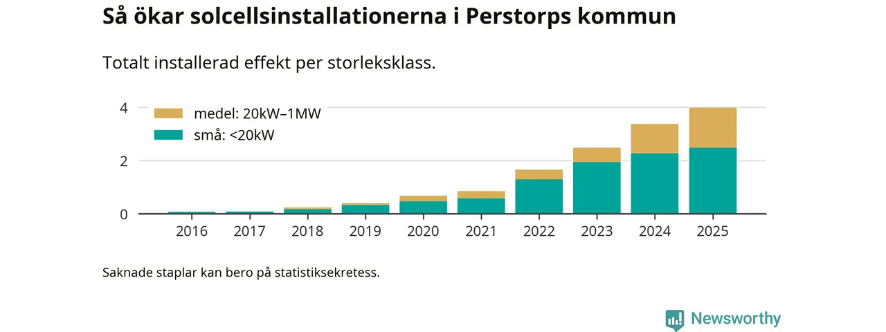 I Perstorps kommun ökade den installerade solelseffekten i fjol med 17,8 procent, vilket var ungefär som i riket som helhet. Det visar ny statistik från Energimyndigheten.