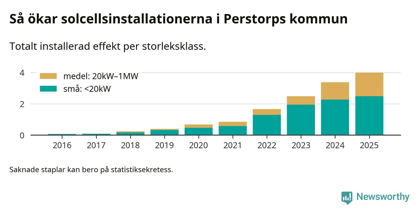 Den största delen av solelen i Perstorp, 62 procent, kommer från småskaliga anläggningar, totalt 235 stycken. Det påminner om hur det ser ut i riket som helhet. I hela Sverige står anläggningar under 20 kilowatt för mer än hälften av den installerade effekten. Generellt är deras andel störst i kommuner med många villahushåll, medan större anläggningar dominerar i tätbefolkade kommuner med fler flerfamiljsbostäder – och förstås i de småkommuner som har någon av landets stora markanläggningar för solel.